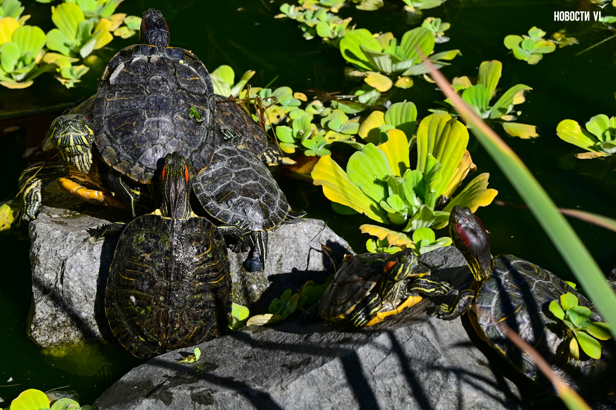Дети же тянутся к живности, которая здесь тоже водится. Курочки и голуби горделиво охраняют свою территорию, а кролики умиротворённо нежатся на ещё тёплом октябрьском солнышке. По обе стороны напротив лестницы, на которой есть фотография, кажется, у всех жителей Владивостока, плавают в тихой воде золотые рыбки и пытаются вылезти поближе к солнцу черепахи. Воздух прохладный, иногда поддувает крепкий ветер, но под солнцем горожане могут часами стоять и разглядывать пернатых, земноводных и рыб.