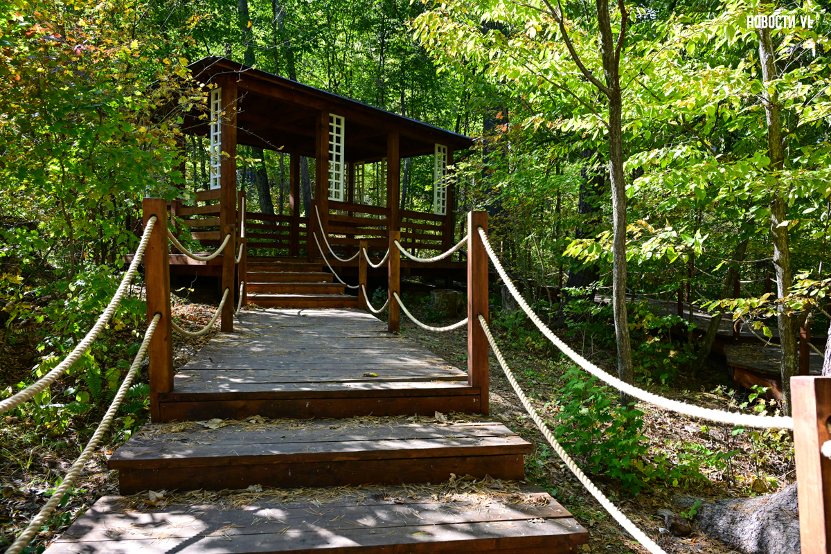 Обязательная часть программы – прогулка по экологическим тропам мимо дубов и клёнов. Осень пока едва тронула деревья – в основном их кроны ещё зелёные. Но среди бледной зелени ярко выделяются золотые листья, ещё ярче горят пока одиночные чуть красные клёны.