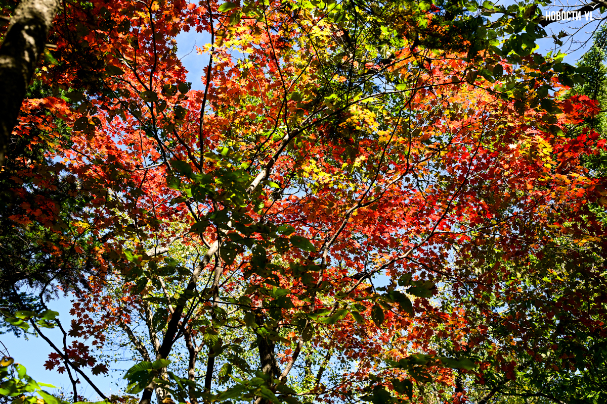 «В этом году тёплое лето прогрело море, тепло не уходит, и клёны не хотят становиться красными. Обычно, по нашим фенологическим наблюдениям, пик покраснения клёнов был примерно 7-10 октября. В этом году они ещё абсолютно зелёные, поэтому мы ждём снижения температур, особенно ночных. Клёны, я думаю, покраснеют не раньше чем через неделю», – объясняет кандидат биологических наук, научный сотрудник Ботанического сада Института ДВО РАН Ирина Крестова.
