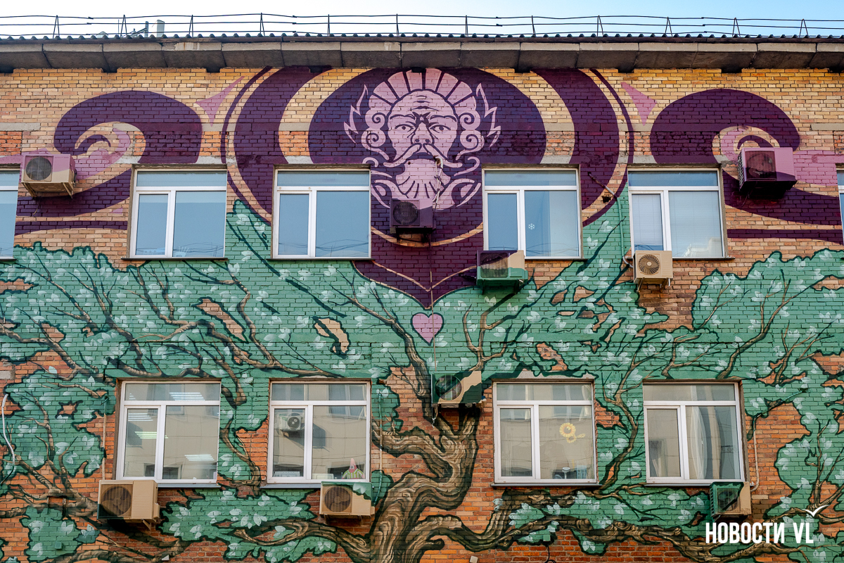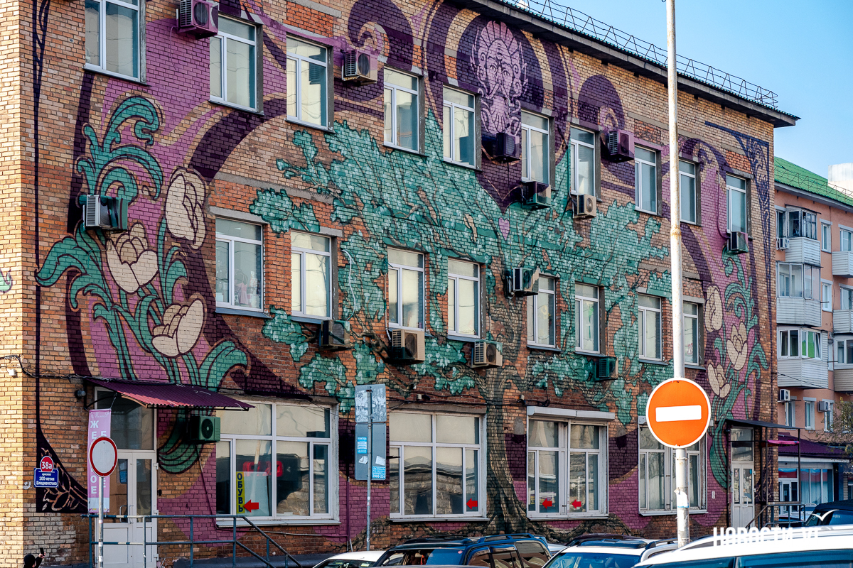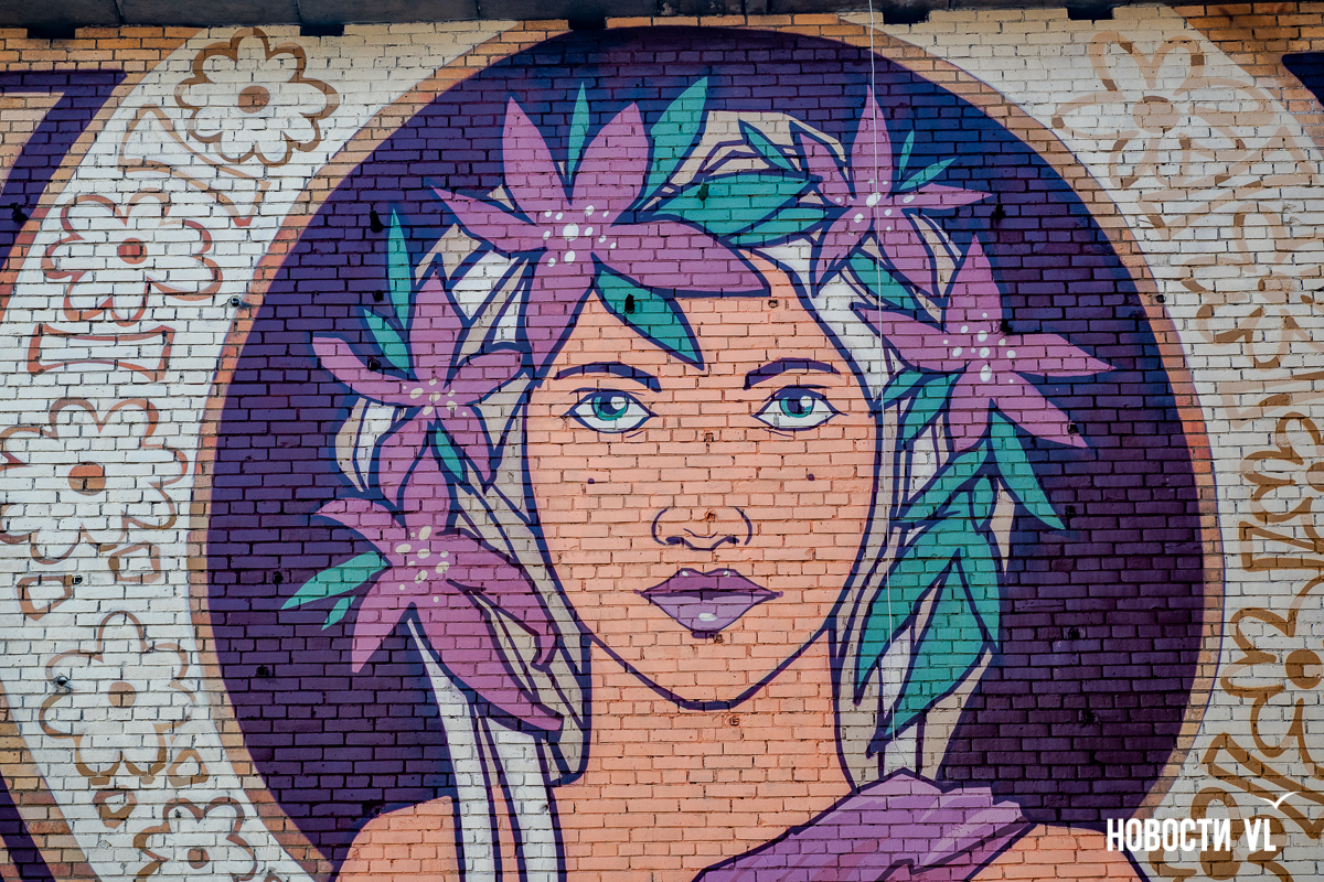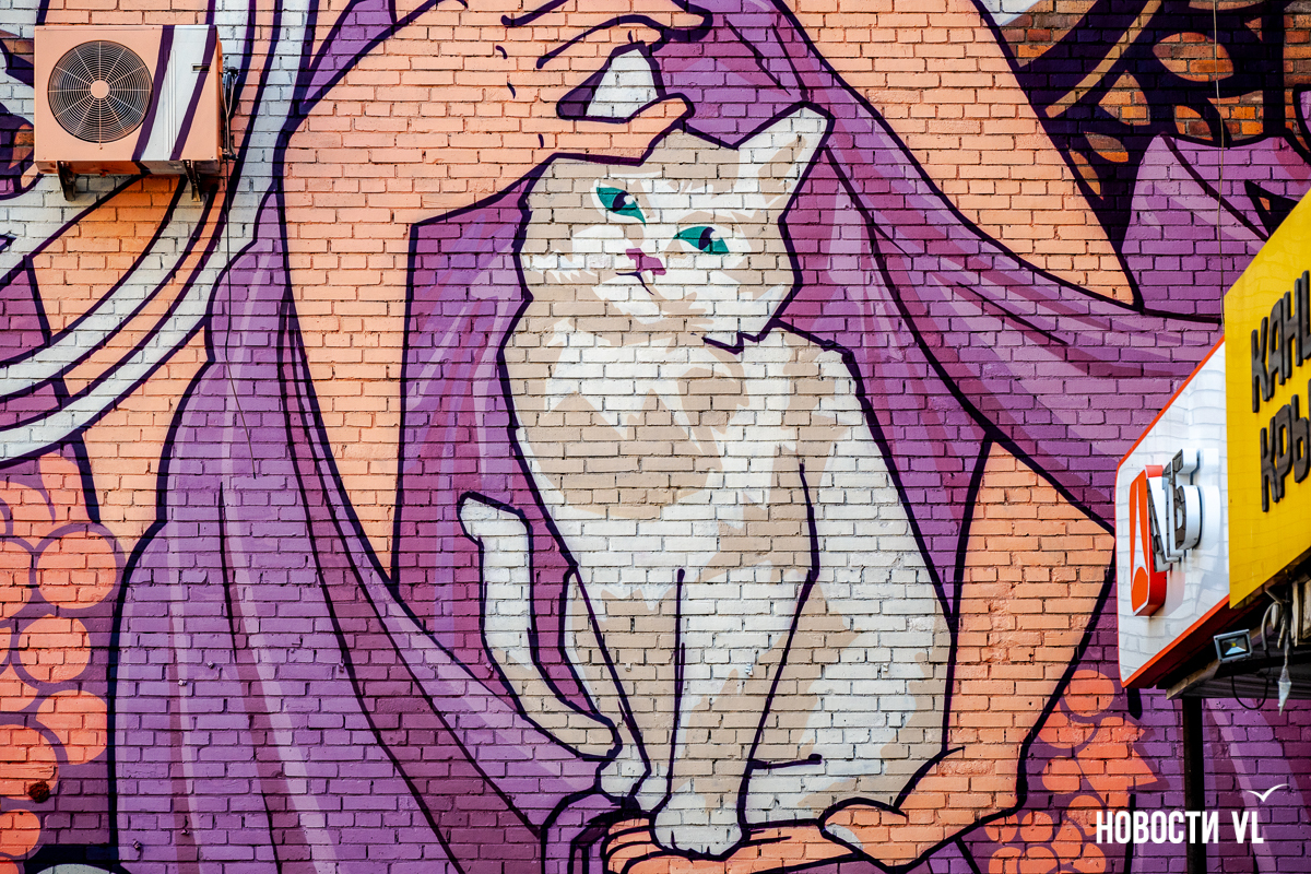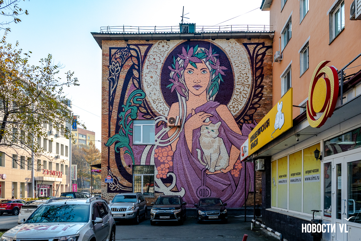 Необычное граффити появилось на стенах трёхэтажного дома на проспекте 100-летия Владивостока. Оно явно перекликается с модерном, ар-нуво и ар-деко – на улицах рисунков в таком стиле обычно не встретить. Ещё одна редкость – нет тигра, такого традиционного для владивостокских муралов. Зато есть растения, женщины, рыжий кот и дракон. Работа выглядит своеобразной перекличкой Востока и Запада – так и задумано художниками.