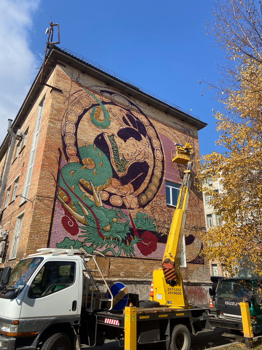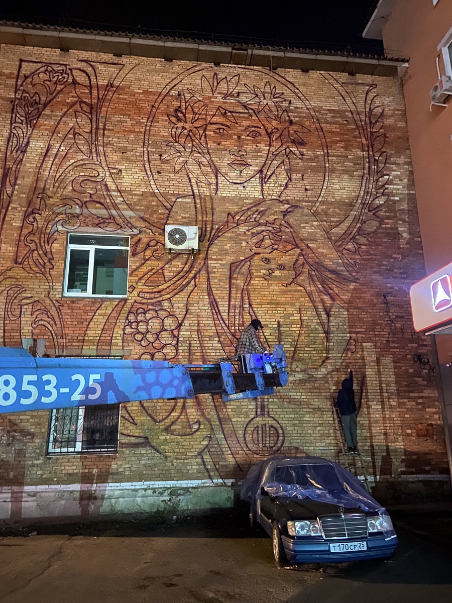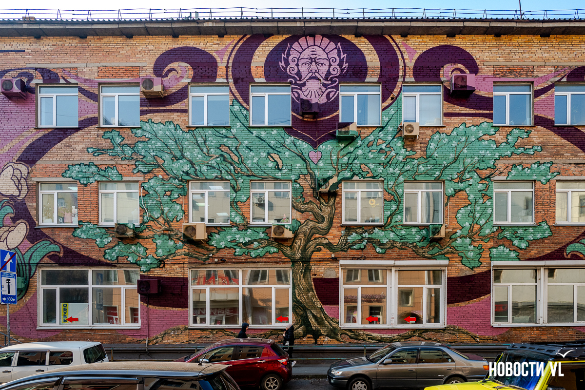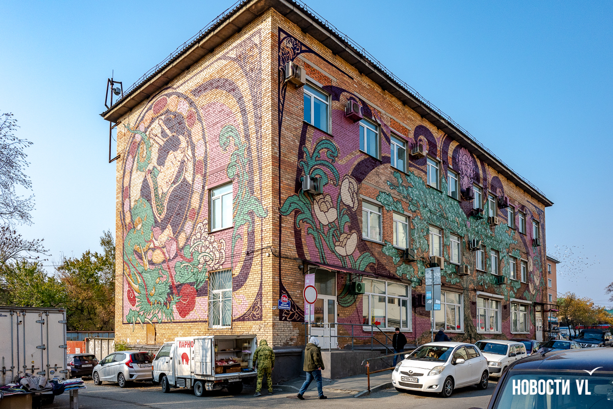 Необычное граффити появилось на стенах трёхэтажного дома на проспекте 100-летия Владивостока. Оно явно перекликается с модерном, ар-нуво и ар-деко – на улицах рисунков в таком стиле обычно не встретить. Ещё одна редкость – нет тигра, такого традиционного для владивостокских муралов. Зато есть растения, женщины, рыжий кот и дракон. Работа выглядит своеобразной перекличкой Востока и Запада – так и задумано художниками.