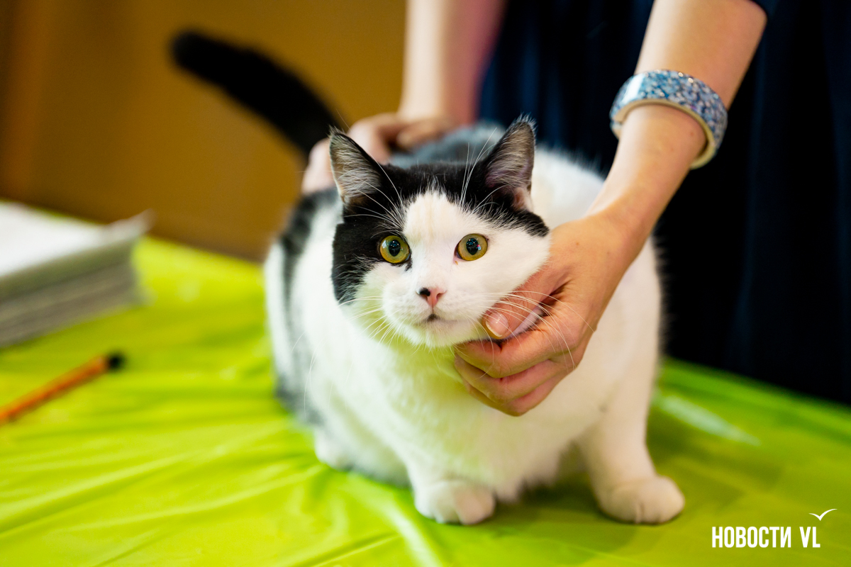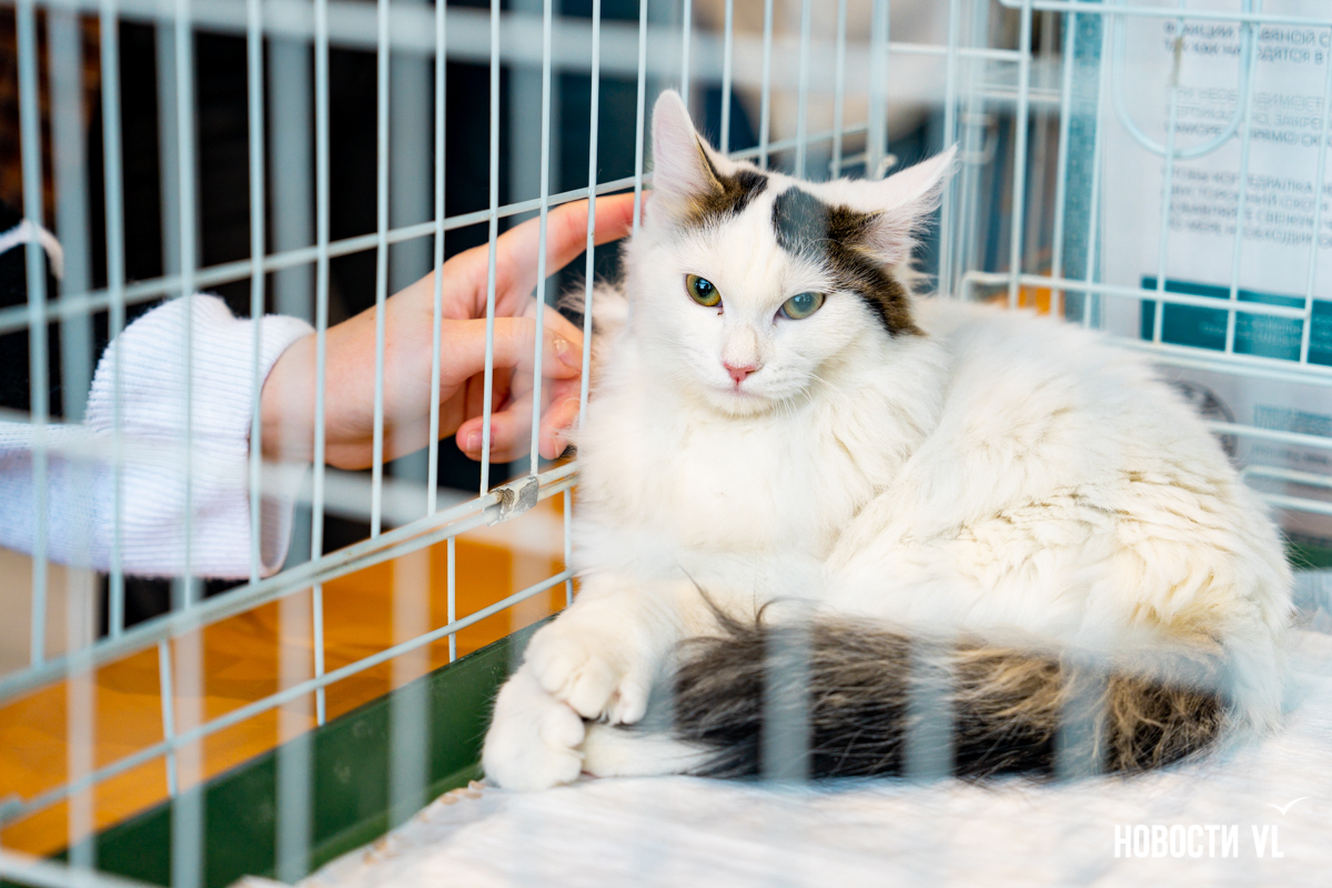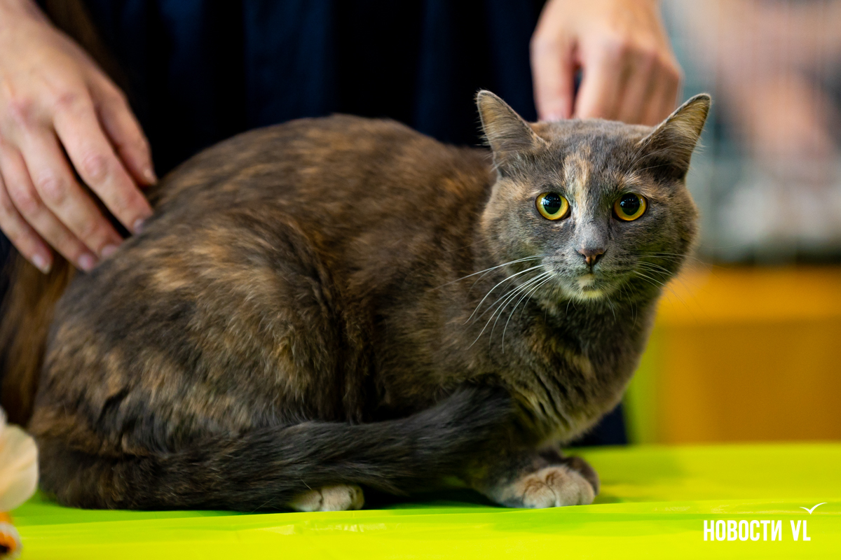 За трёхцветную Лауру отвечает Яна Киселёва – волонтёр центра «Лапочки» ДВФУ. Рассказывает, что Лауру очень долго не могли забрать у её бывшей хозяйки. Женщина жила в хрущёвке с несколькими животными, но в какой-то момент котики начали размножаться, их стало больше сорока. Многие не выживали, но Лауре повезло. Теперь она ищет новый дом.