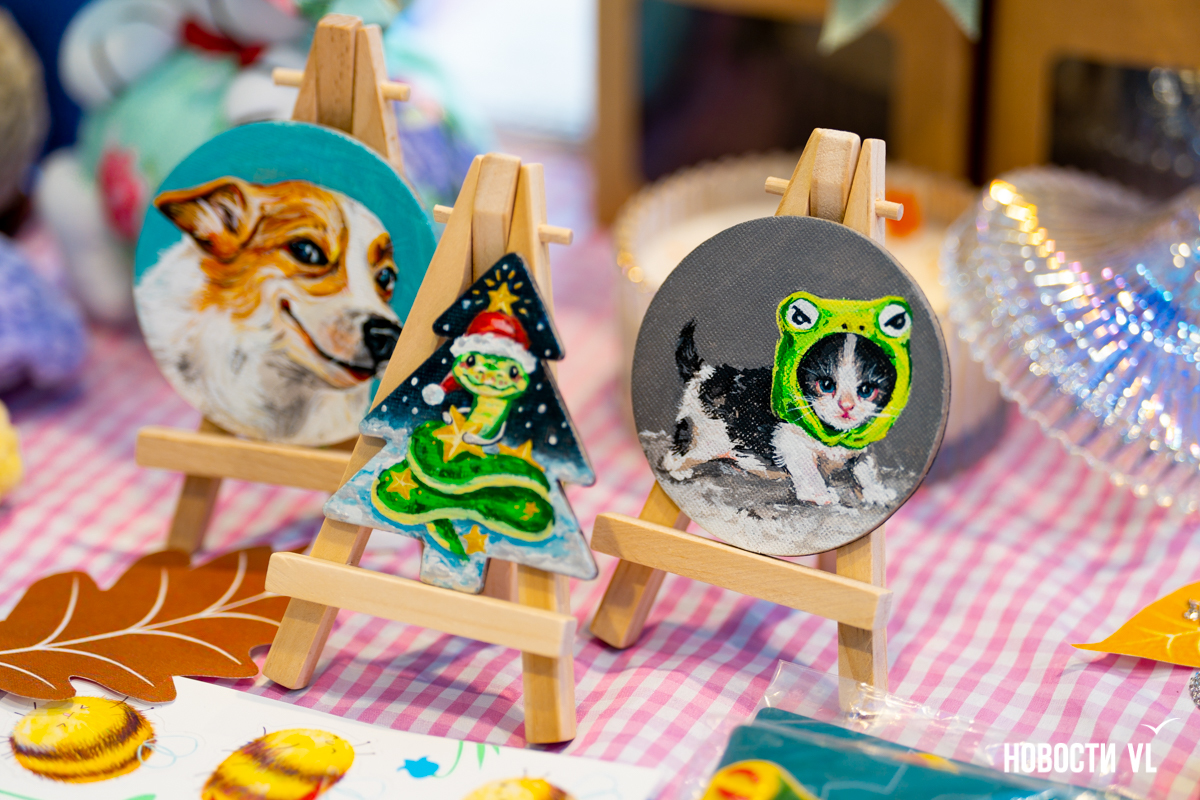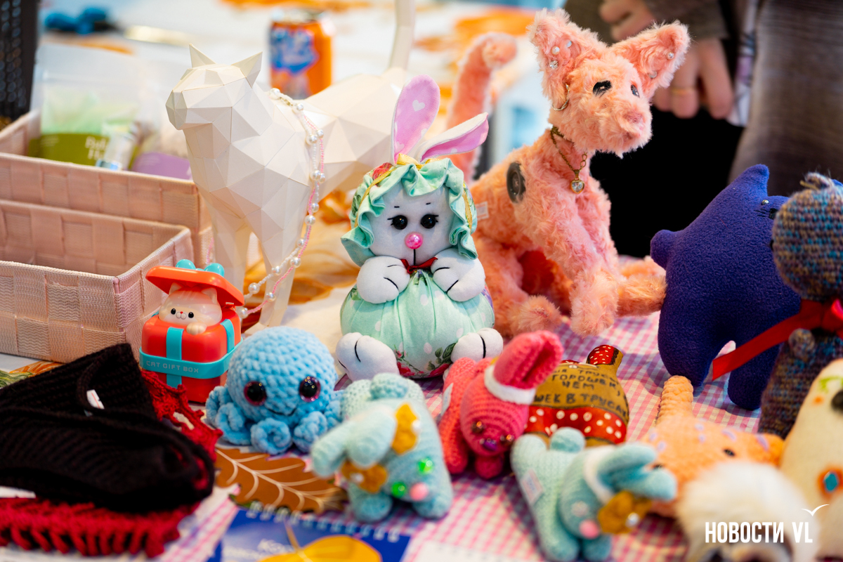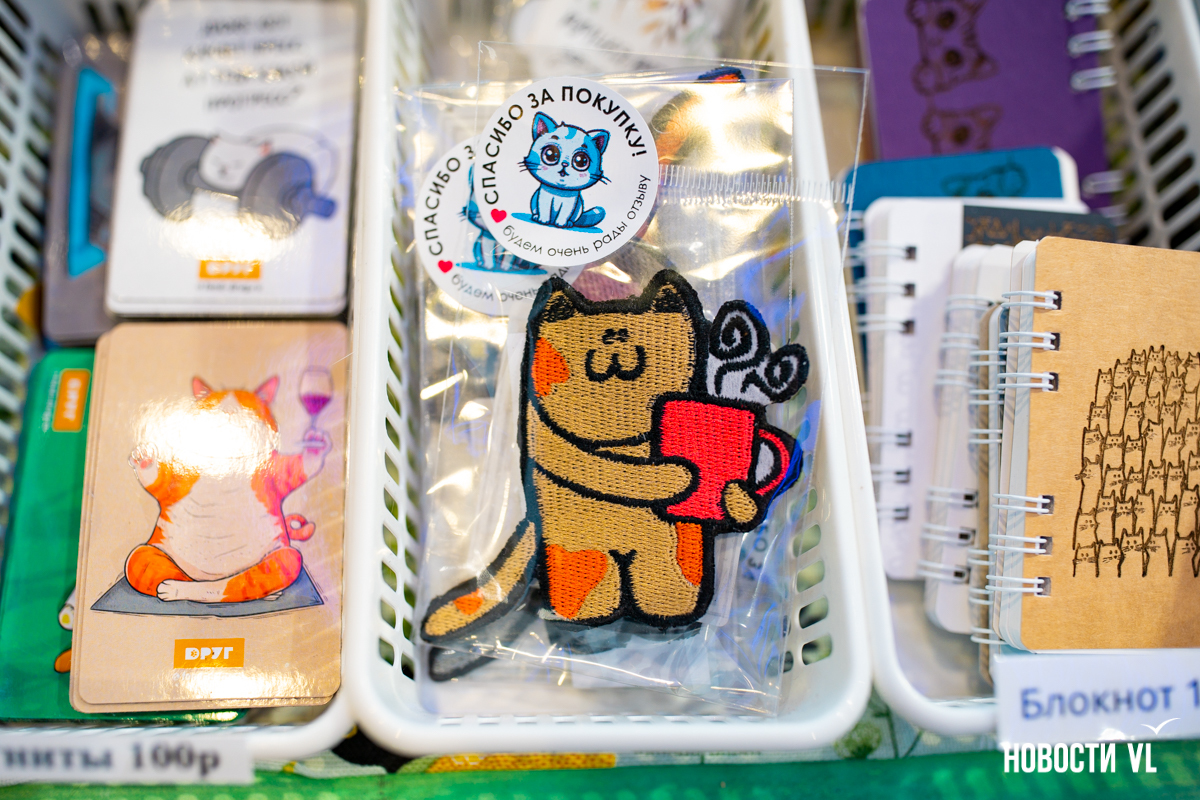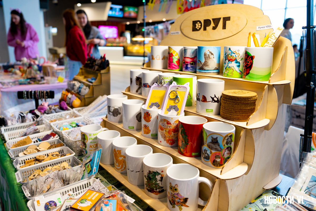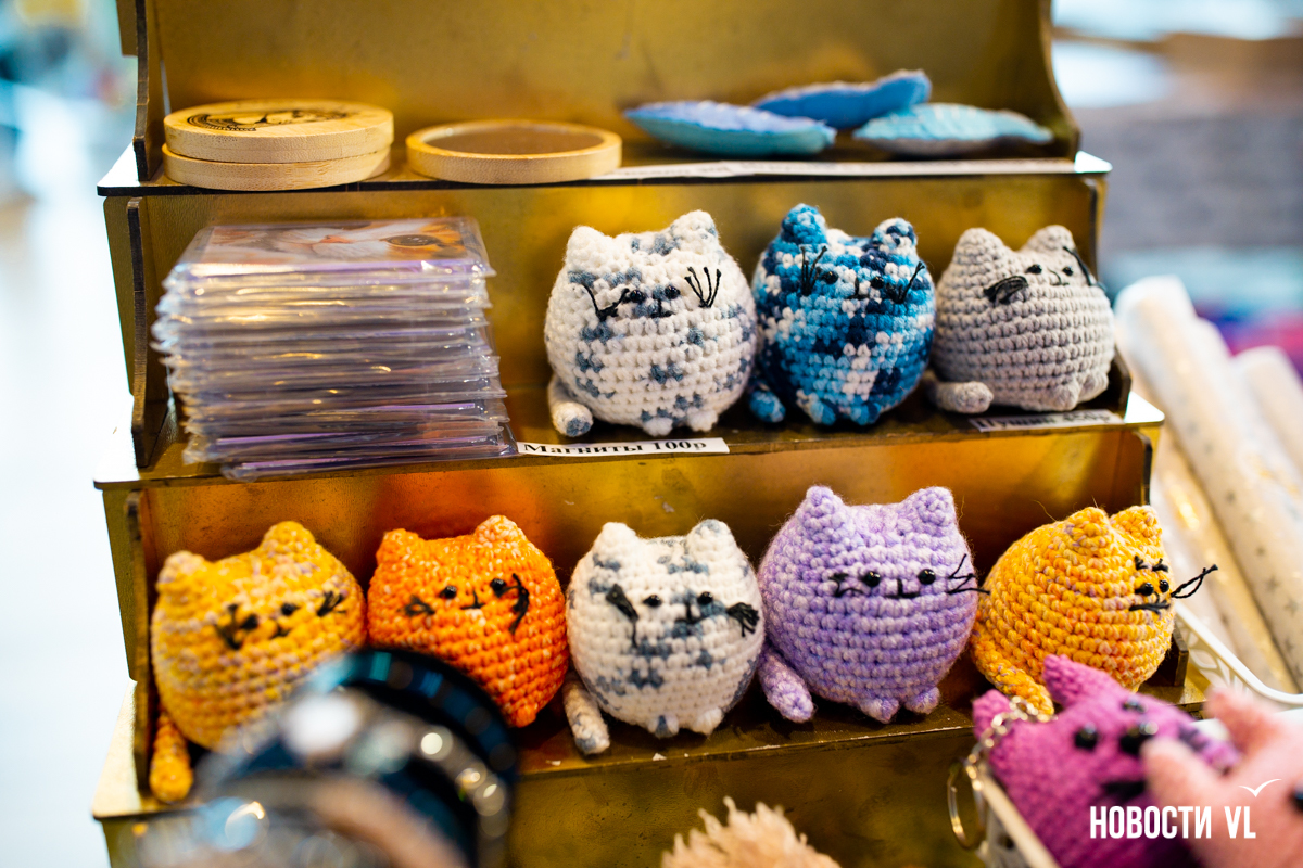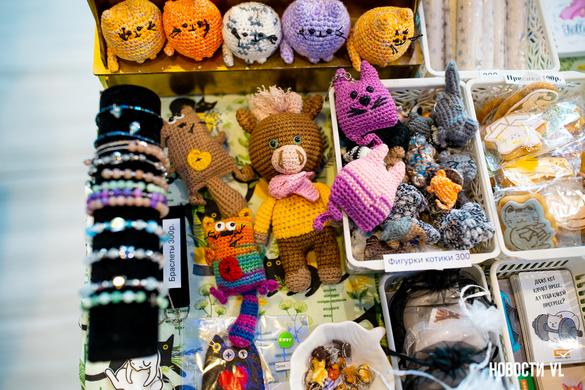 Ещё за одним столом гости вязали из пряжи сувениры или маленькие игрушки. Котиков, конечно. Вырученные деньги пойдут на содержание животных.