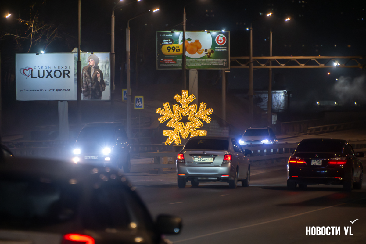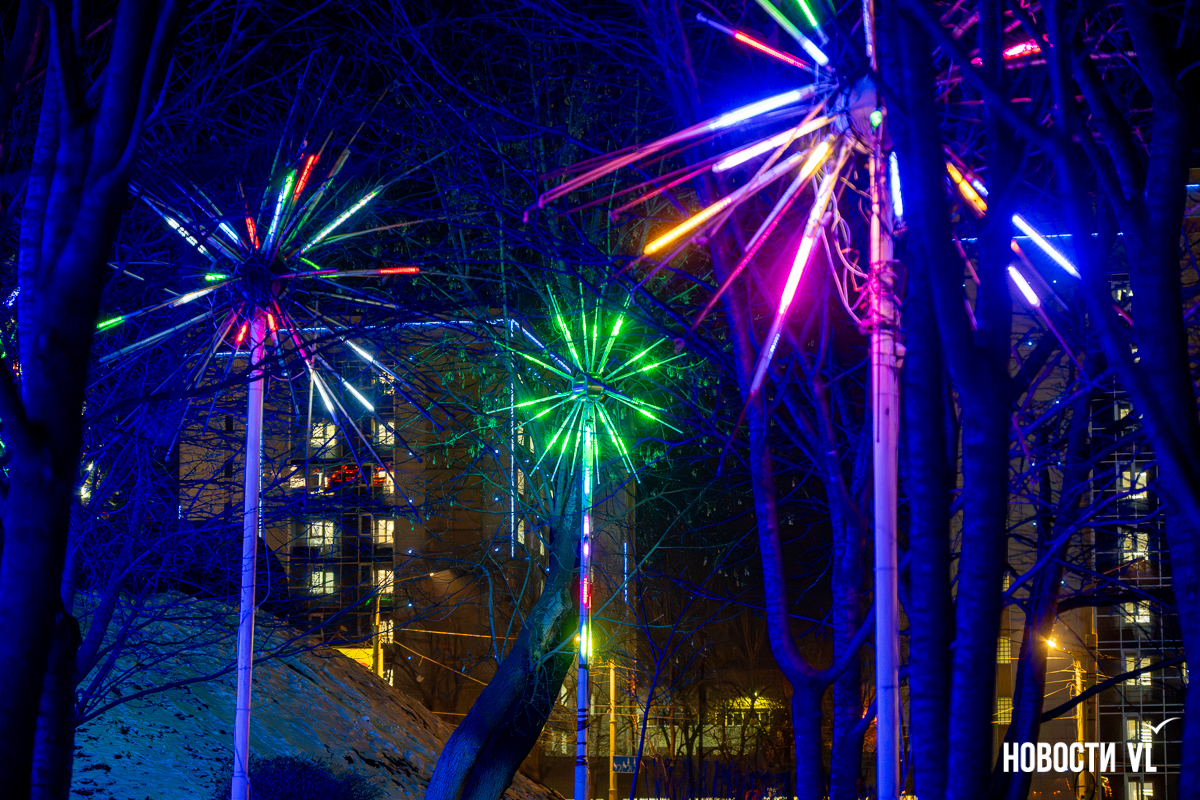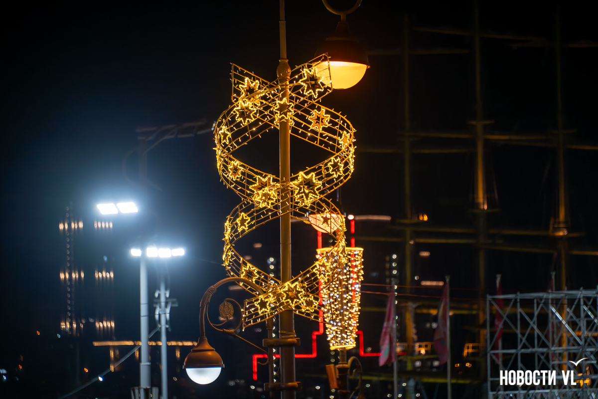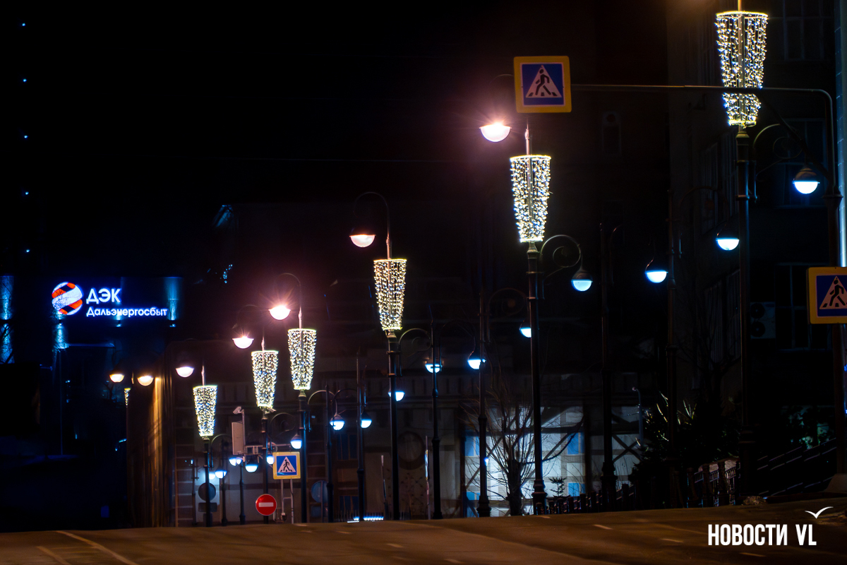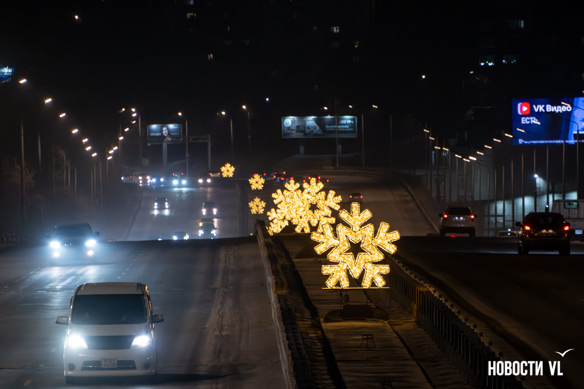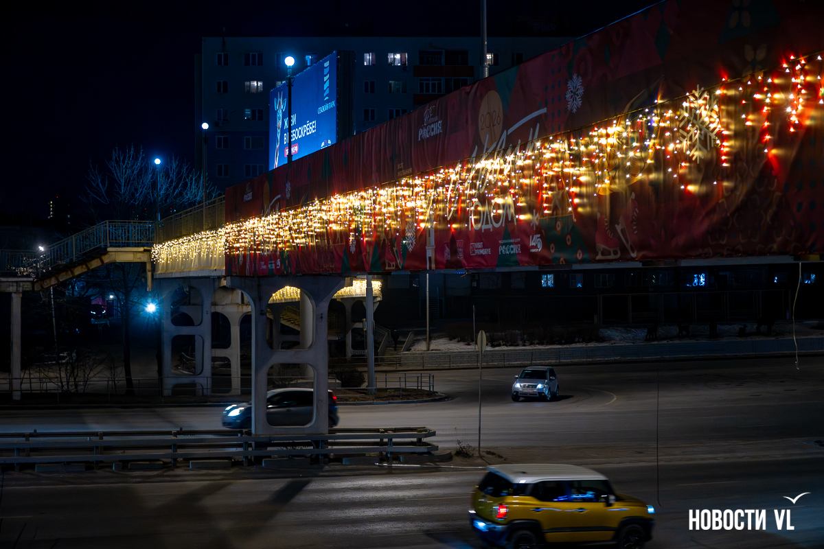 Традиционно ВПЭС украсил фонарные столбы на основных улицах – Суханова, Океанском проспекте, Алеутской, Светланской. Здесь уже привычные светодиодные «люстры», «стаканы», а также ленты со звездами. Виадуки украсили гирляндами. Правда, на некоторых объектах светодиоды только подчёркивают не лучшее их состояние – например, на «Заре» отлично видно сломанную крышу виадука, под которой висит яркая диодная лента.