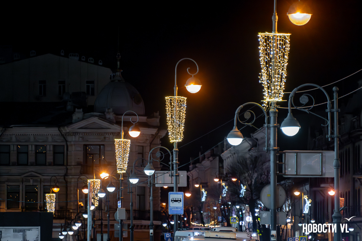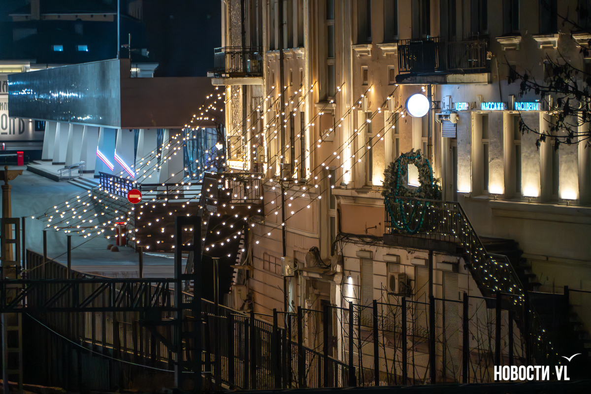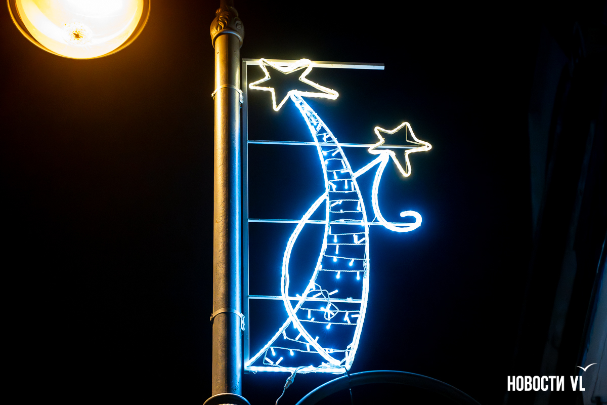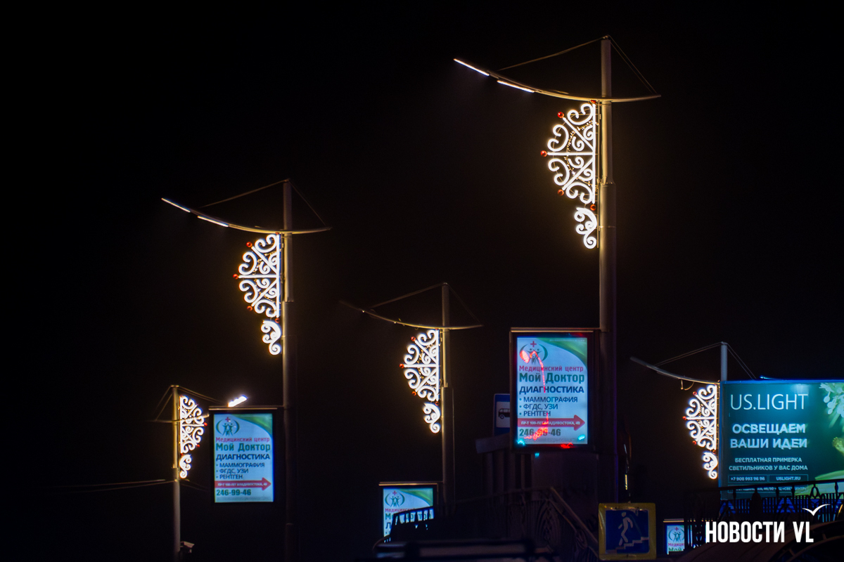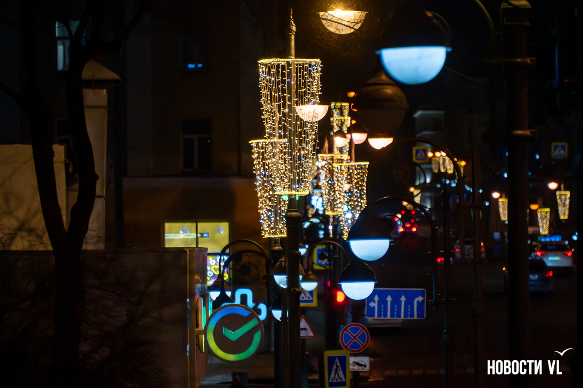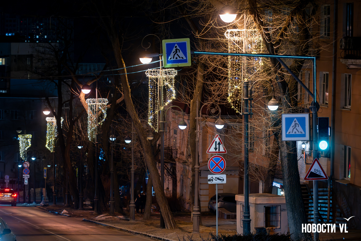 Традиционно ВПЭС украсил фонарные столбы на основных улицах – Суханова, Океанском проспекте, Алеутской, Светланской. Здесь уже привычные светодиодные «люстры», «стаканы», а также ленты со звездами. Виадуки украсили гирляндами. Правда, на некоторых объектах светодиоды только подчёркивают не лучшее их состояние – например, на «Заре» отлично видно сломанную крышу виадука, под которой висит яркая диодная лента.