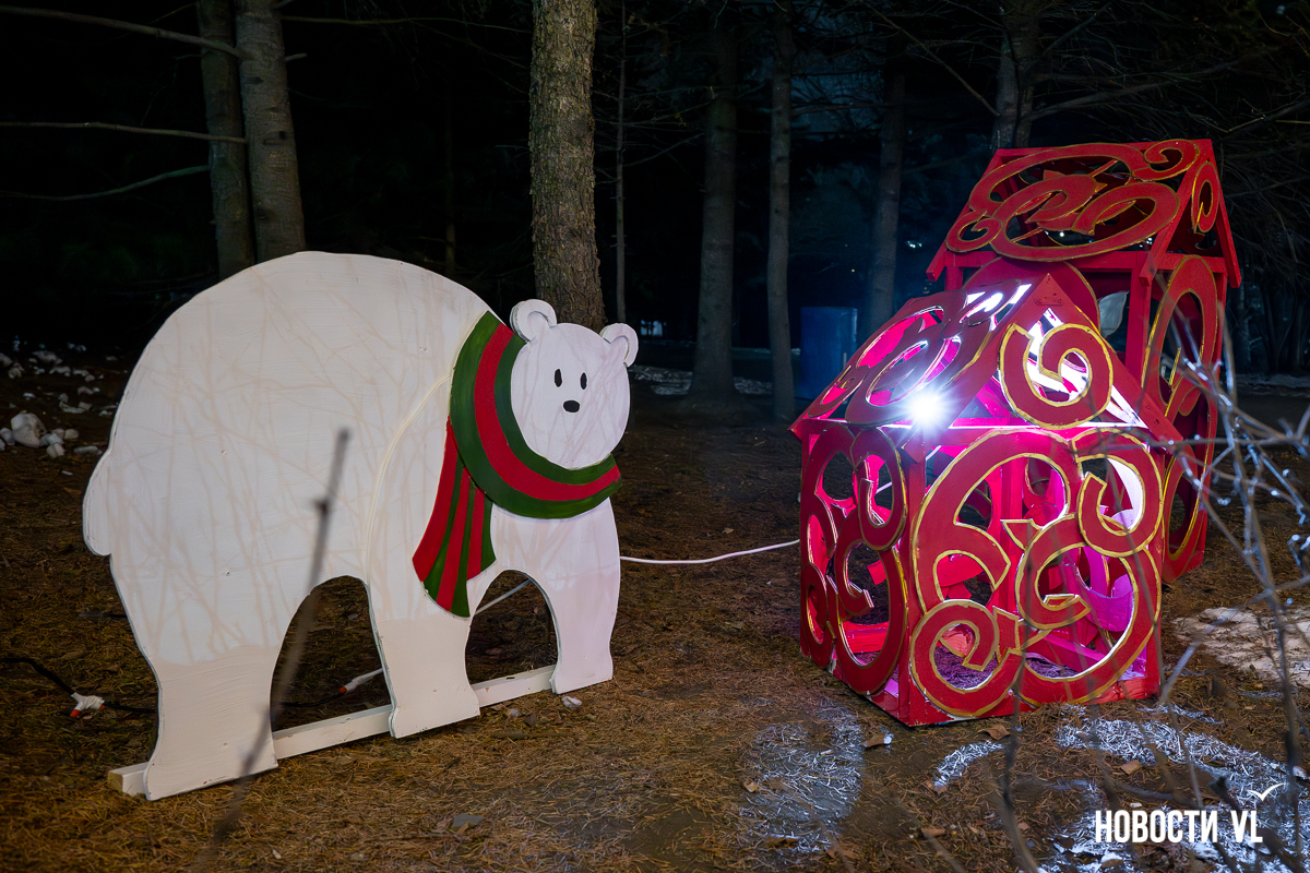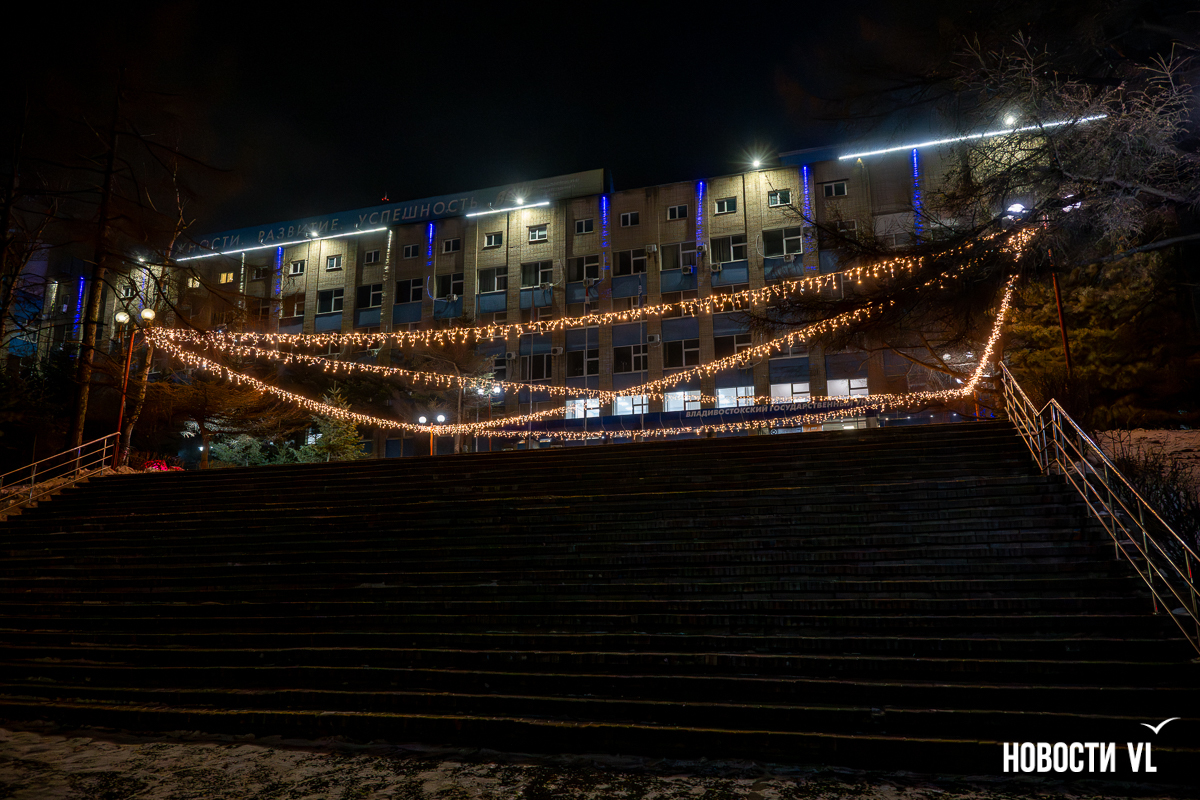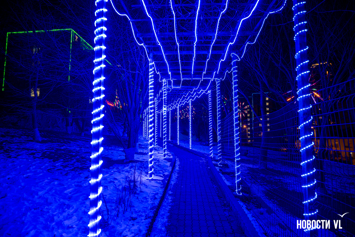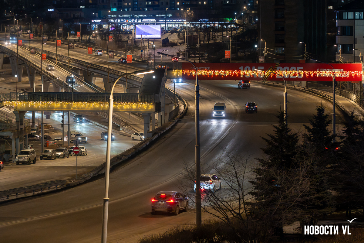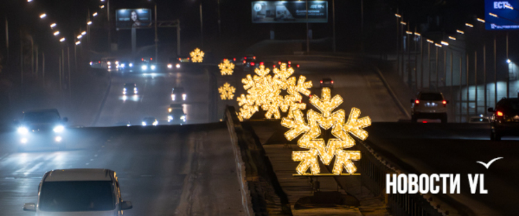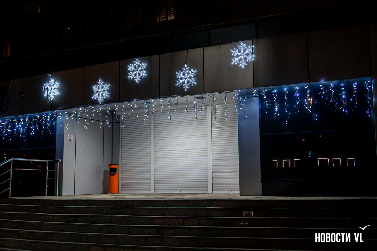 Традиционно ВПЭС украсил фонарные столбы на основных улицах – Суханова, Океанском проспекте, Алеутской, Светланской. Здесь уже привычные светодиодные «люстры», «стаканы», а также ленты со звездами. Виадуки украсили гирляндами. Правда, на некоторых объектах светодиоды только подчёркивают не лучшее их состояние – например, на «Заре» отлично видно сломанную крышу виадука, под которой висит яркая диодная лента.