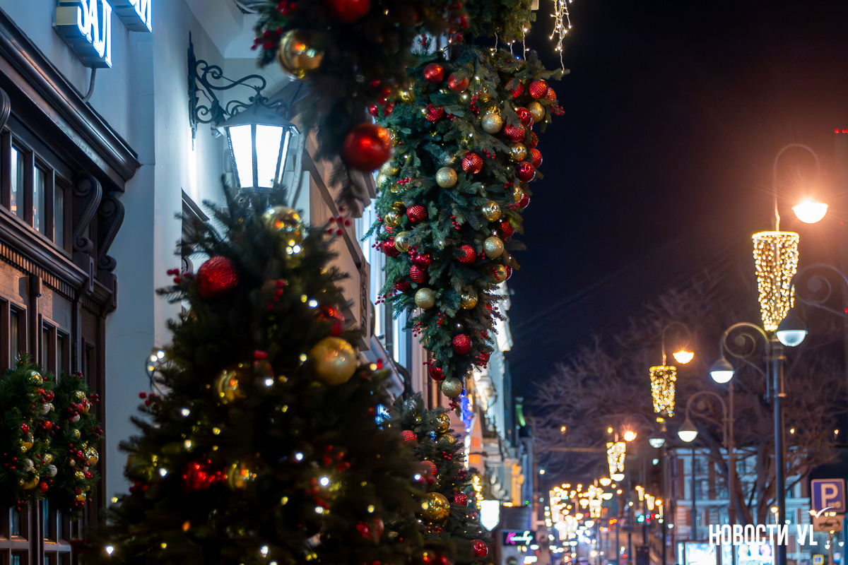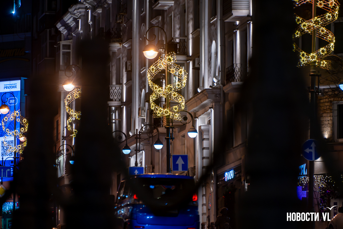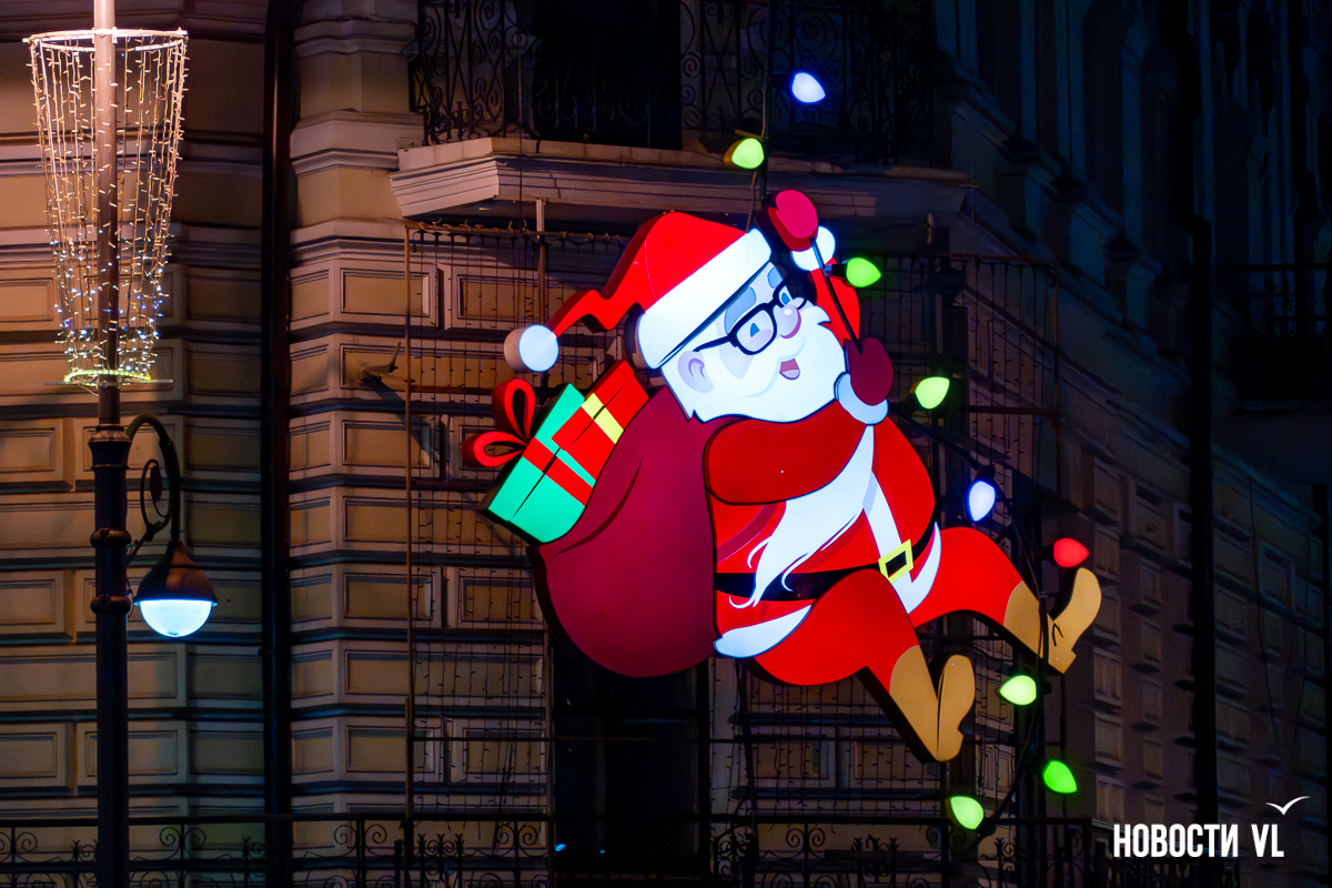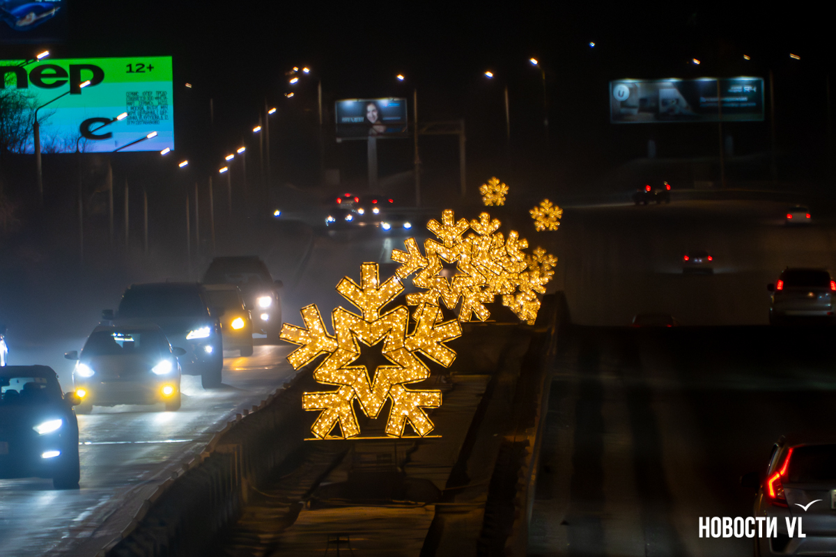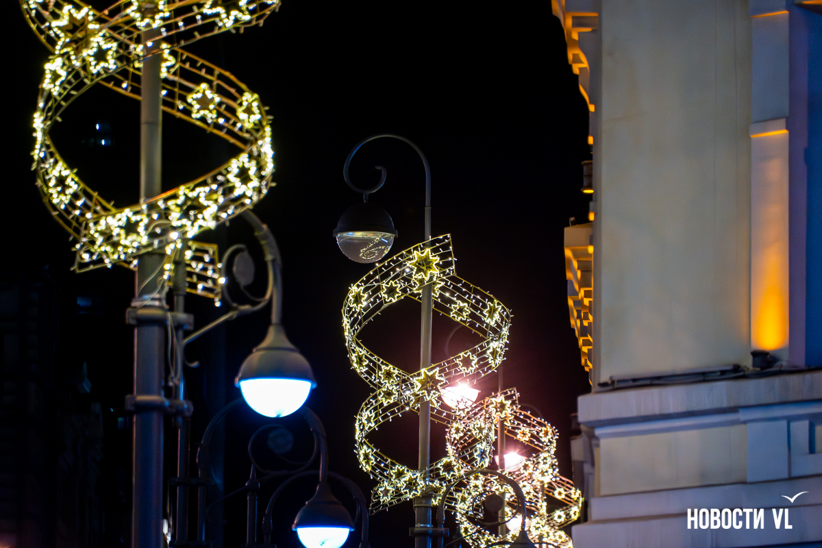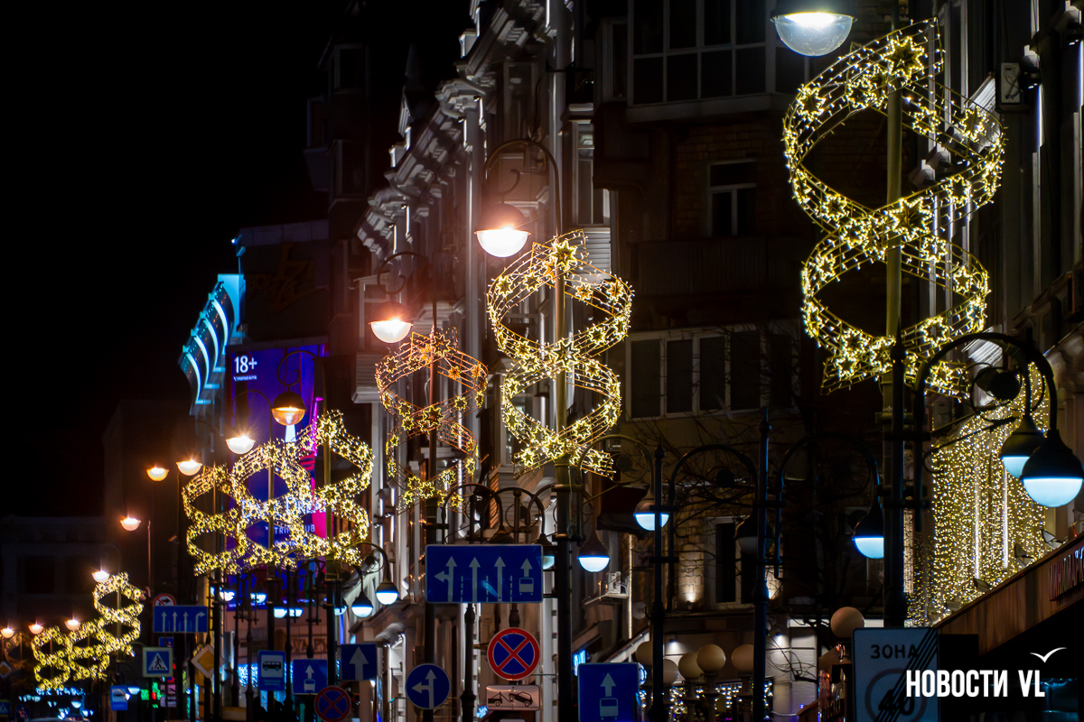 Владивосток во всю готовится к встрече Нового года. До него осталось чуть больше недели, и городские улицы, скверы, дороги и заведения по вечерам сияют праздничными украшениями. Светодиодные фигуры, гирлянды, светящиеся шары и гигантские снежинки с наступлением темноты сверкают, создавая особенное настроение.