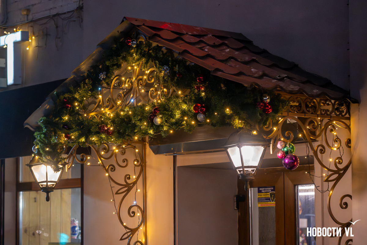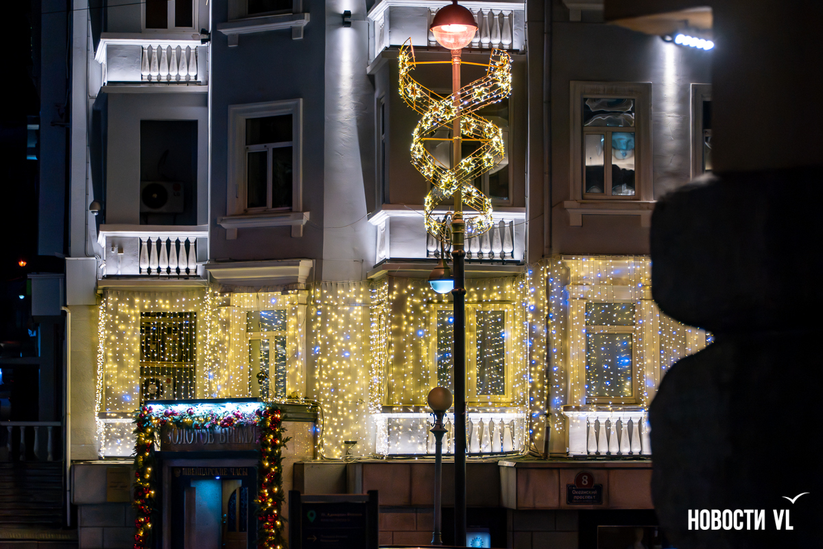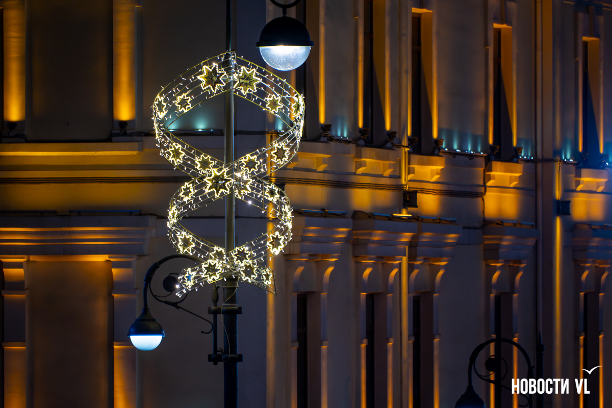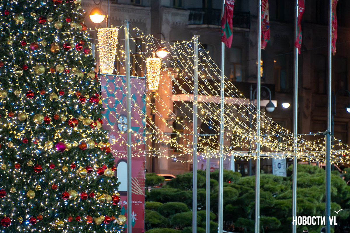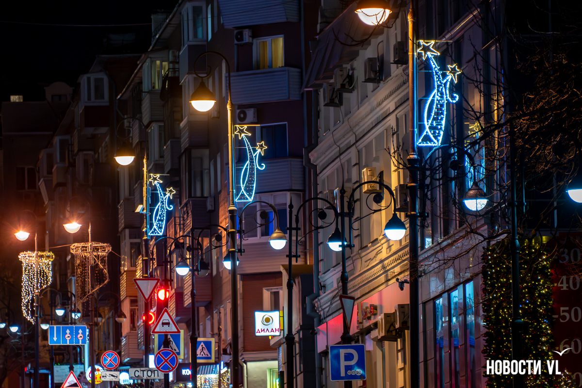 Владивосток во всю готовится к встрече Нового года. До него осталось чуть больше недели, и городские улицы, скверы, дороги и заведения по вечерам сияют праздничными украшениями. Светодиодные фигуры, гирлянды, светящиеся шары и гигантские снежинки с наступлением темноты сверкают, создавая особенное настроение.