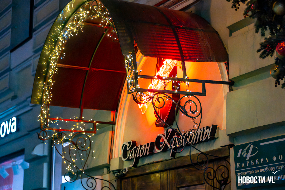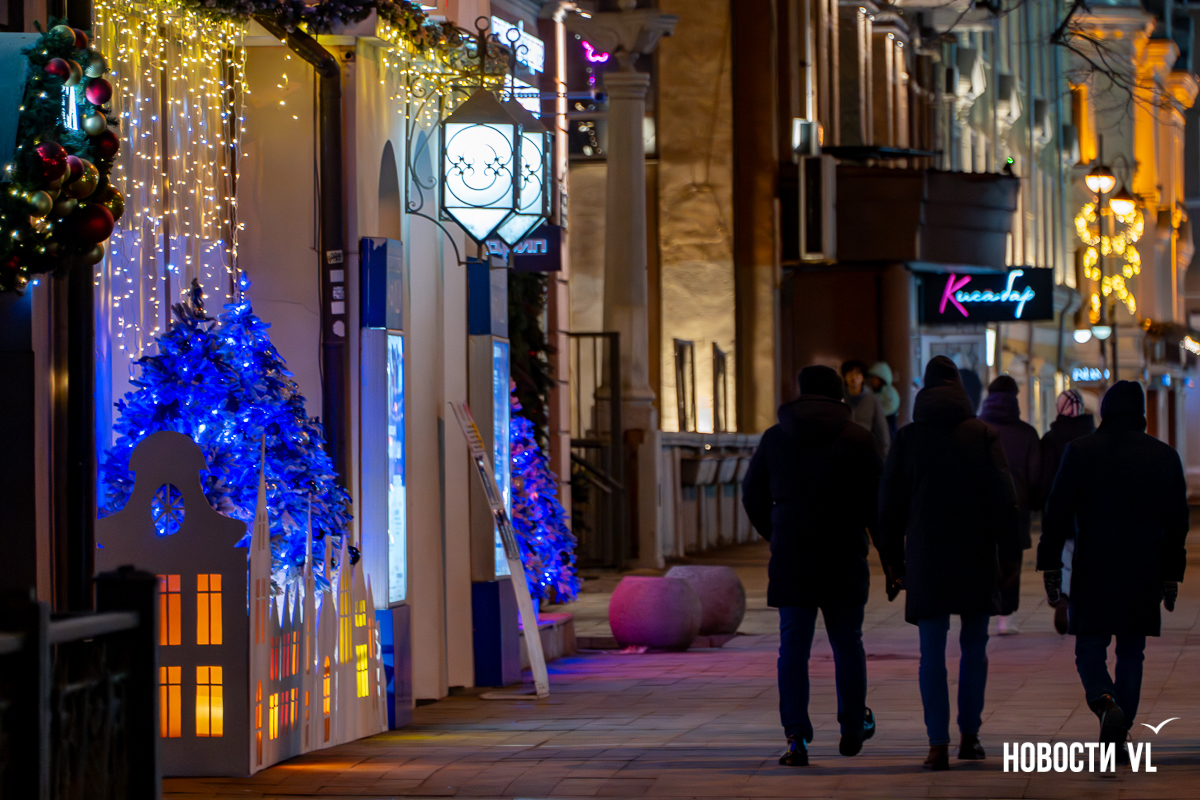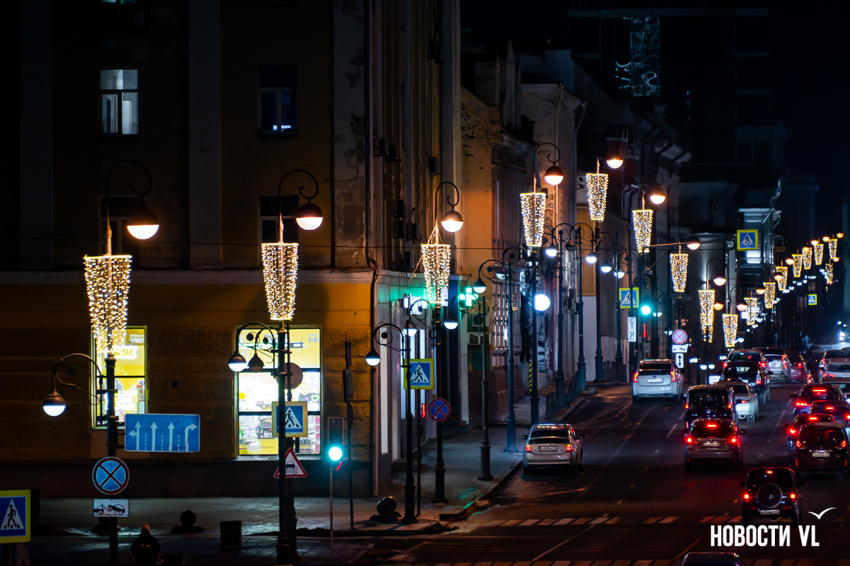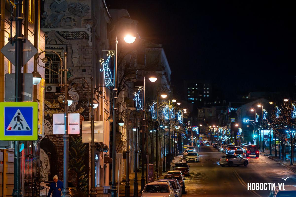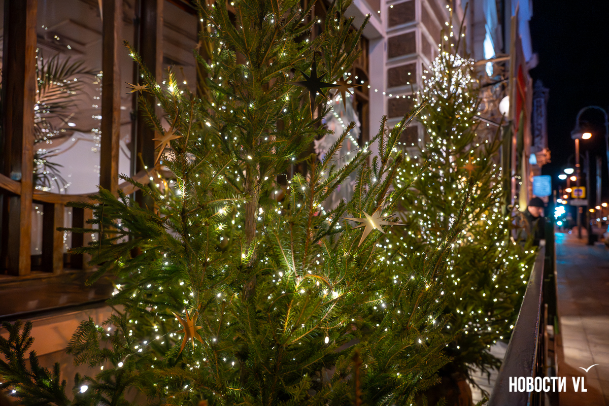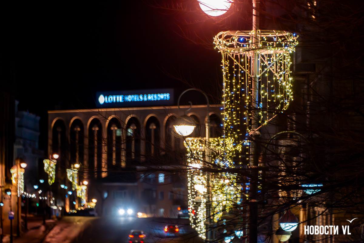 Владивосток во всю готовится к встрече Нового года. До него осталось чуть больше недели, и городские улицы, скверы, дороги и заведения по вечерам сияют праздничными украшениями. Светодиодные фигуры, гирлянды, светящиеся шары и гигантские снежинки с наступлением темноты сверкают, создавая особенное настроение.