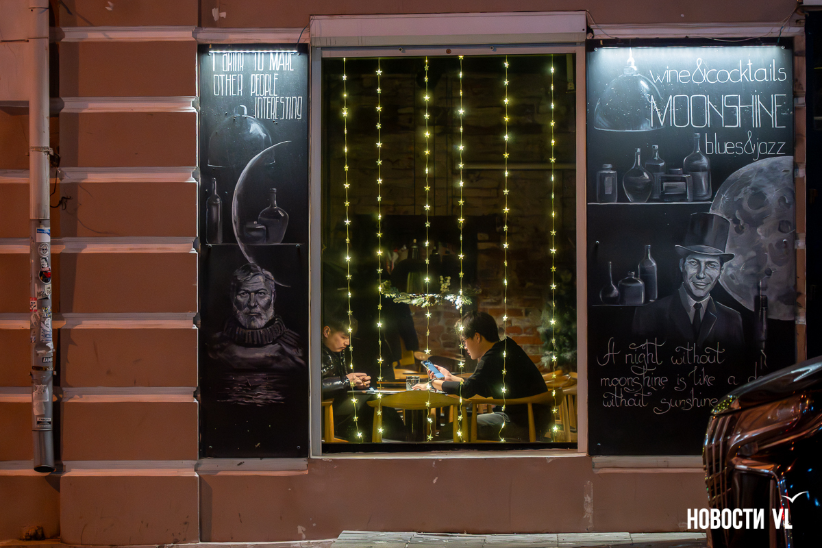 Заведения тоже включились: кафе, магазины, торговые центры – везде световые ленты, скопления огоньков, горящих или мерцающих, подсвечены вывески, даже сияющие мини-ёлочки и игрушки установили в окна. То, что днём служит просто новогодним декором, к вечеру преображается. Даже обычно жутковатые подворотни Миллионки теперь засияли новогодними огнями и выглядят притягательно и таинственно.
