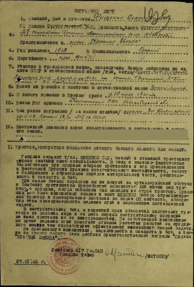 Гвардии сержант Семен Фещенко (на фото) участвовал в Великой Отечественной войне с июля 1941 по июнь 1943 года в составе 215-го артиллерийского полка. Затем по октябрь 1945 года воевал против немецко-фашистских захватчиков в составе 217-го гвардейского пушечно-артиллерийского полка в должности командира тракторного отделения на Южном, 4-м Украинском, 3-м Белорусском и 3-м Прибалтийском фронтах.