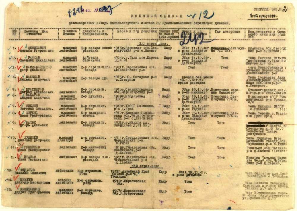 В 2009 году поисковый отряд нашел в Подмосковье два солдатских медальона. Один из них принадлежал красноармейцу, без вести пропавшему в феврале 1942 года, а второй – командиру, погибшему осенью 1941 и захороненному в братской могиле в близлежащей деревеньке. В этих местах в 1941 году натиск немцев под Москвой отражала 32-я Краснознамённая стрелковая дивизия, переброшенная на фронт из Приморья.