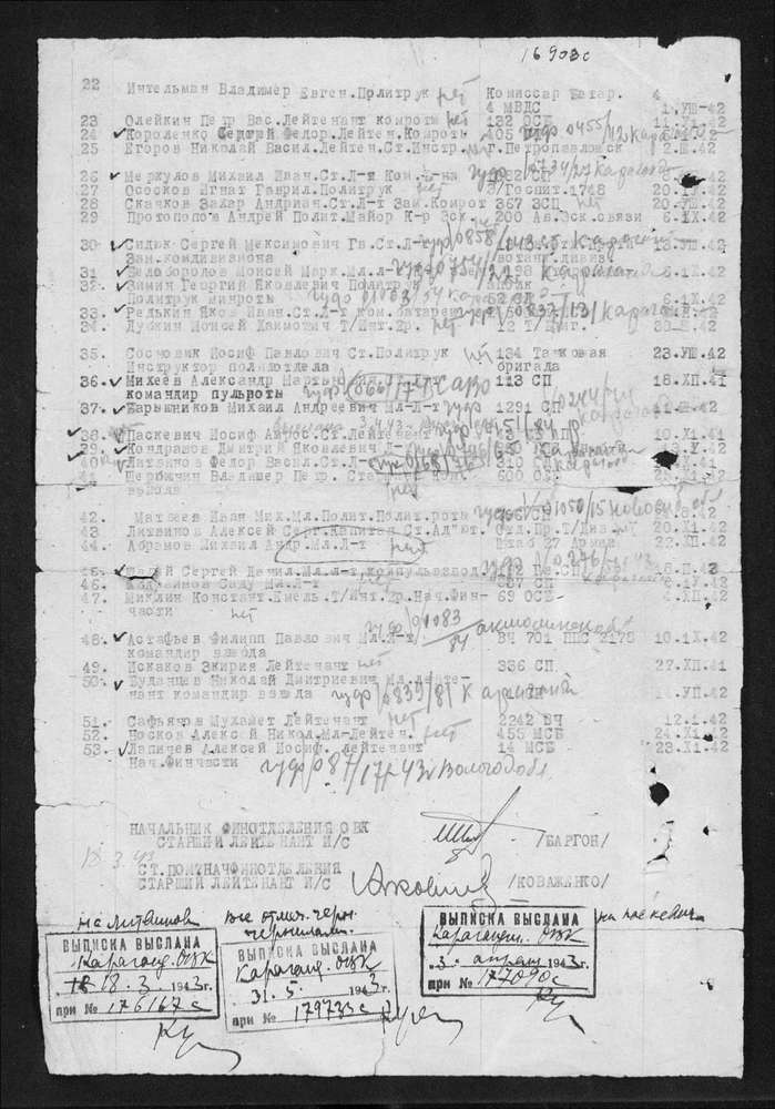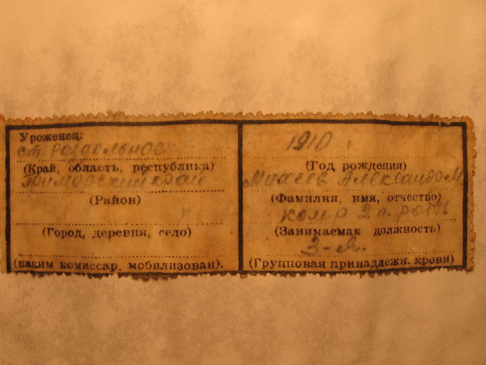 Записка Александра Михеева сохранилась очень хорошо. В отличие от предыдущей, она написана на специальном бланке. Согласно записке, он родился в 1910 году в с. Раздольное Приморского края, занимал должность командира 2-й пулеметной роты. Указана даже группа крови – третья. Но данные из записки частично не совпадают со сведениями Центрального архива Министерства обороны. Из пяти архивных записей о фронтовике с таким именем, фамилией и отчеством ни в одной не упоминается станция Раздольное как место рождения. Две из записей указывают на город Сердобск, Пензенской области, одна – на Саратовскую область.