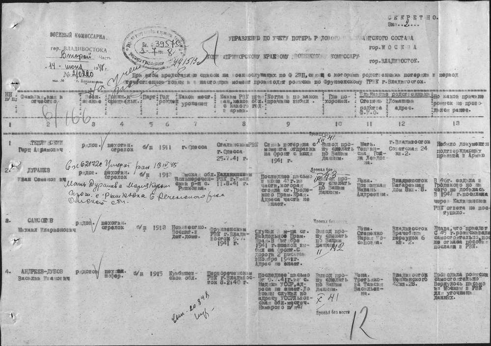 Как выяснили корреспонденты VL.ru, Самсонов Михаил Илларионович 9 июля 1941 года был призван в армию Фрунзенским районным военкоматом Владивостока. Дома его осталась ждать супруга Мария Степенко. Других родственников у Михаила не было - он воспитывался в детском доме. В документах Фрунзенского военкомата со слов супруги записано, что Михаил Самсонов прослужил 3 месяца на станции Раздольное, после чего в составе эшелона отбыл на фронт. В ноябре 1941 года он прислал жене Марии два письма, больше вестей от него не было. До 1945 года она жила с надеждой на возвращение супруга, после начала разыскивать его самостоятельно. В 1948 году после отказа в получении пособия за погибшего родственника, обратилась в военкомат.