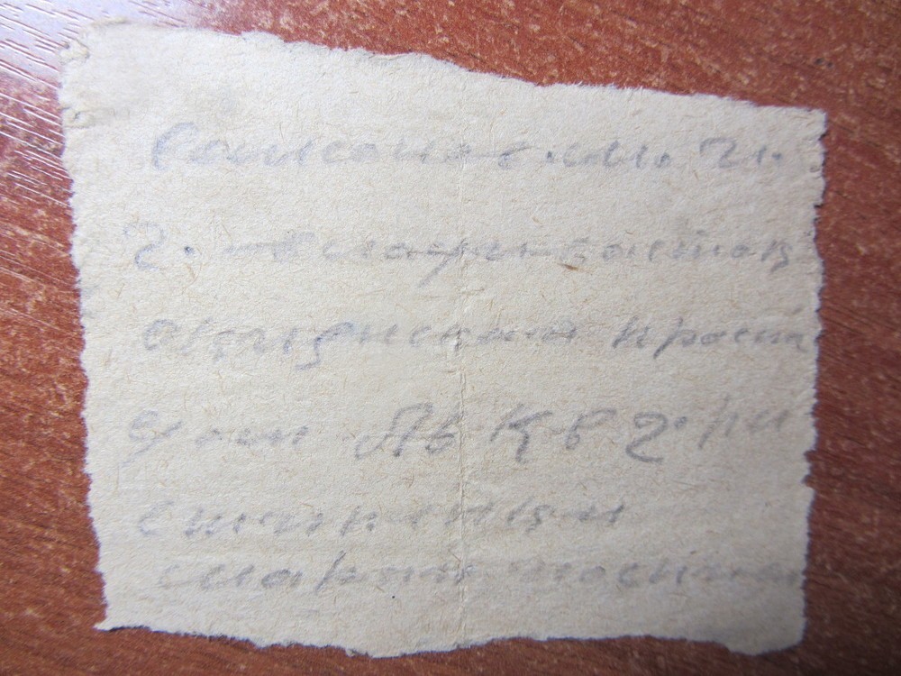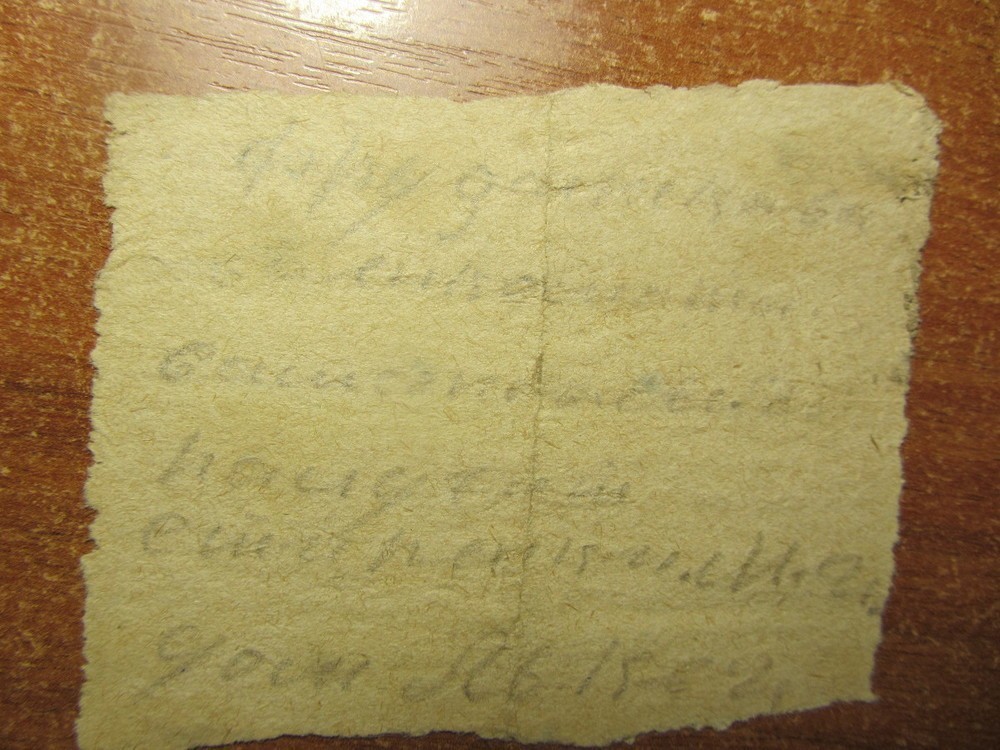 Текст записки внутри солдатского медальона читается с трудом. Так называемые смертные медальоны военнослужащих рабоче-крестьянской Красной армии (РККА) времен ВОВ представляет собой закручивающиеся пластмассовые пенальчики, в которые вкладывалась записка с информацией о бойце. Иногда в качестве пенала использовалась пустая гильза от винтовочного патрона. К сожалению, влага и время очень часто портят записку.