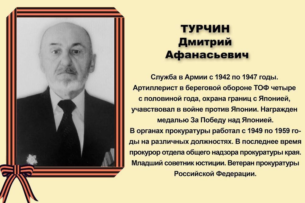 Турчин Дмитрий Афанасьевич – участник Великой Отечественной войны, ученый и юрист, профессор, доктор юридических наук. Родился в многодетной семье, в 17 лет ушел на фронт, служил на Русском острове, всю жизнь посвятил работе в органах прокуратуры.