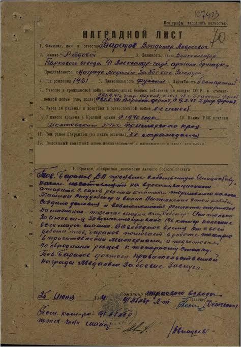 Родился Владимир Баранов 14 мая 1921 года в поселке Угловое Приморского края. З сентября 1940 года он был призван на срочную службу в Красную армию. Войну Владимир встретил в составе 91-й тяжелой гаубично-артиллерийской бригады. В ее рядах фронтовик воевал с фашистами на Северном, Карельском, Брянском, Воронежском, 1-м и 2-м Украинском фронтах.