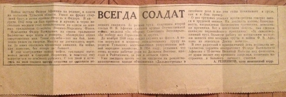 В дни наступления Красной армии рулевой тральщика Федор Афонин высаживал десант в Норвегии и помогал ему закрепиться на опасных рубежах. Не раз рулевой попадал под обстрел. На теле матроса осталось много шрамов от осколков немецких снарядов.