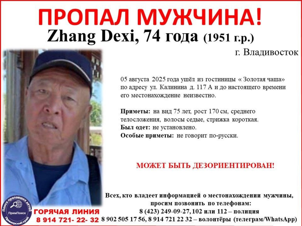 «ПримПоиск» сообщает, что 74-летний Джан Дэси вчера ушёл из гостиницы «Золотая чаша» (Калинина, 117а) и до настоящего времени его местонахождение неизвестно.