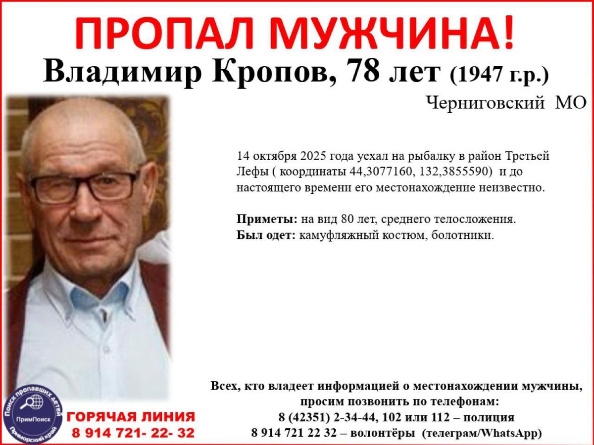 Как сообщает «ПримПоиск», пропавшего рыбака зовут Владимир Кропов. Предположительно, 14 октября отправился на рыбалку в район Третьей Лефу через село Высокое. Одет он был в камуфляжный костюм и болотники.