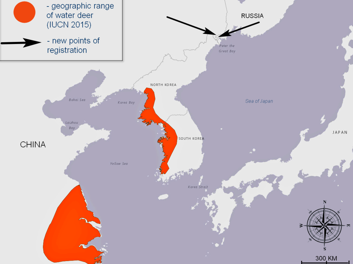 Ареалы китайского подвида (внизу страницы) и корейского подвида (запад Корейского полуострова) водяного оленя и новые встречи вида на стыке границ КНДР, КНР и РФ.