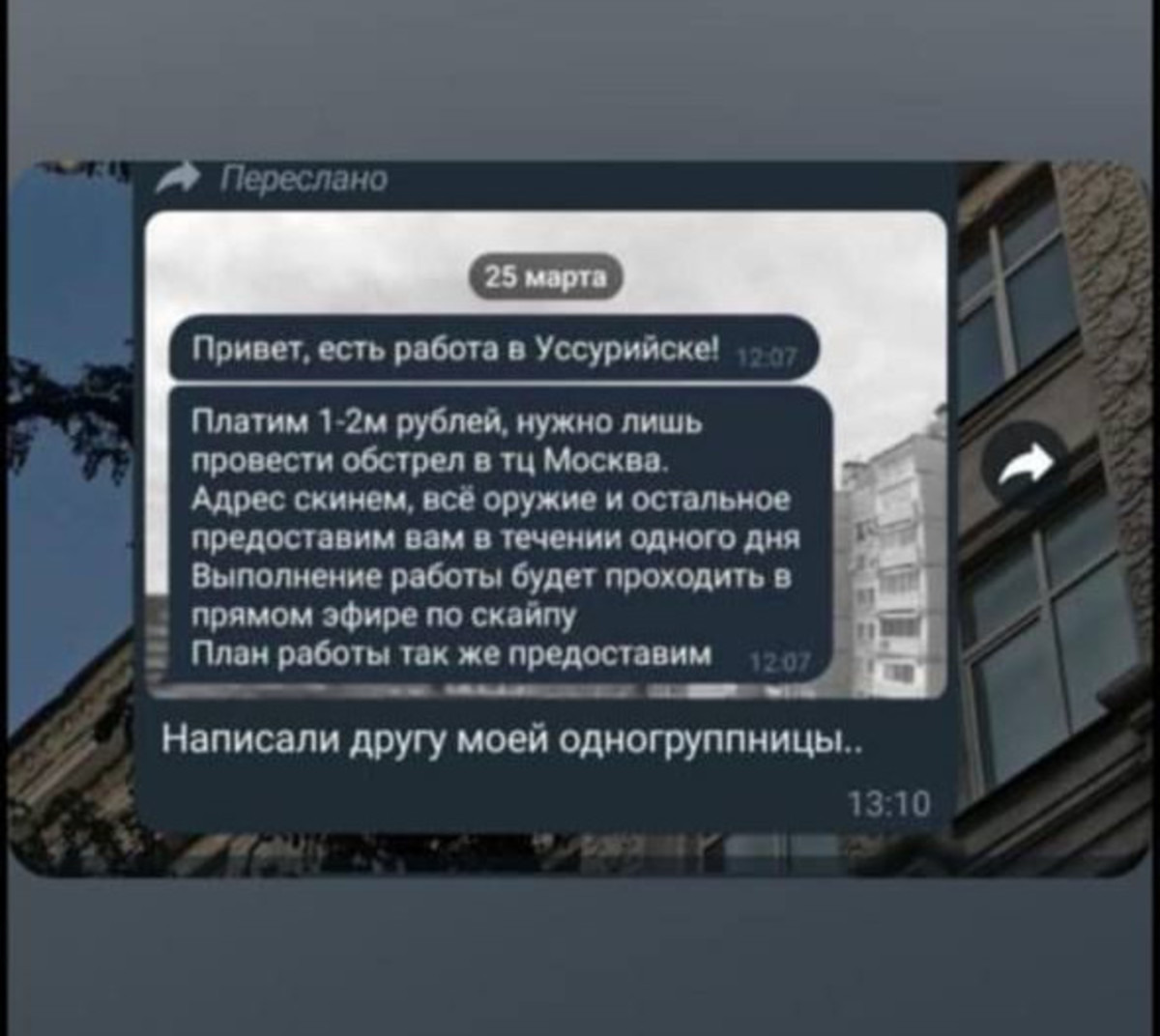 Официальный канал антитеррористической комиссии Приморского края также указывает, что в последние дни участились случаи, когда детям в мессенджерах и социальных сетях предлагают «подработать и помочь террористам». Предлагаемые суммы варьируются, объекты якобы планируемых атак тоже.