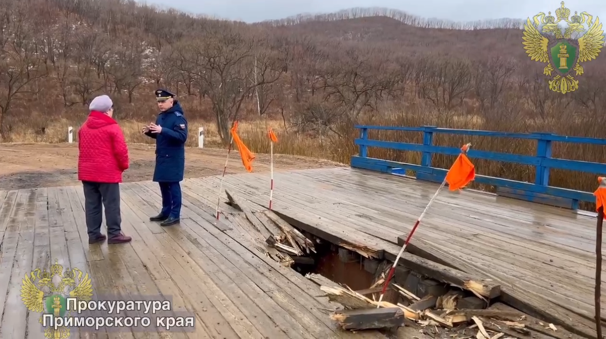 Обновление 18:00: Прокуратура Пограничного района организовала проверку по факту обрушения утром 28 марта полотна деревянного мостового сооружения. На место происшествия выехал исполняющий обязанности прокурора района Александр Смирнов.