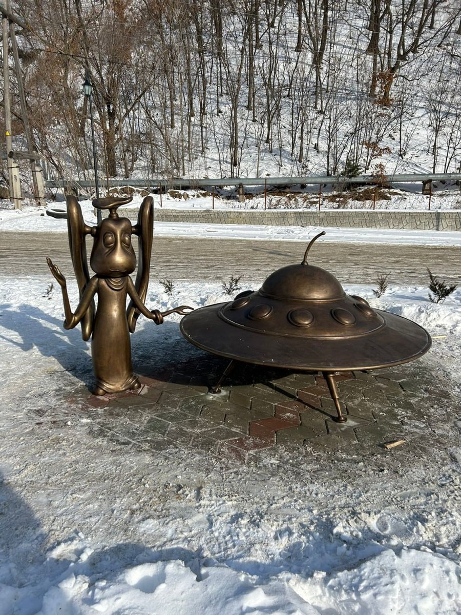 В городе Дальнегорске на днях установили несколько бронзовых скульптур в рамках нацпроекта по туризму. На бульваре Полины Осипенко появились фигуры художника, влюблённых, счастливой семьи, кота с голубями, а также инопланетянина с летающей тарелкой. Все они обыгрывают либо особенности места, где установлены, либо городские легенды. Однако не все горожане оказались рады новым туристическим объектам. Сначала вандалы оторвали смычок у бронзовой виолончели. А вчера местный священник потребовал у мэра убрать инопланетянина, поскольку он якобы «оскорбляет религиозные чувства верующих». За мультипликационного героя уже вступились другие приморцы.