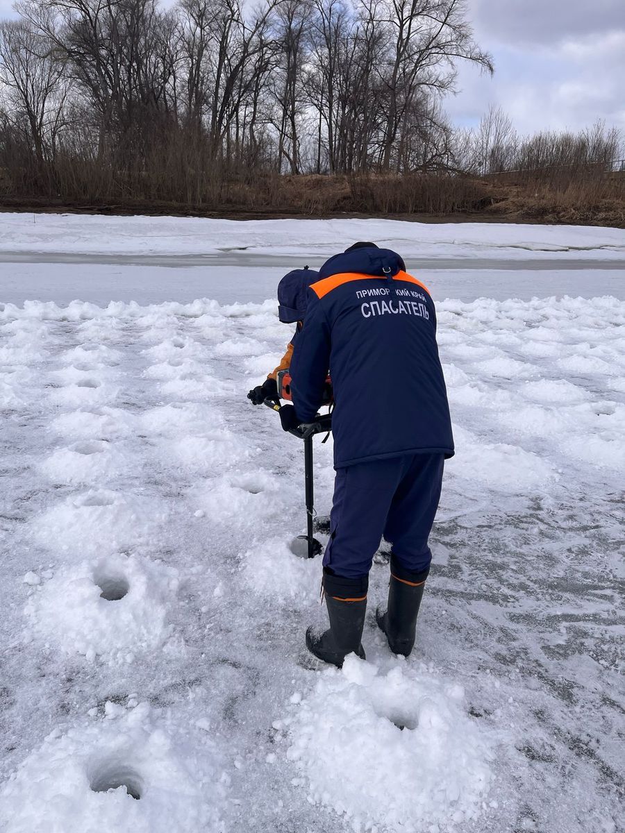 Как сообщили в министерстве по делам ГОЧС, в селе Яковлевка выше моста на реке Арсеньевке краевая поисково-спасательная служба проводит работы по ослаблению ледяного покрова.