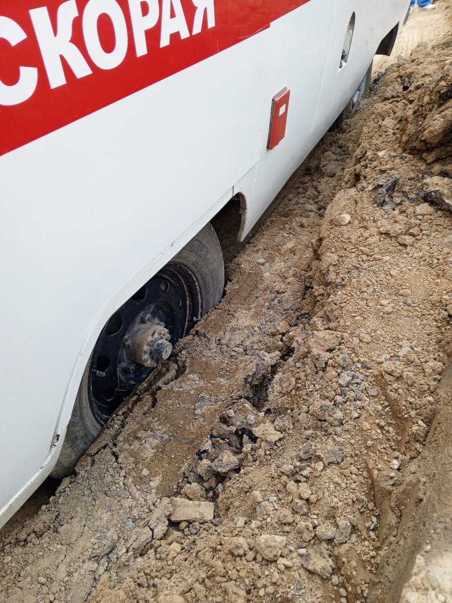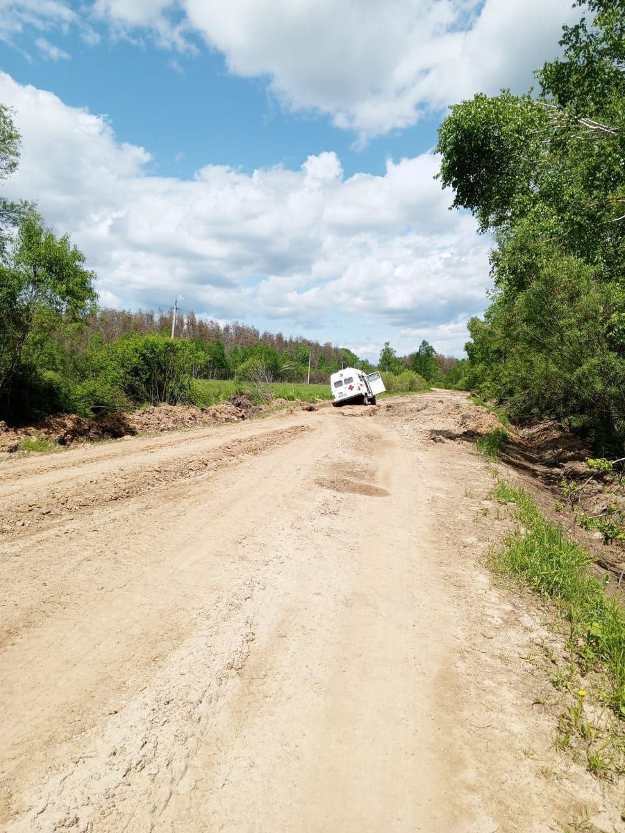 «Скорую вызвали к женщине с сердечным приступом. Но она никуда не доехала. Скорая сидит в канаве, вот такая у нас прекрасная дорога», – говорит автор видео.
