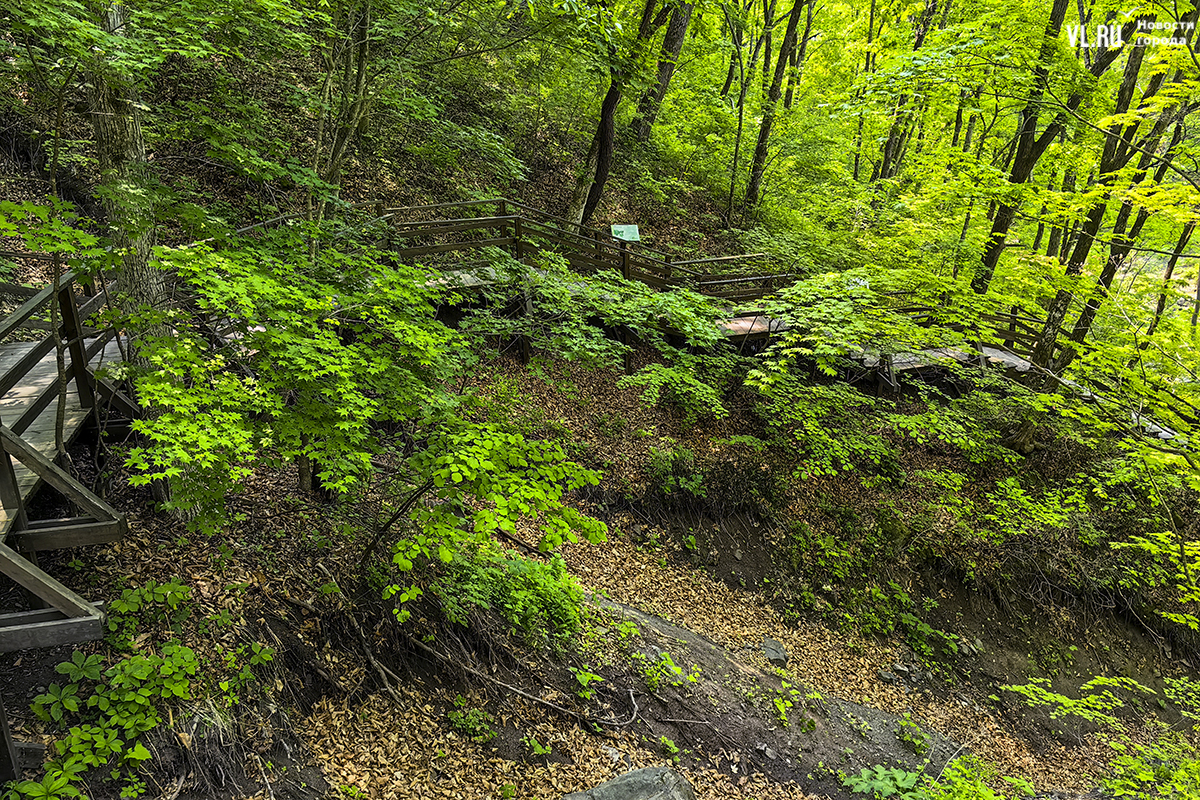 Общая протяжённость экотропы сейчас составляет примерно полкилометра. В начале её установлены беседки, туалет и киоски с едой. Правда, бывшая поляна парковки, которая не относится к нацпарку, сейчас занята строительной техникой и грунтом для ремонта трассы Раздольное – Хасан.