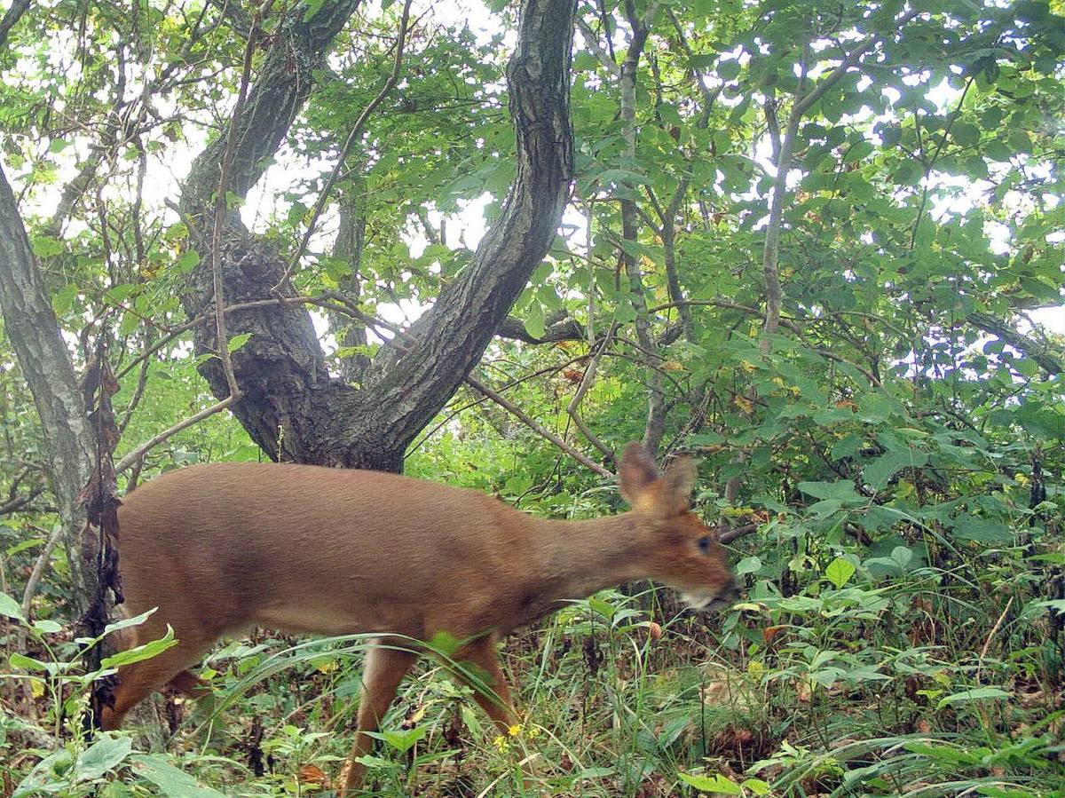 Самец водяного оленя попал в фотоловушку на вершине острова Фуругельма, который входит в состав Дальневосточного морского заповедника. На уникальном кадре олень проходит мимо камеры и выглядит здоровым. Также следы водяного оленя были найдены в бухте Северная. Позднее научный сотрудник «Земли леопарда» снял самку на ручную камеру.