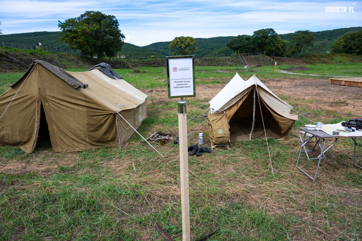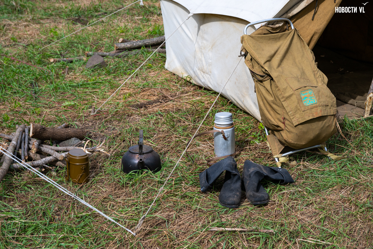 Первая остановка – выставка под открытым небом. Организаторы попытались показать быт советских археологов. Те жили в брезентовых палатках, а готовили на костре. Термос, чайник, рюкзак, куртки-энцефалитки, ватный спальный мешок – просушить такой было целым делом. И полевые карты на походном столике.