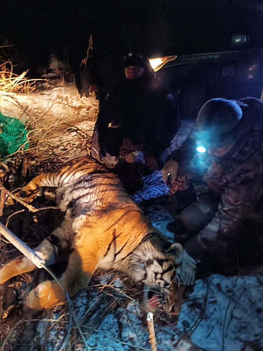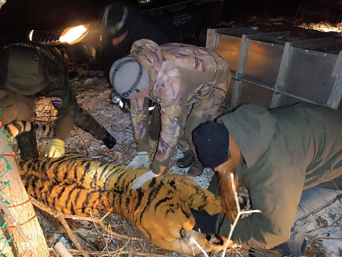 Ночью 26 декабря в Барабаше на юге Приморья отловили конфликтного тигра, который 24 декабря охотился здесь на собак. Хищника, молодого упитанного самца, доставили в центр «Тигр», где его осмотрят и определят его дальнейшую судьбу.