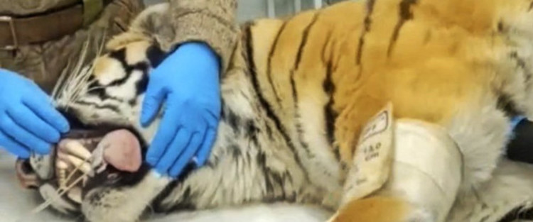 Напомним, тигра отловили за то, что он охотился на собак вблизи села. Молодой самец, отловленный накануне, абсолютно здоров. Ему около трёх лет, вес – 135 кг, травм не обнаружено.