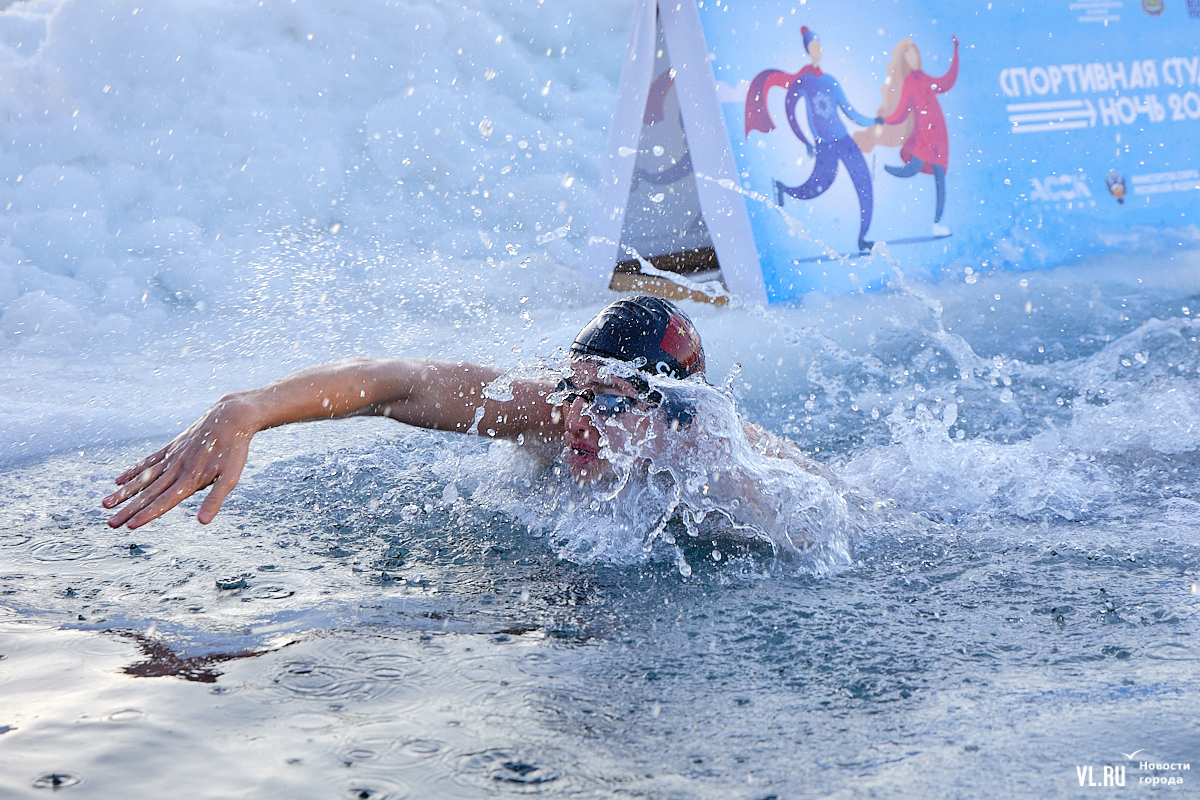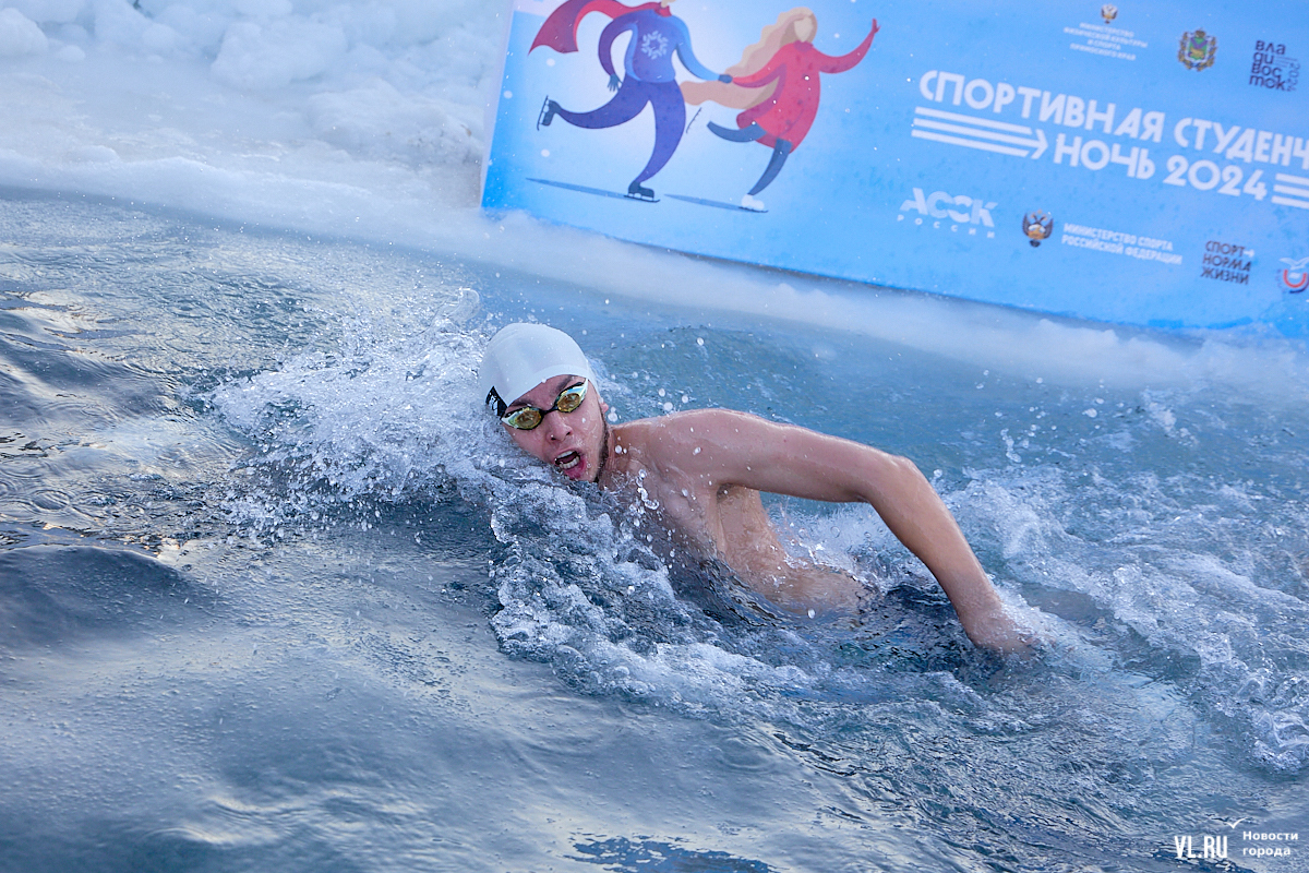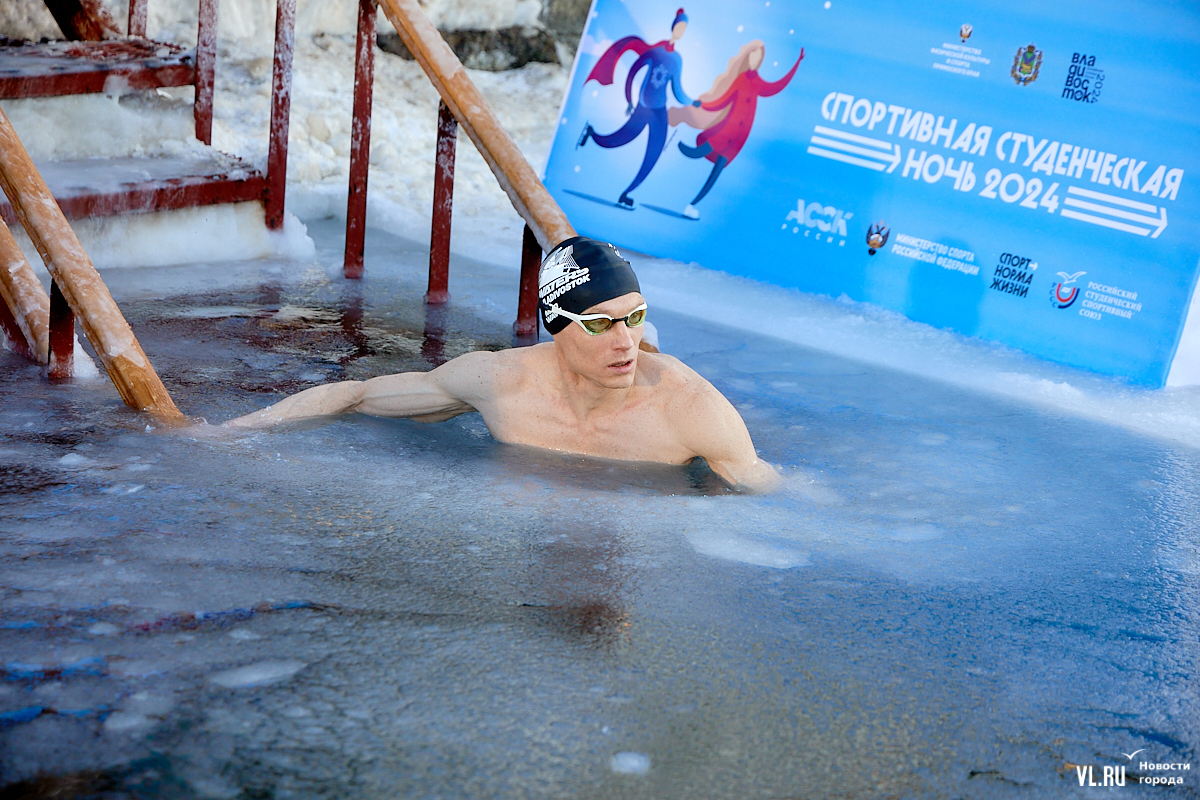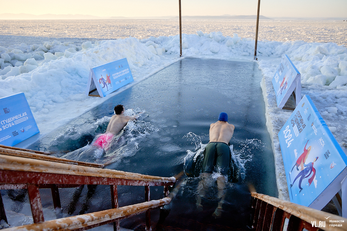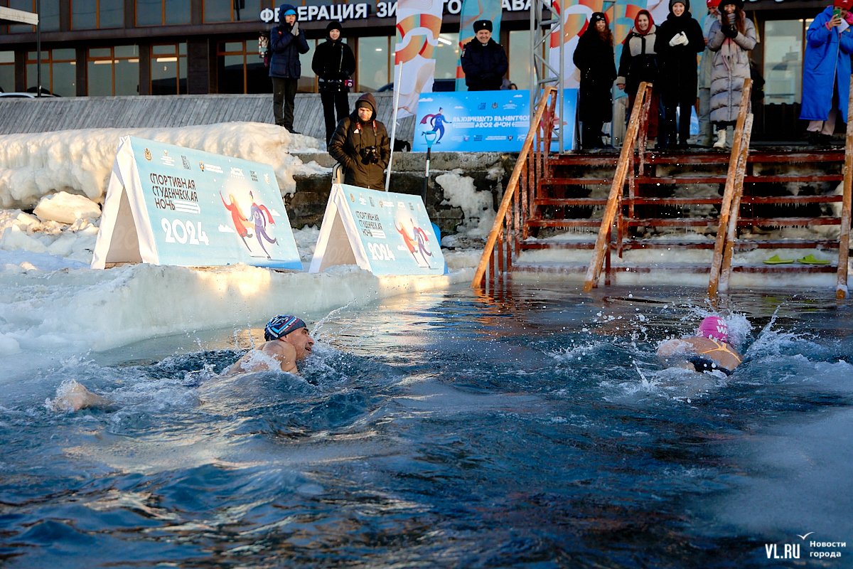 В четверг, 25 января, в честь Дня студента состоялись соревнования по зимнему плаванию в проруби у спортивного клуба «Косатка ДВ». Участие в них приняли студенты и преподаватели ДВФУ, ВВГУ, ТГМУ и академии МЧС. Многие из них впервые оказались в ледяном море – температура воды была -1,5 °С. Смельчаков пришли поддержать родители, друзья и даже китайские туристы, которые были в восторге от происходящего.