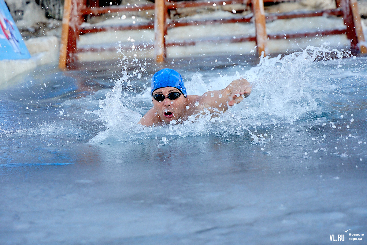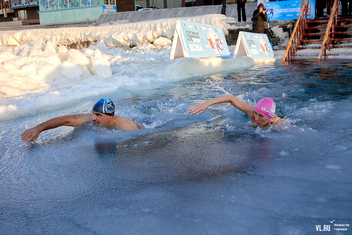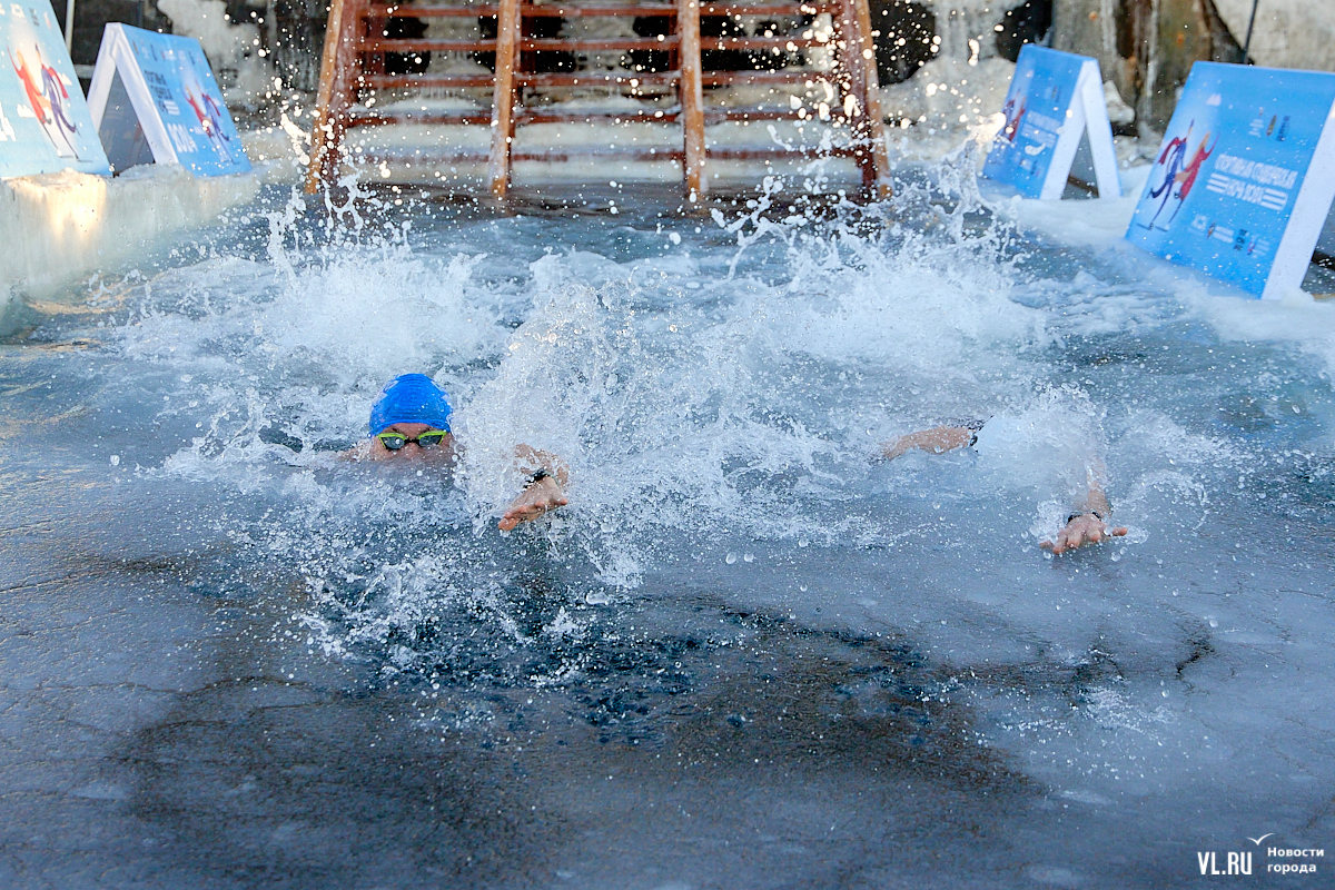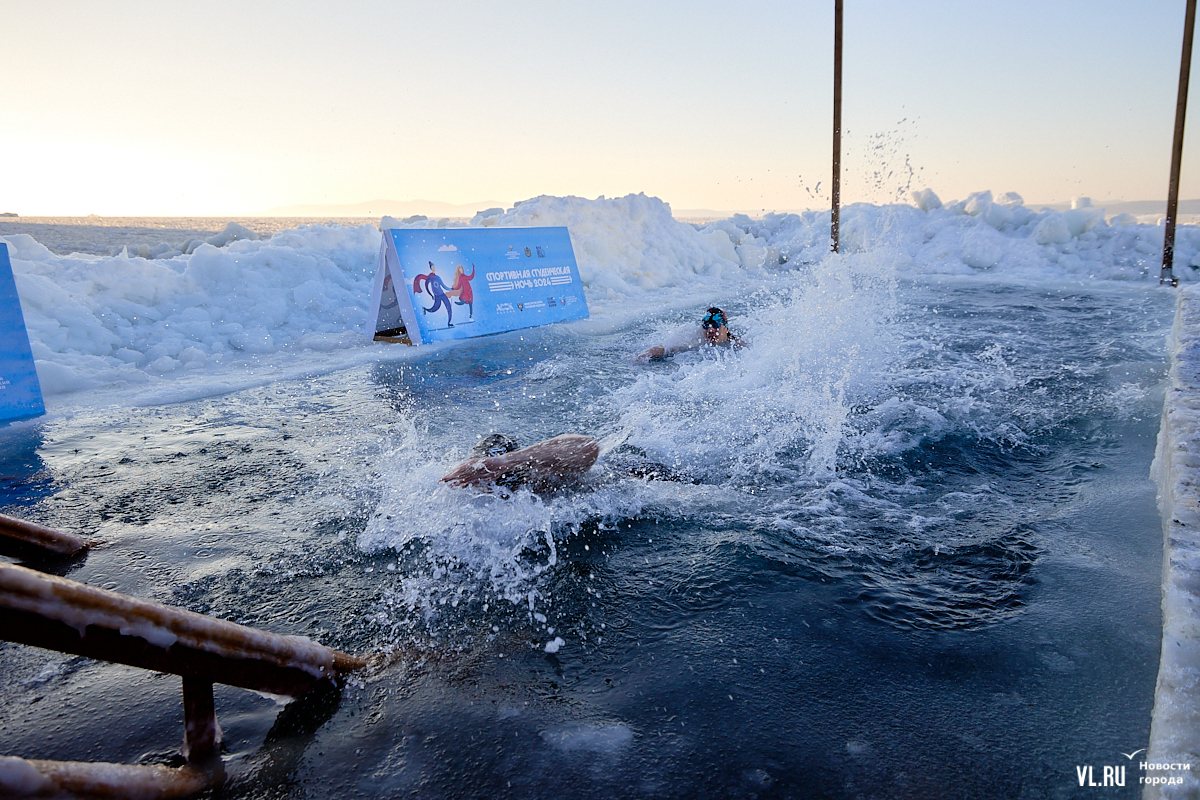 Соревнования должны были пройти в новом бассейне под открытым небом на пляже «Юбилейный», однако неожиданно для всех мероприятие перенесли в спортивный клуб «Косатка ДВ» – сказали, что бассейн замёрз. Плавать участникам пришлось в проруби.