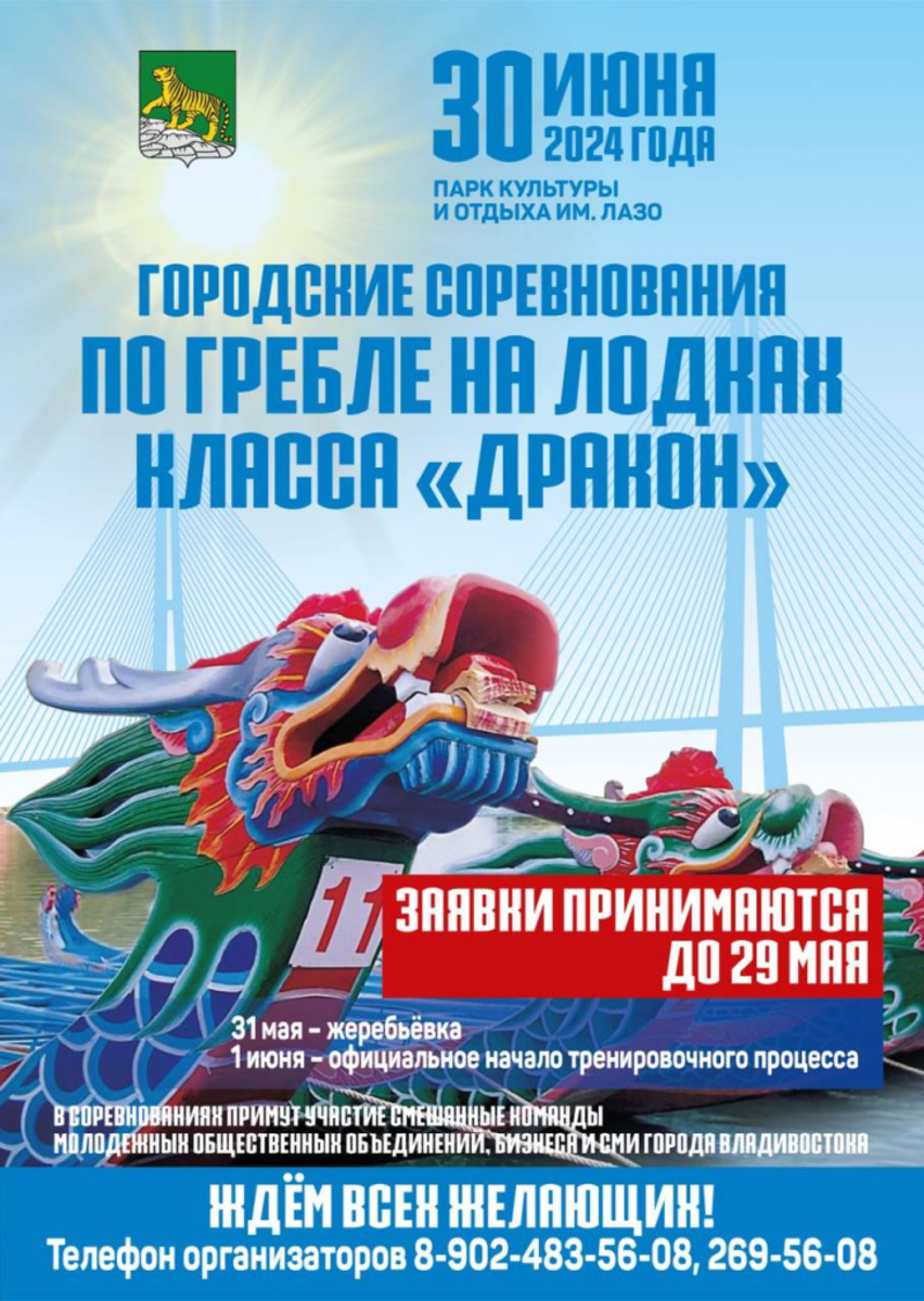 30 июня на акватории парка культуры и отдыха им. Лазо состоятся ежегодные городские соревнования по гребле на лодках «Дракон». Принять участие в них приглашают спортсменов-любителей. Заявки на участие принимаются до 29 мая.
