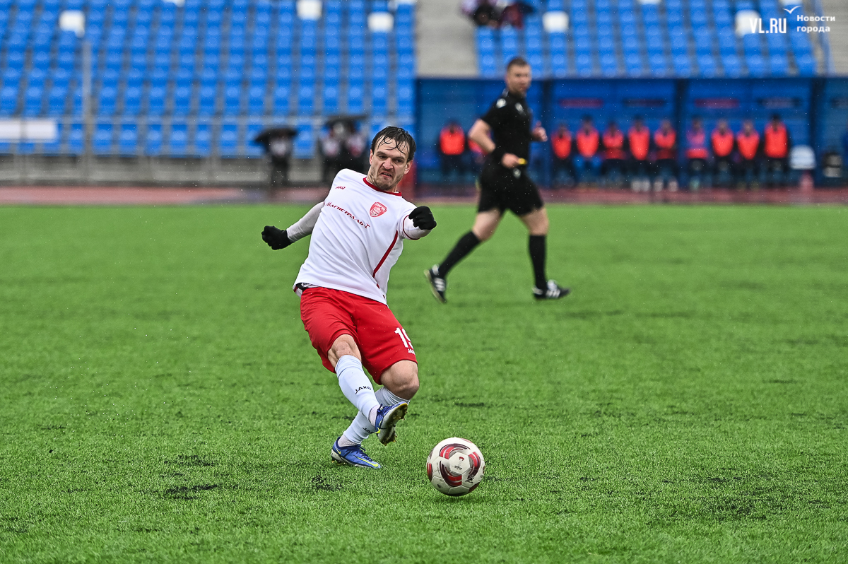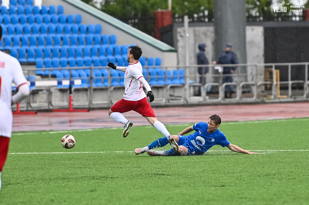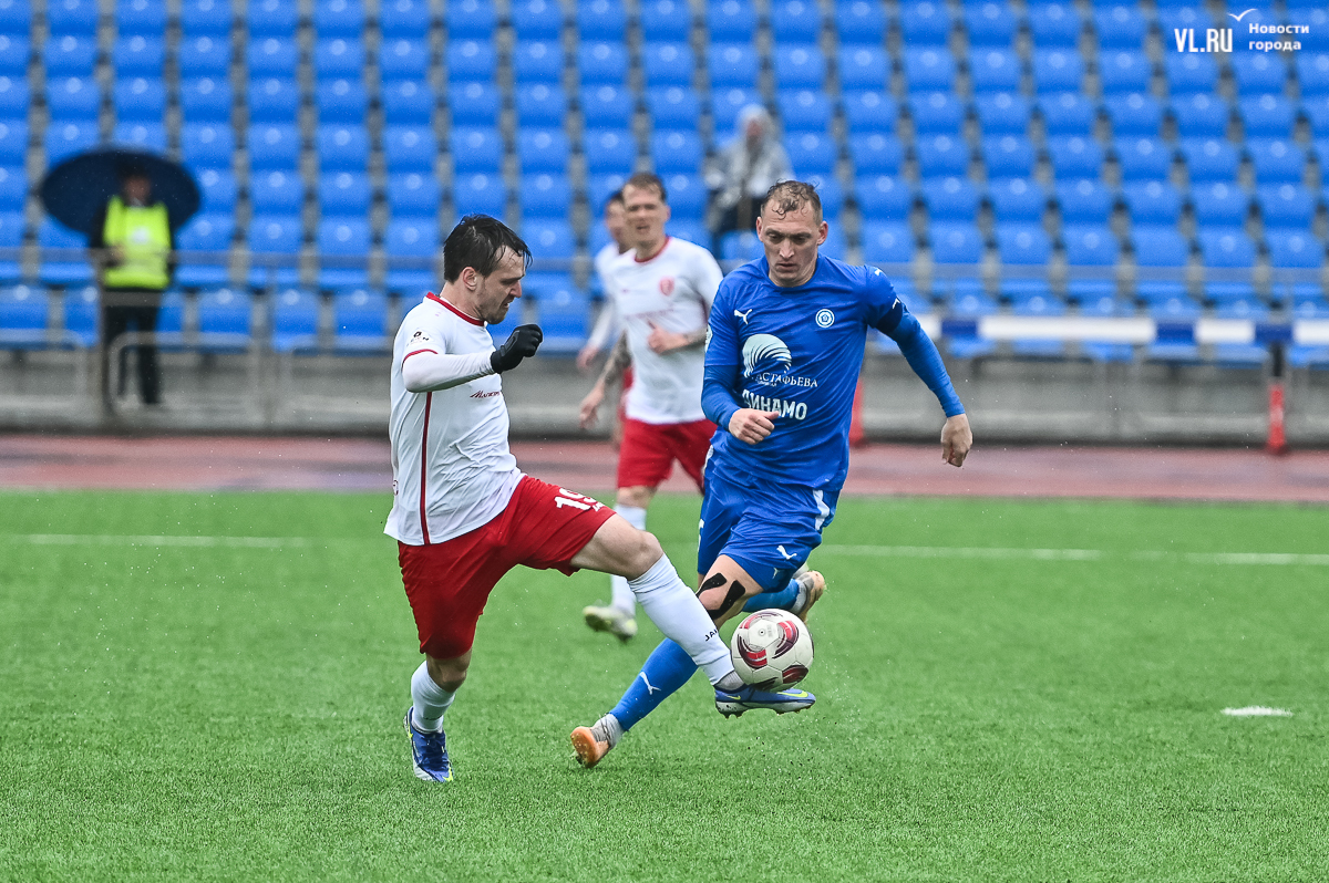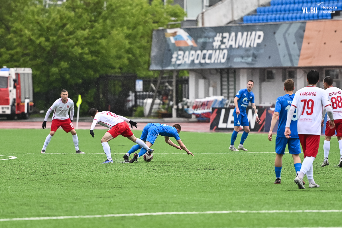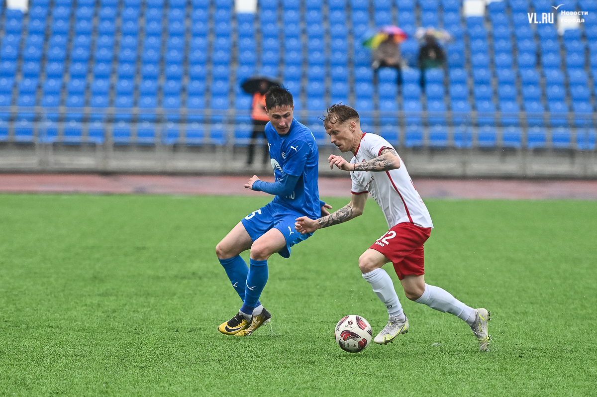 Коррективы в игру внёс обрушившийся на приморскую столицу ливень, однако, несмотря на это, команды сразу же задали игре высокий темп с обилием подкатов, единоборств и острых моментов. «Красно-белые» были чуть активнее в дебюте встречи и уже на 11-й минуте проверили на прочность Евгения Арчибасова. За пределами штрафной зоны лучший бомбардир Евгеньев исполнил мощный удар, но наш вратарь вытащил мяч из-под перекладины.