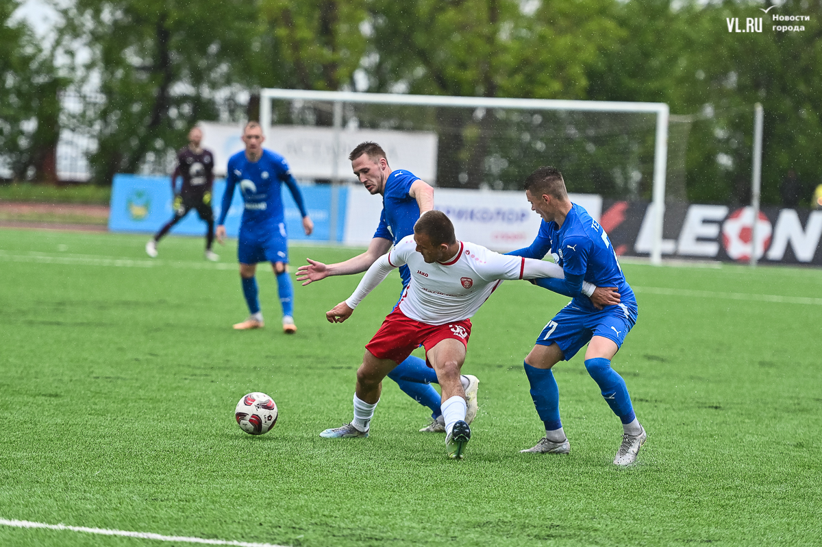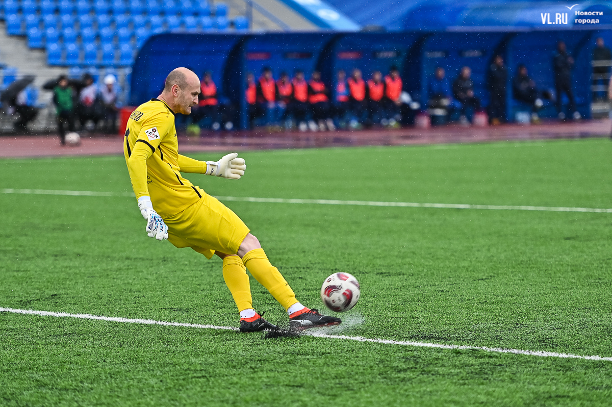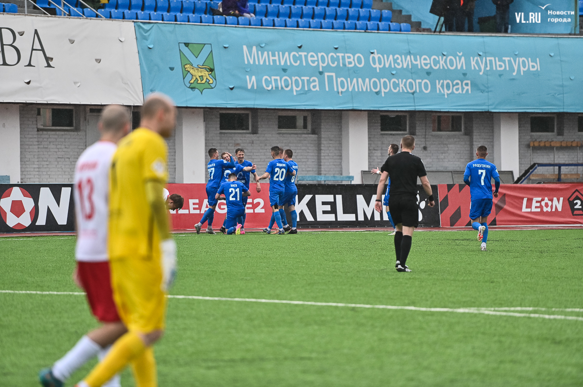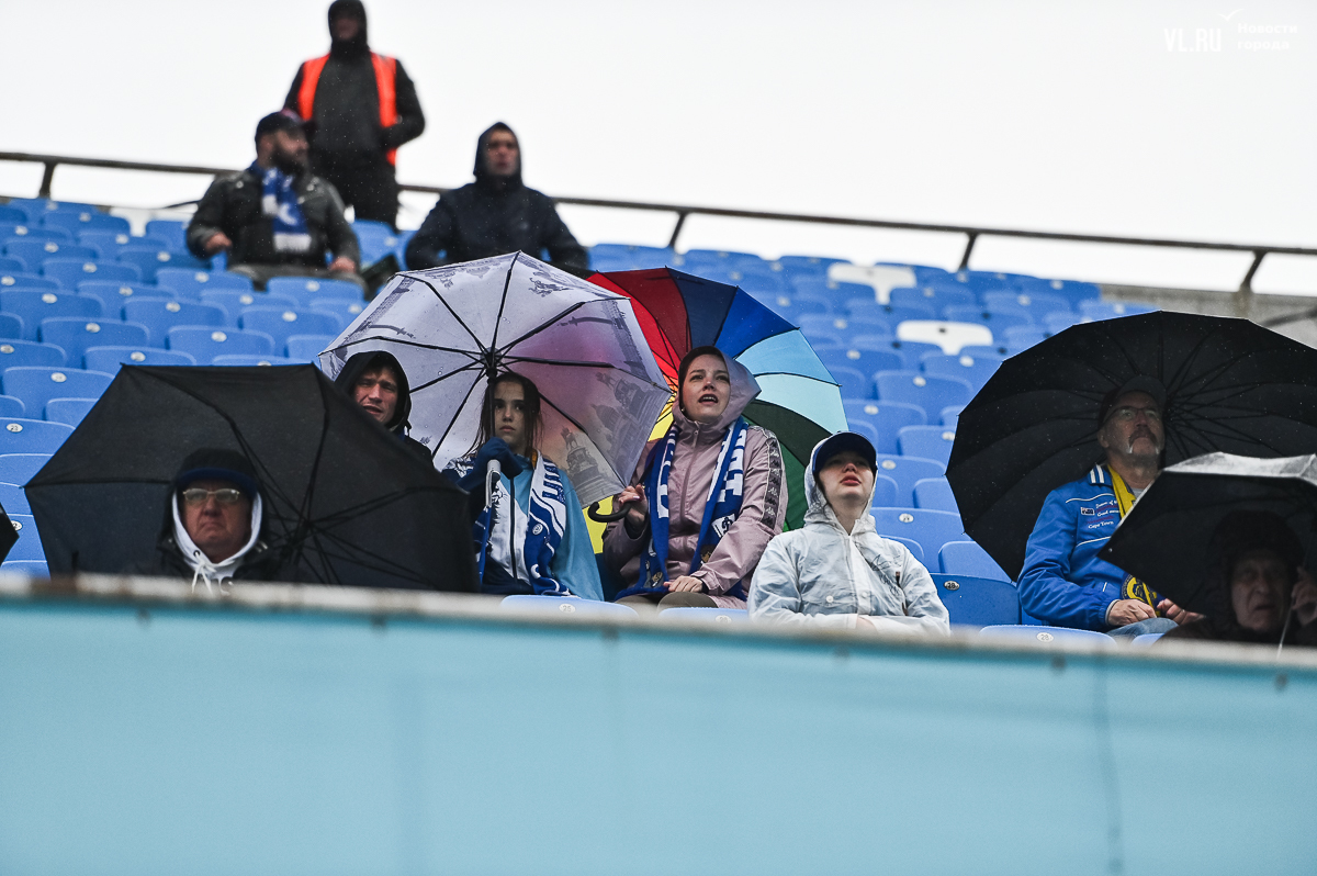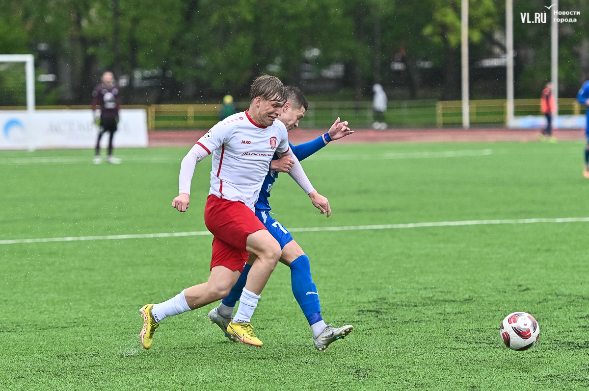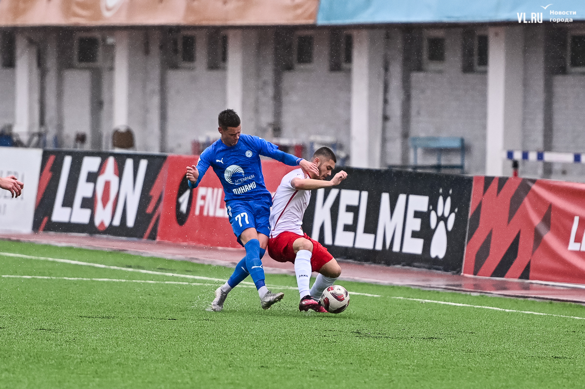 Коррективы в игру внёс обрушившийся на приморскую столицу ливень, однако, несмотря на это, команды сразу же задали игре высокий темп с обилием подкатов, единоборств и острых моментов. «Красно-белые» были чуть активнее в дебюте встречи и уже на 11-й минуте проверили на прочность Евгения Арчибасова. За пределами штрафной зоны лучший бомбардир Евгеньев исполнил мощный удар, но наш вратарь вытащил мяч из-под перекладины.