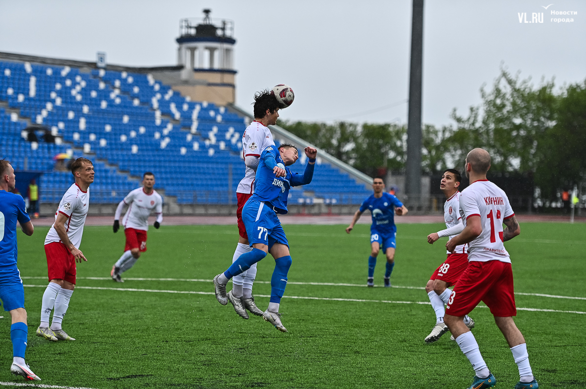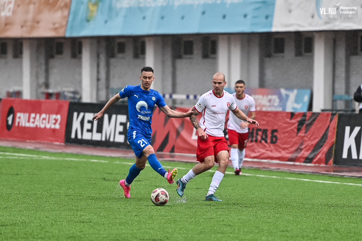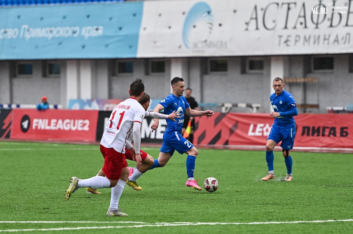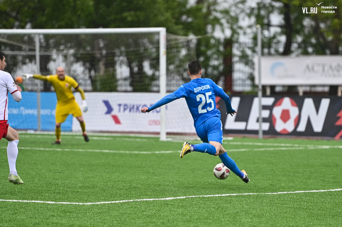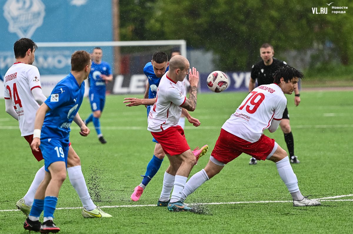 Коррективы в игру внёс обрушившийся на приморскую столицу ливень, однако, несмотря на это, команды сразу же задали игре высокий темп с обилием подкатов, единоборств и острых моментов. «Красно-белые» были чуть активнее в дебюте встречи и уже на 11-й минуте проверили на прочность Евгения Арчибасова. За пределами штрафной зоны лучший бомбардир Евгеньев исполнил мощный удар, но наш вратарь вытащил мяч из-под перекладины.