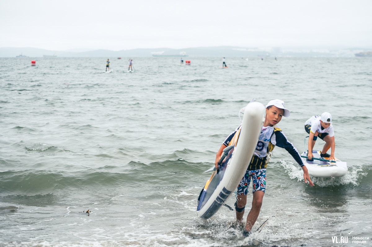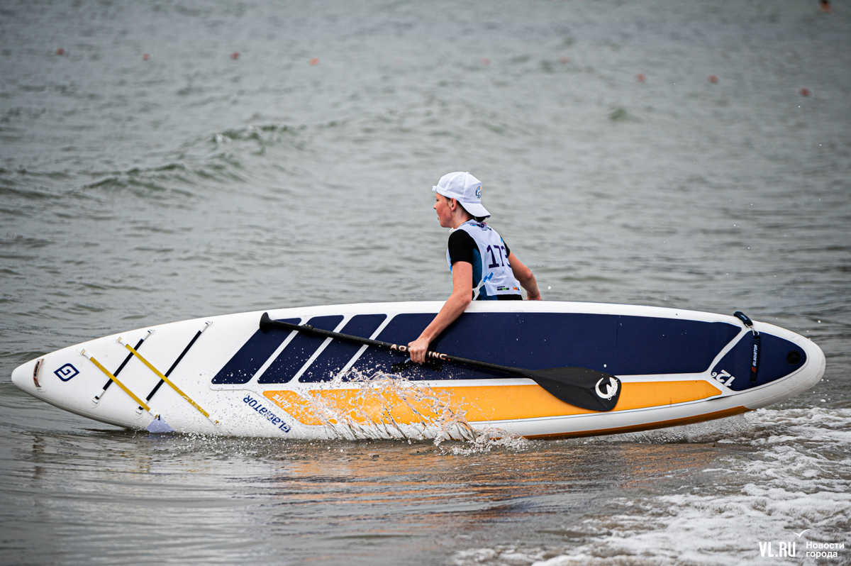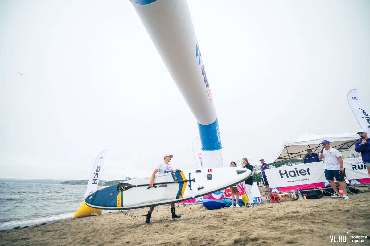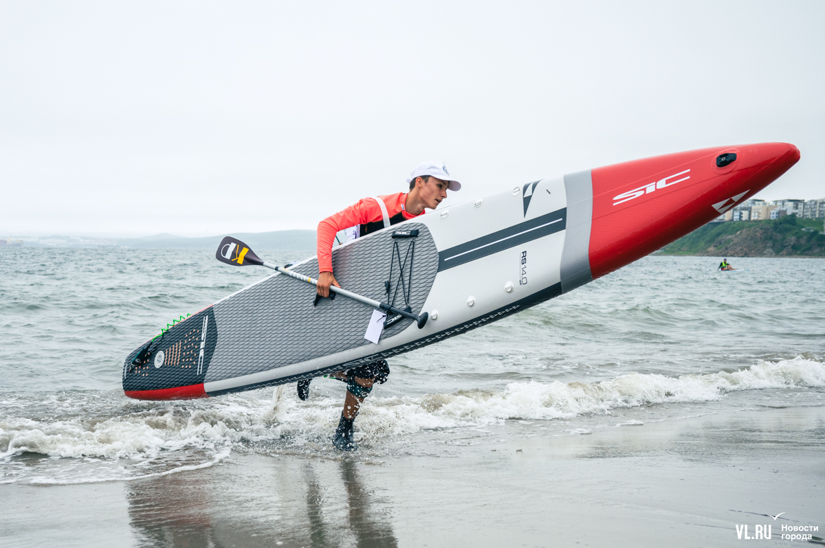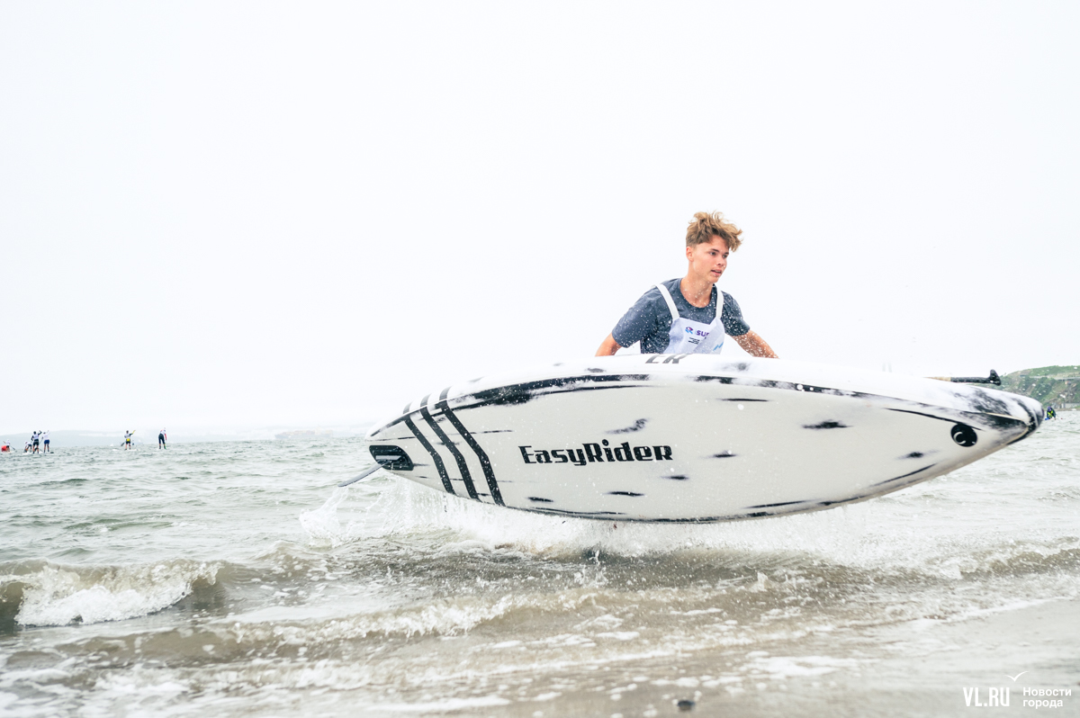 Следующие старты получились драматичнее – из-за досадной случайности двукратный чемпион Приморья Максим Марков пришёл третьим. Напомним, накануне он вёл здесь мастер-класс для детей. Ну, а сегодня у Максима получилась уникальная гонка – из-за неправильно собранного оборудования большую часть дистанции он прошёл практически без фина. Это плавник, от которого сильно зависит стабильность доски, удержание её на курсе. В какой-то момент фин отстегнулся и никак не помогал. При этом Максим всё-таки умудрился прийти третьим.