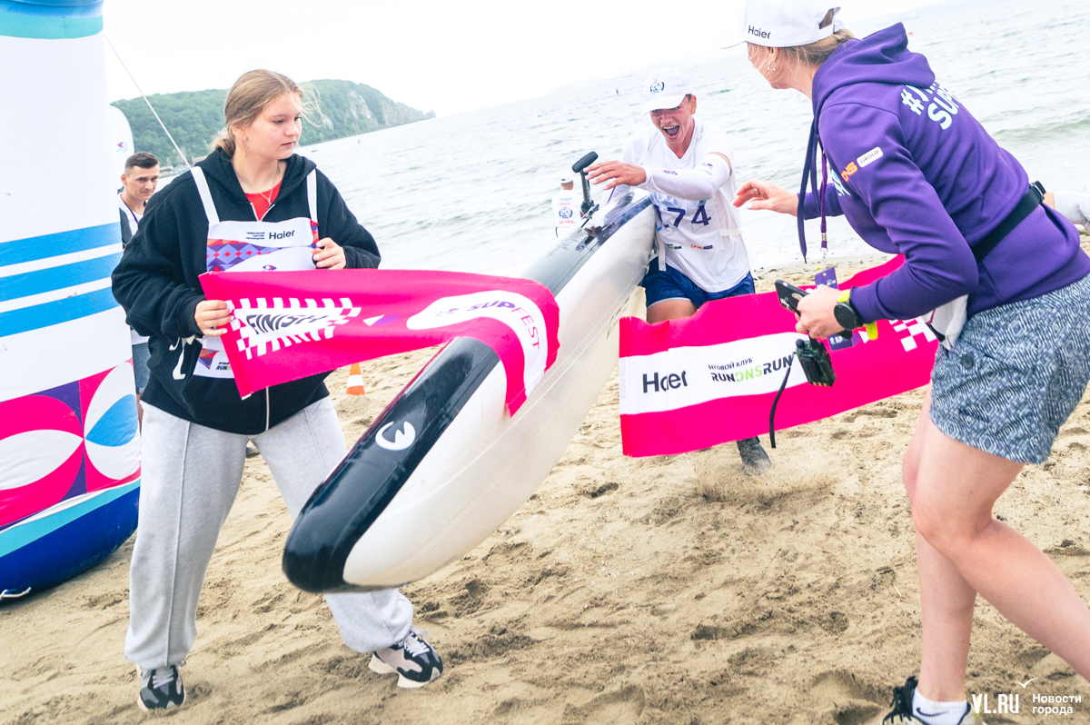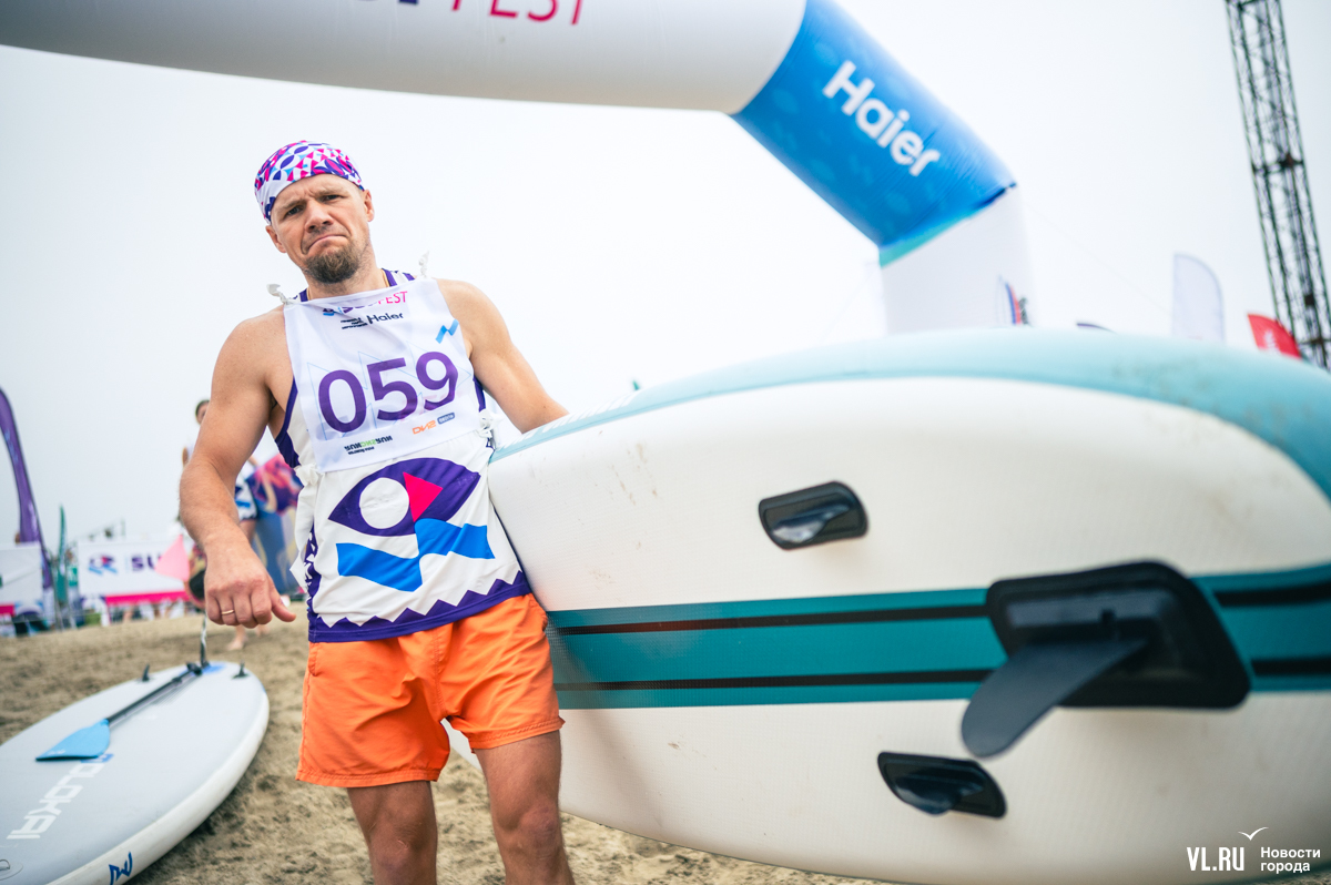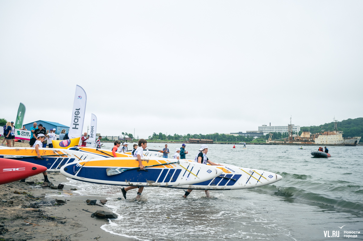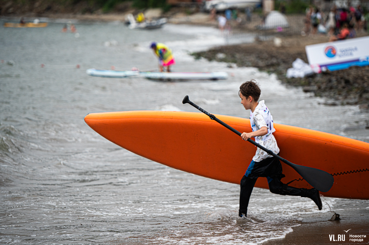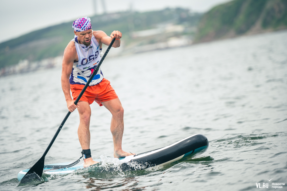 Следующие старты получились драматичнее – из-за досадной случайности двукратный чемпион Приморья Максим Марков пришёл третьим. Напомним, накануне он вёл здесь мастер-класс для детей. Ну, а сегодня у Максима получилась уникальная гонка – из-за неправильно собранного оборудования большую часть дистанции он прошёл практически без фина. Это плавник, от которого сильно зависит стабильность доски, удержание её на курсе. В какой-то момент фин отстегнулся и никак не помогал. При этом Максим всё-таки умудрился прийти третьим.