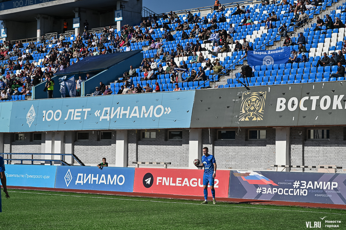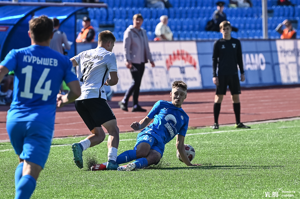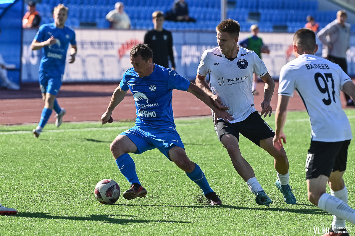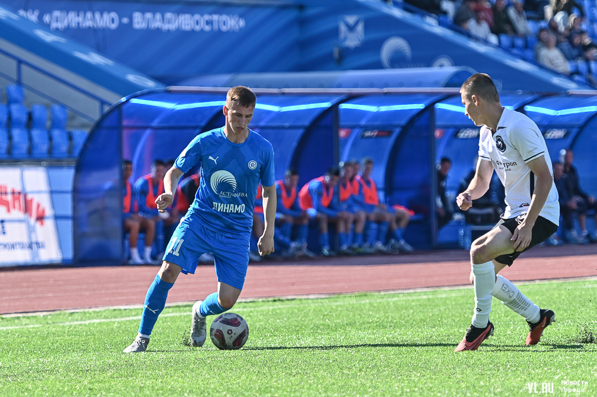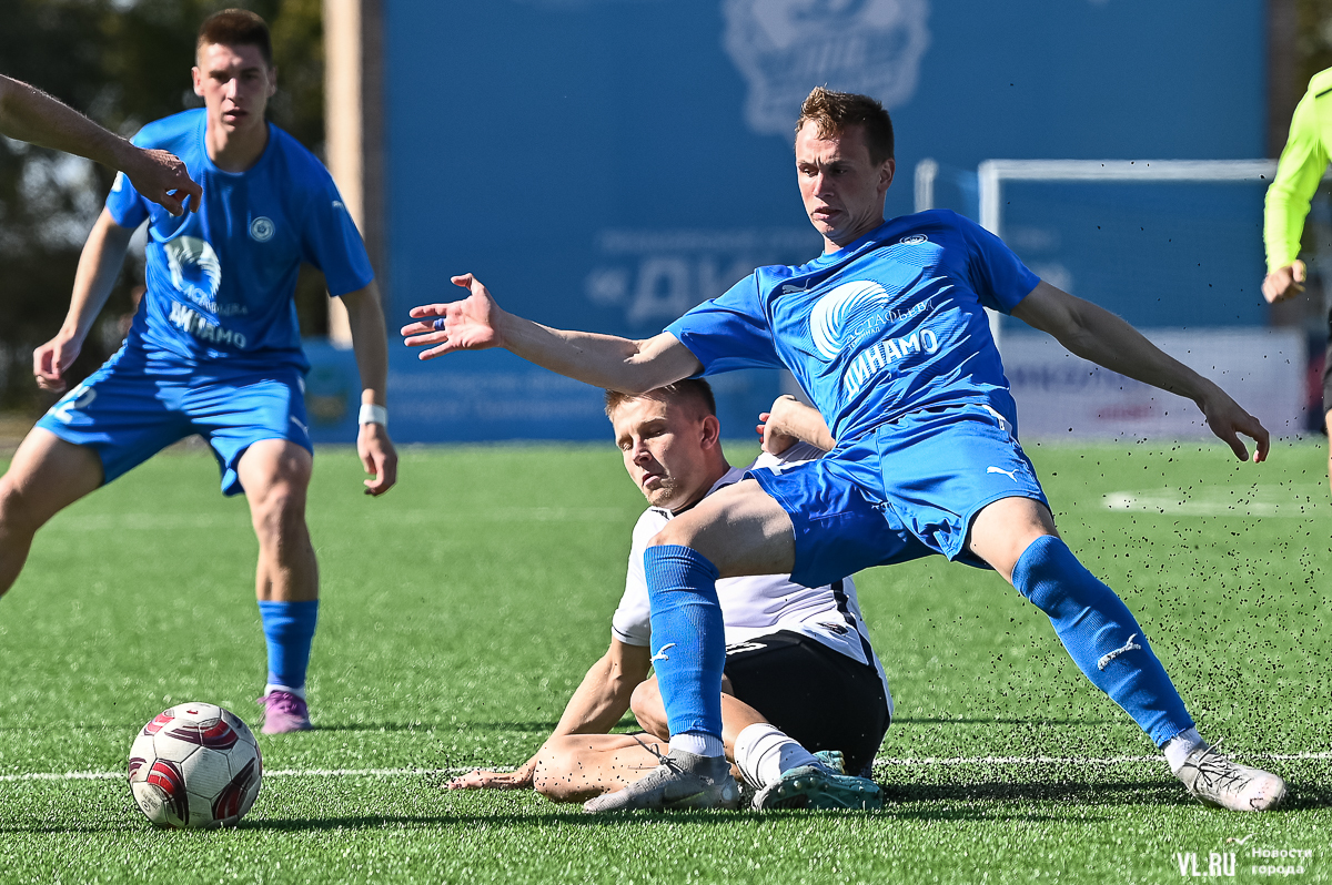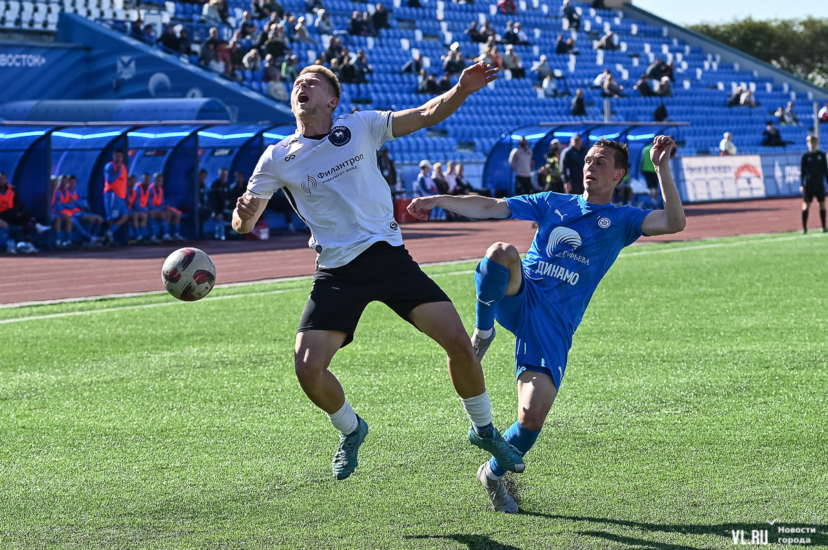 Футбольный клуб «Динамо-Владивосток» на домашнем стадионе в центральном матче 27-го тура Второй лиги «Б» в меньшинстве обыграл со счётом 2:1 вторую команду чемпионата, подмосковный «Космос», и уже в следующем поединке может досрочно оформить чемпионство в группе 3. Победный гол на 90-й минуте забил защитник Виктор Курышев.