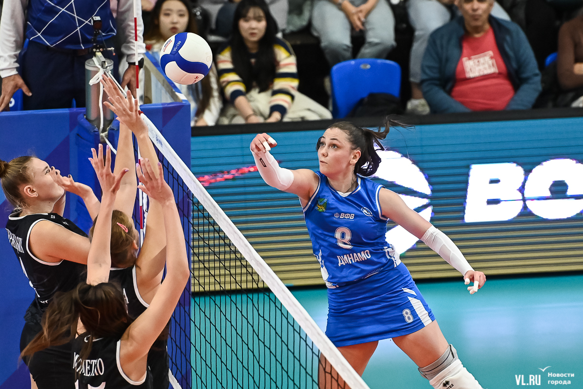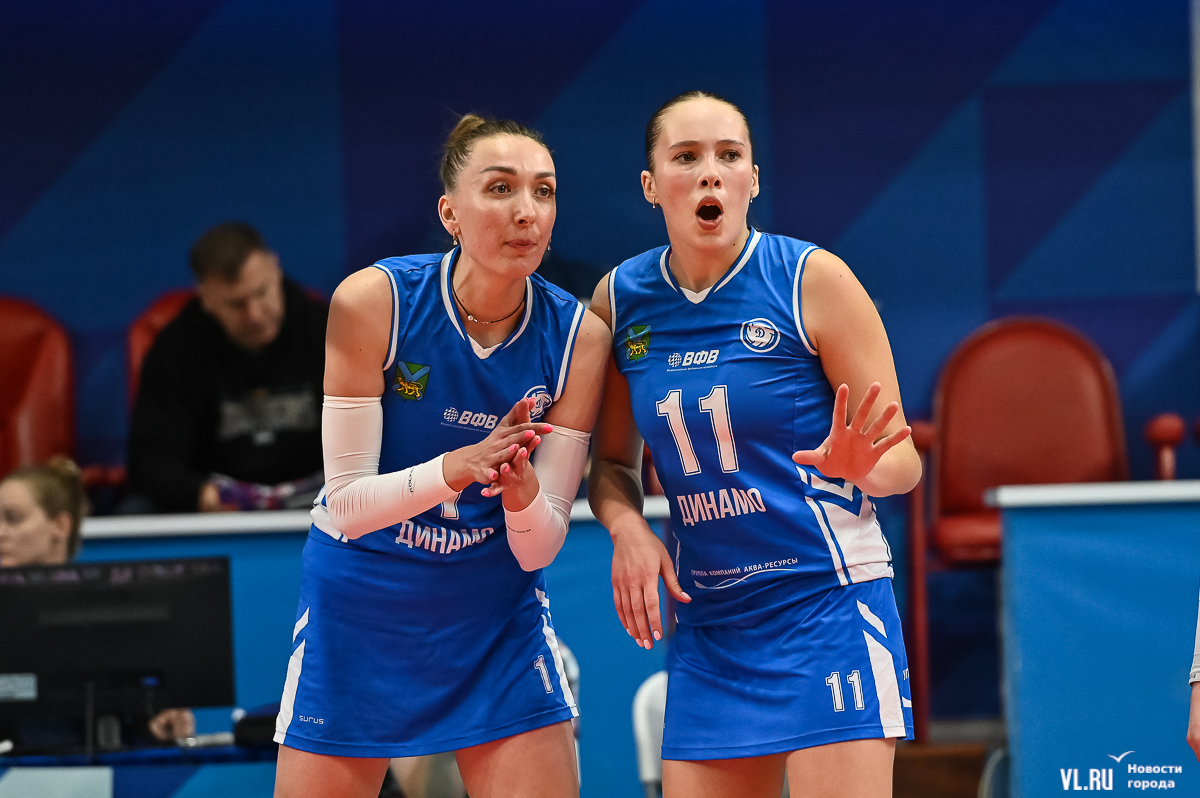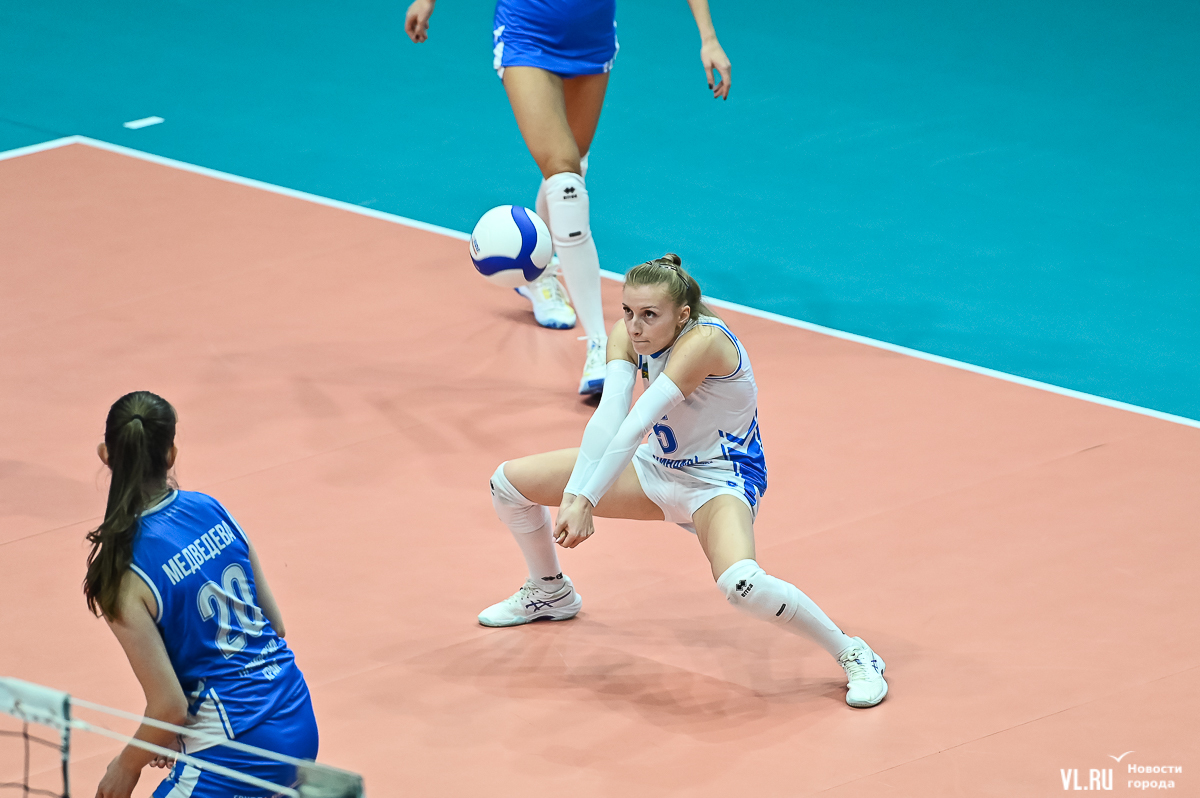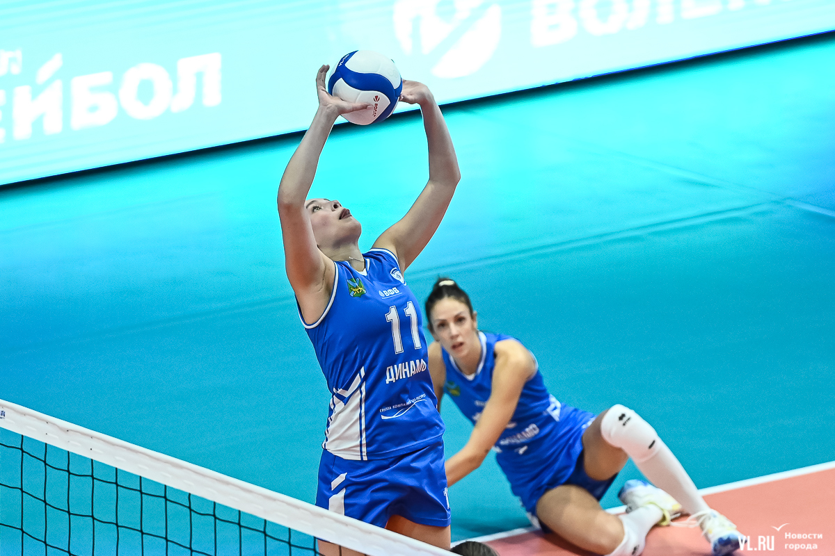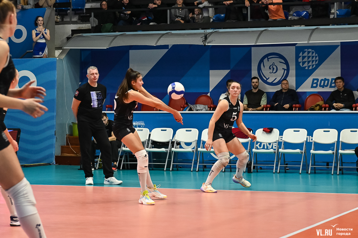 Зал «Олимпийца» в дни игр женской команды «Динамо» превратился в яркую волейбольную площадку. Стартовый состав «Динамо» на первый матч третьего тура во Владивостоке выглядел следующим образом: в диагонали – Чикириз, связующая – Погорельченко, блокирующие – Откидычева и Медведева, в доигровке – Велисевич и Жэнь, либеро – Февралёва и Сулимова.