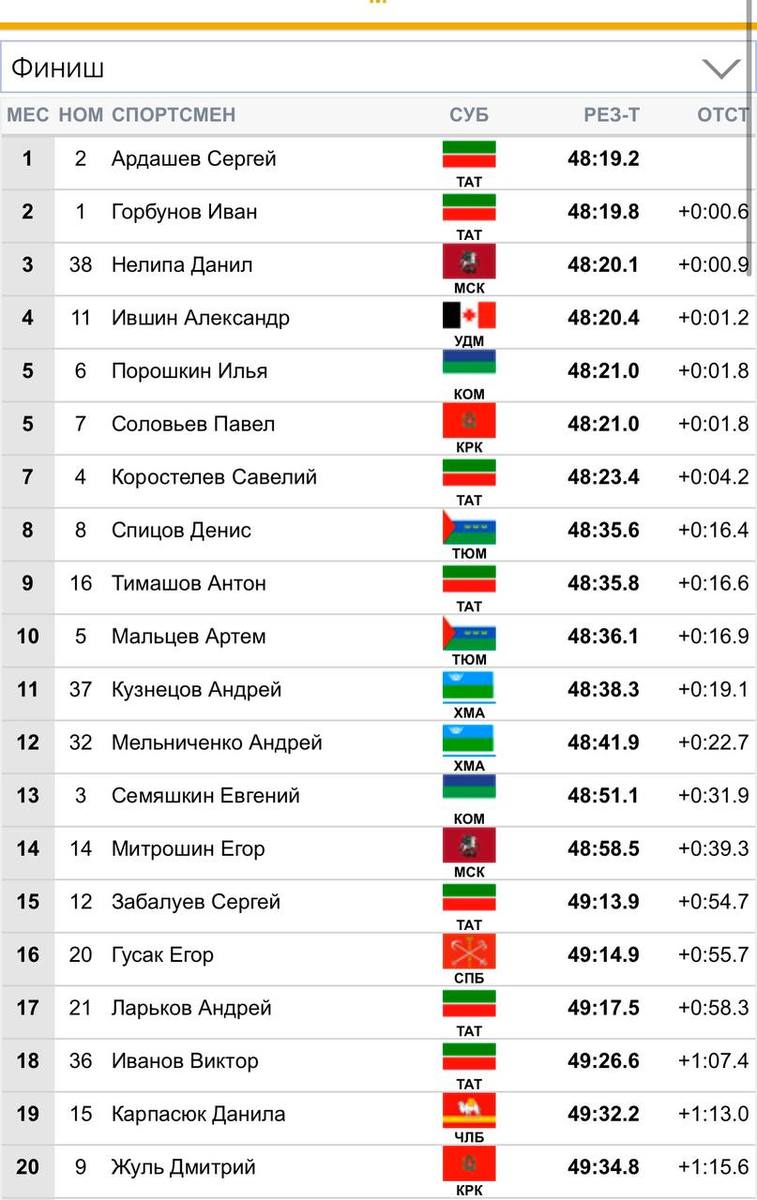 Как сообщили в региональном министерстве физической культуры и спорта, приморский лыжник продемонстрировал выдающийся результат. На финишной прямой после 20 километров выбрал верную тактику и смог обойти сильных соперников и финишировать третьим. Ранее среди мужчин таких результатов из приморских лыжников никто не показывал. Наш земляк уступил лидеру Сергею Ардашеву из Татарстана всего 0,9 секунды. Второе место занял Иван Горбунов из Татарстана (+0,6 секунды).