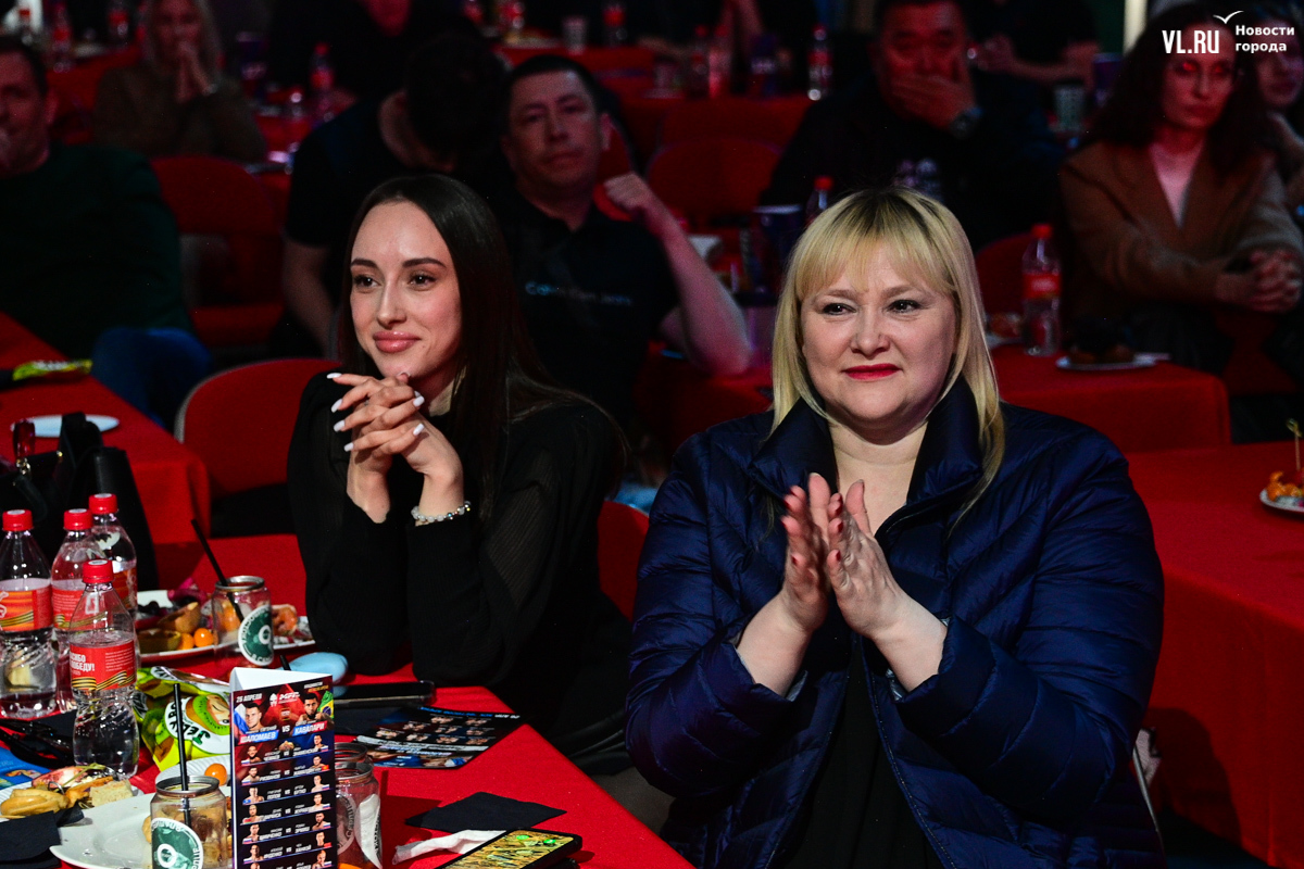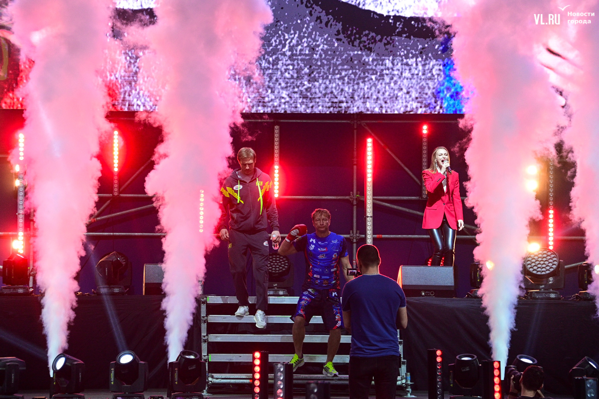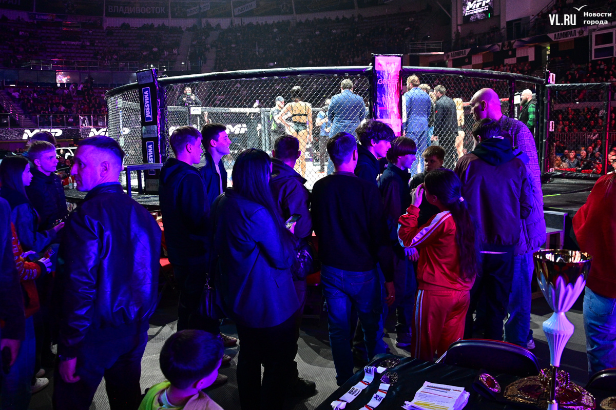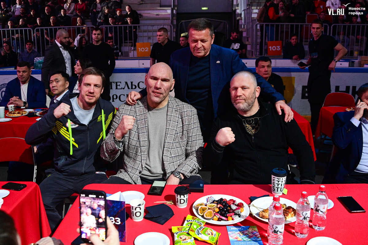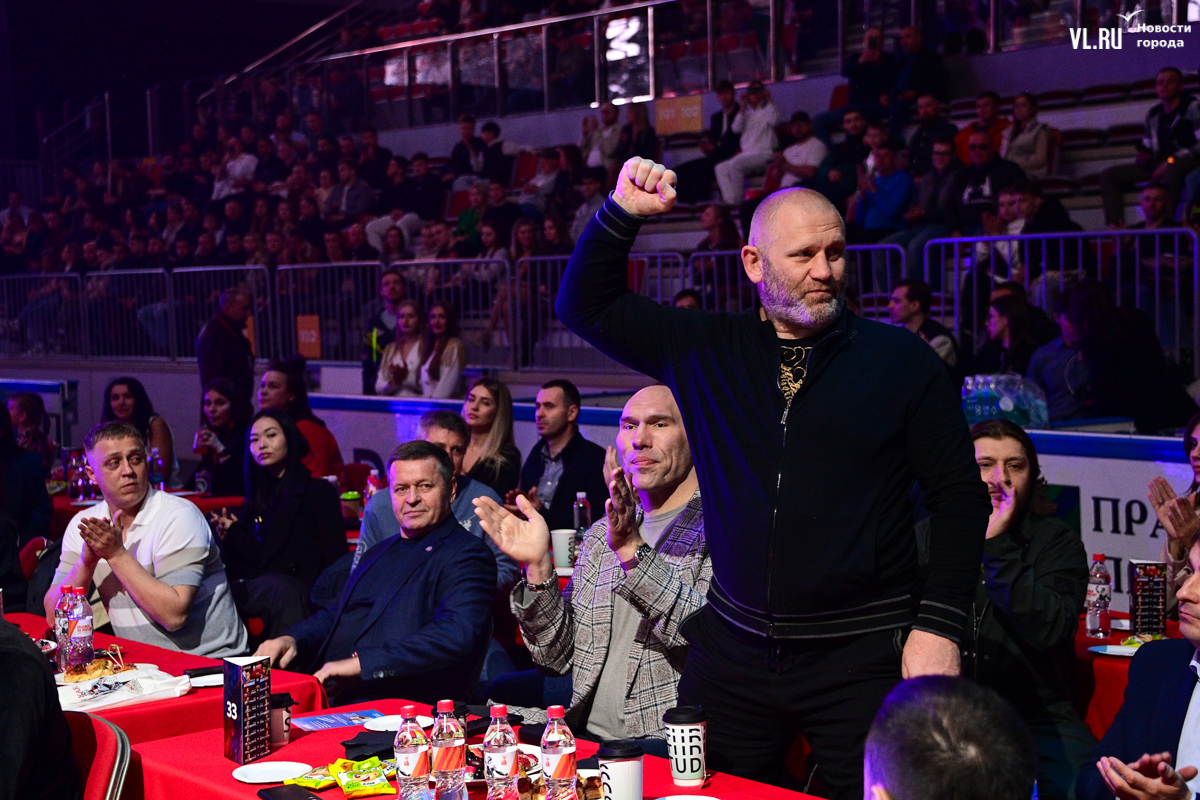 Бои проходили практически без перерывов. Пока одних бойцов уводили с ринга, к выходу готовились уже другие спортсмены. Однако главным героем вечера были не они, а Николай Валуев, с которым все хотели сфотографироваться и не давали ему прохода. Но отказать он не мог, и поэтому фотографировался, расписывался на перчатках и даже поговорил с корреспондентом Новостей VL.ru.