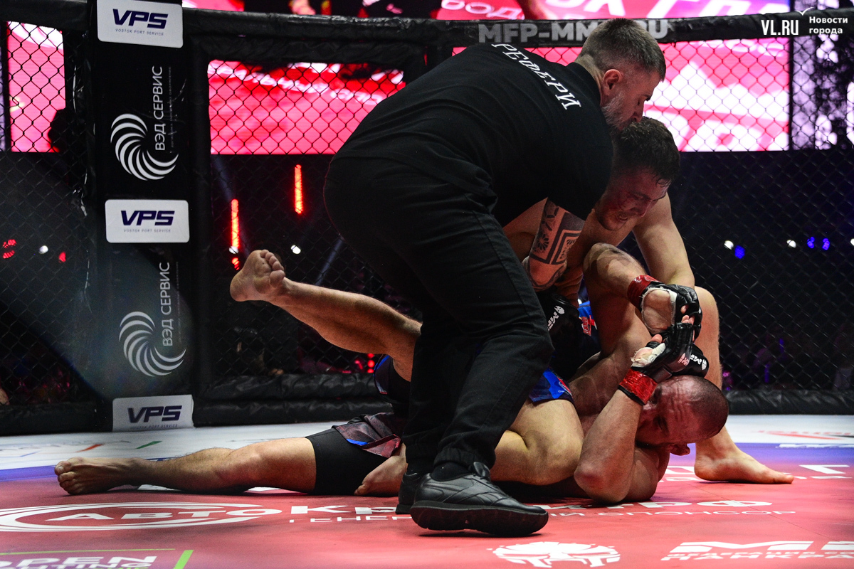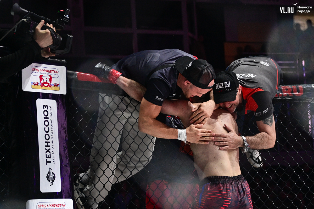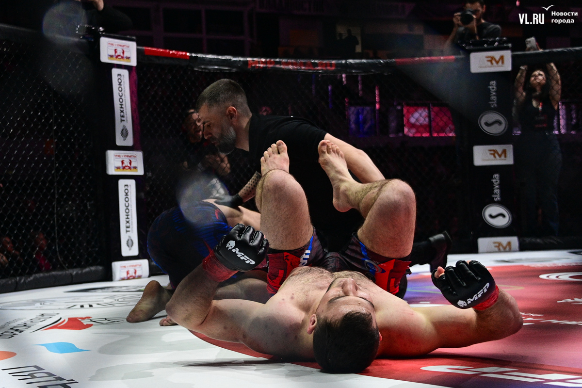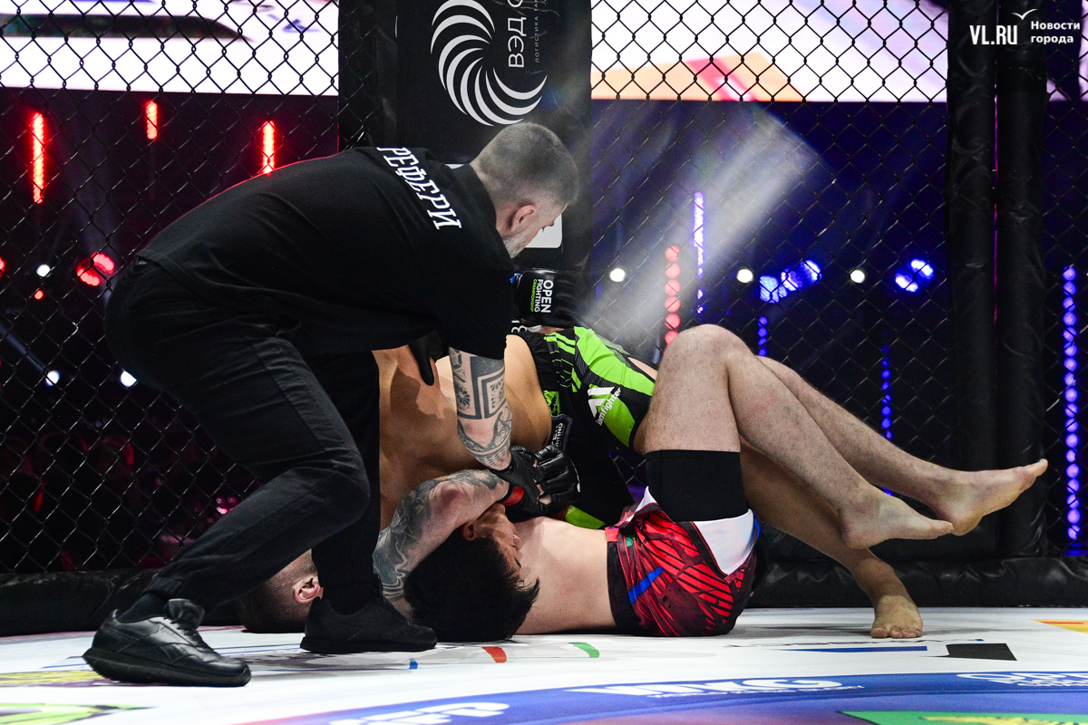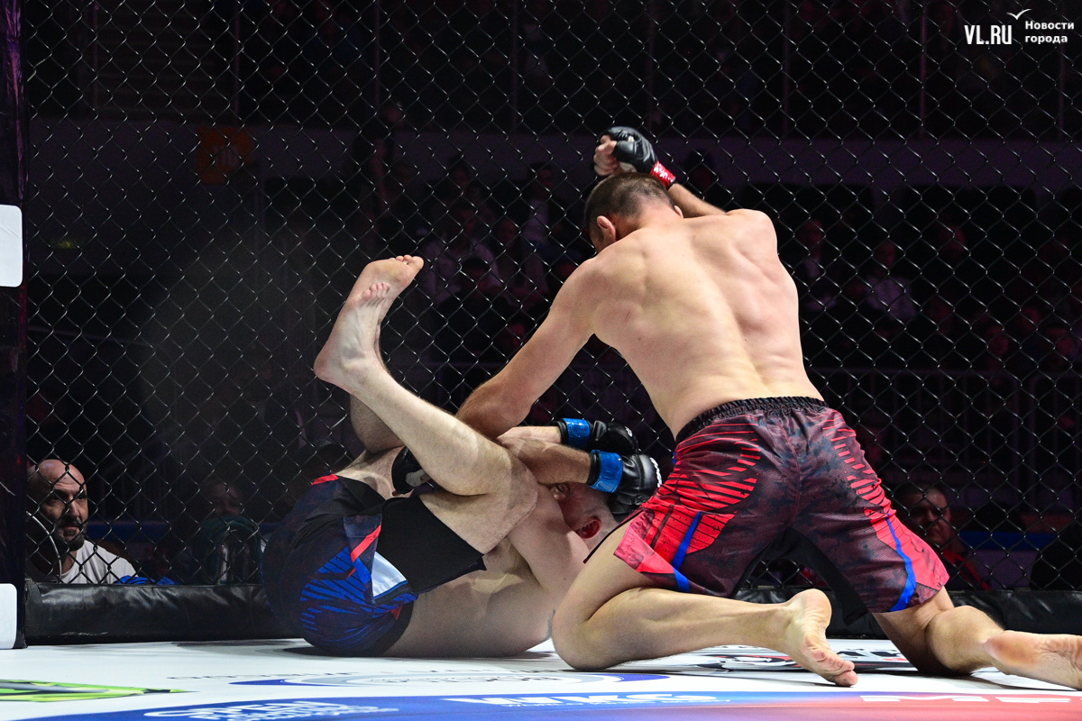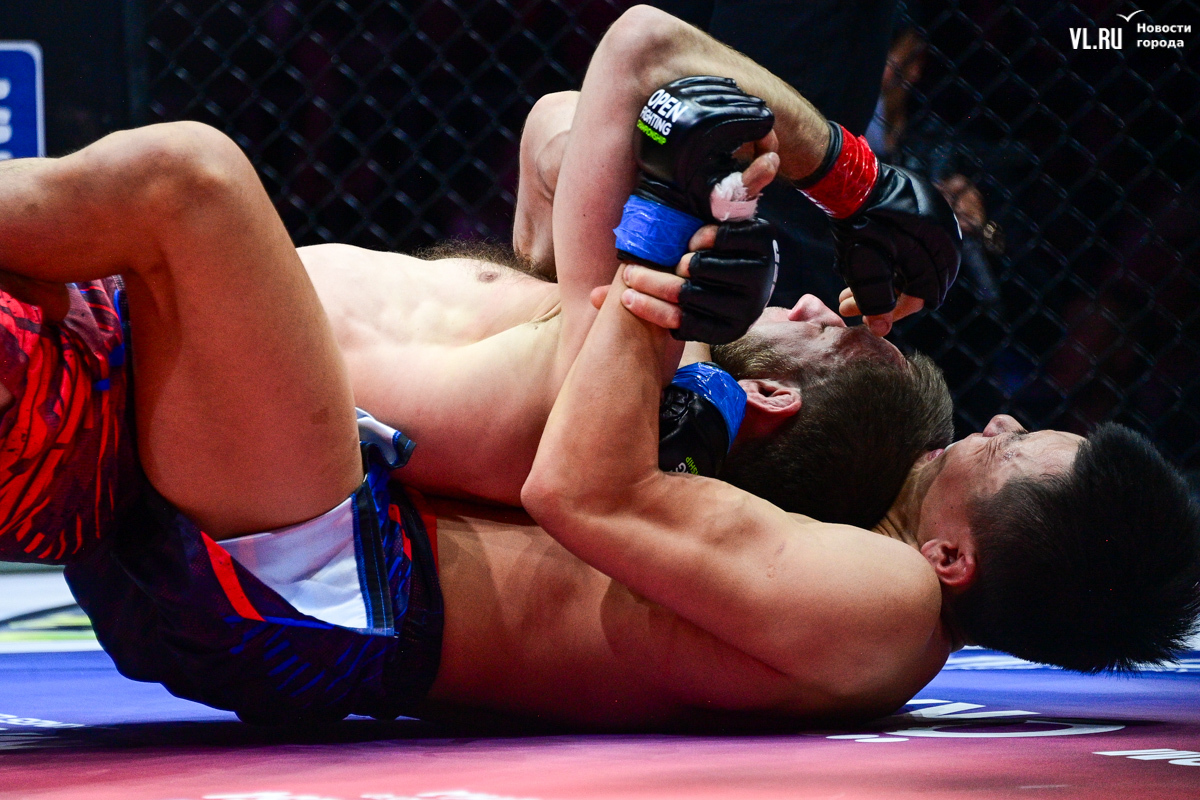 Первыми на ринг вышли спортсмены Сергей Проскуряков из Благовещенска и Андрей Амельченко из Спасска-Дальнего. Их бой был недолгим. После нескольких попыток атаковать друг друга спортсмен из Приамурья взял своего оппонента на удушающий и выиграл бой. Остановили таймер на 45-й секунде поединка.
