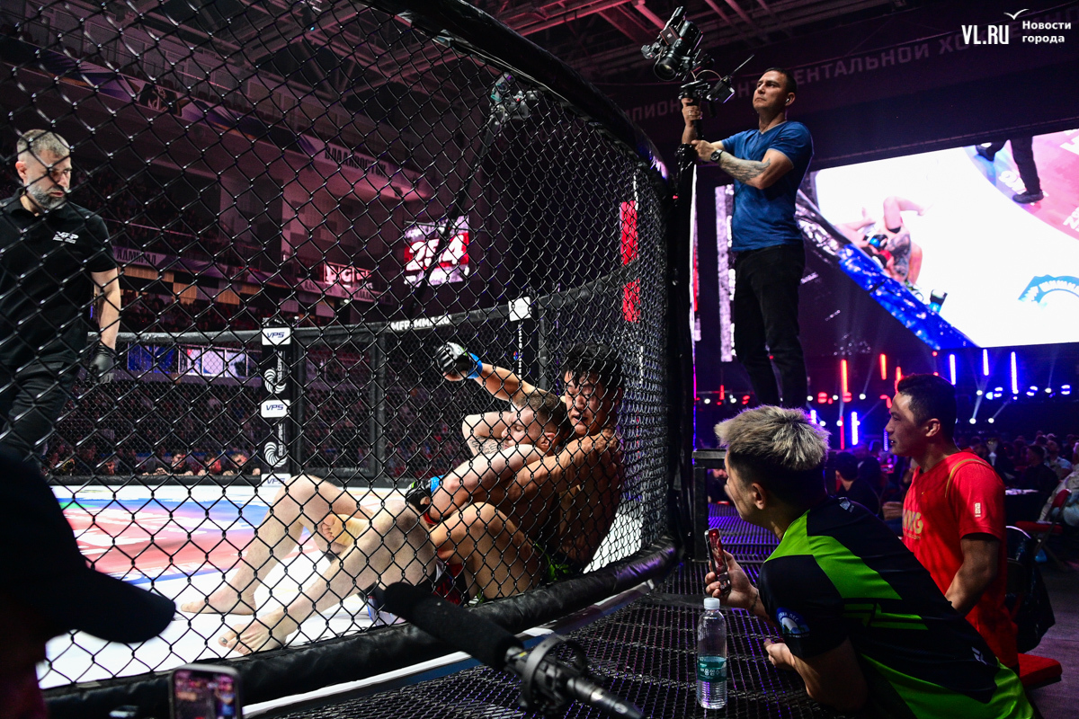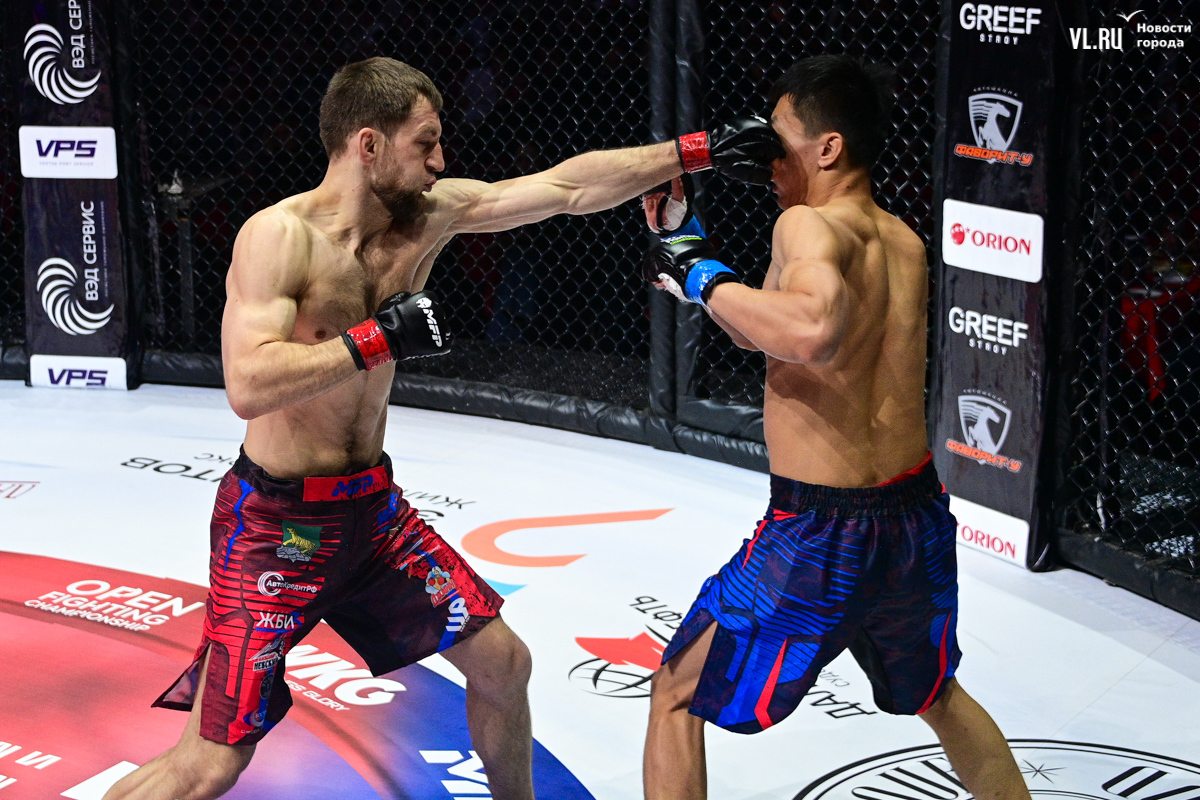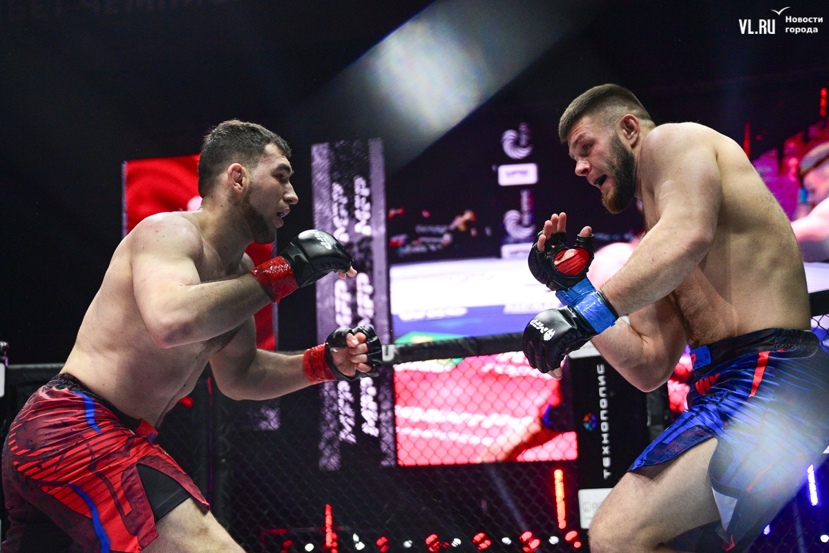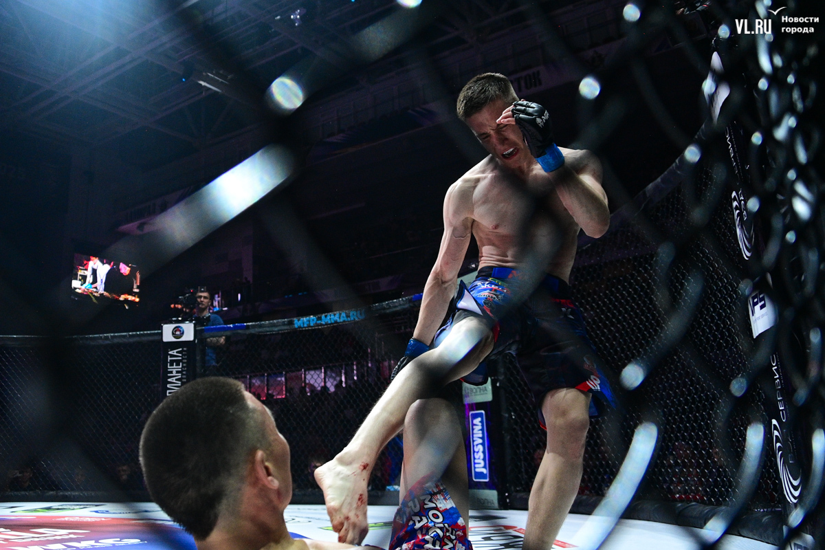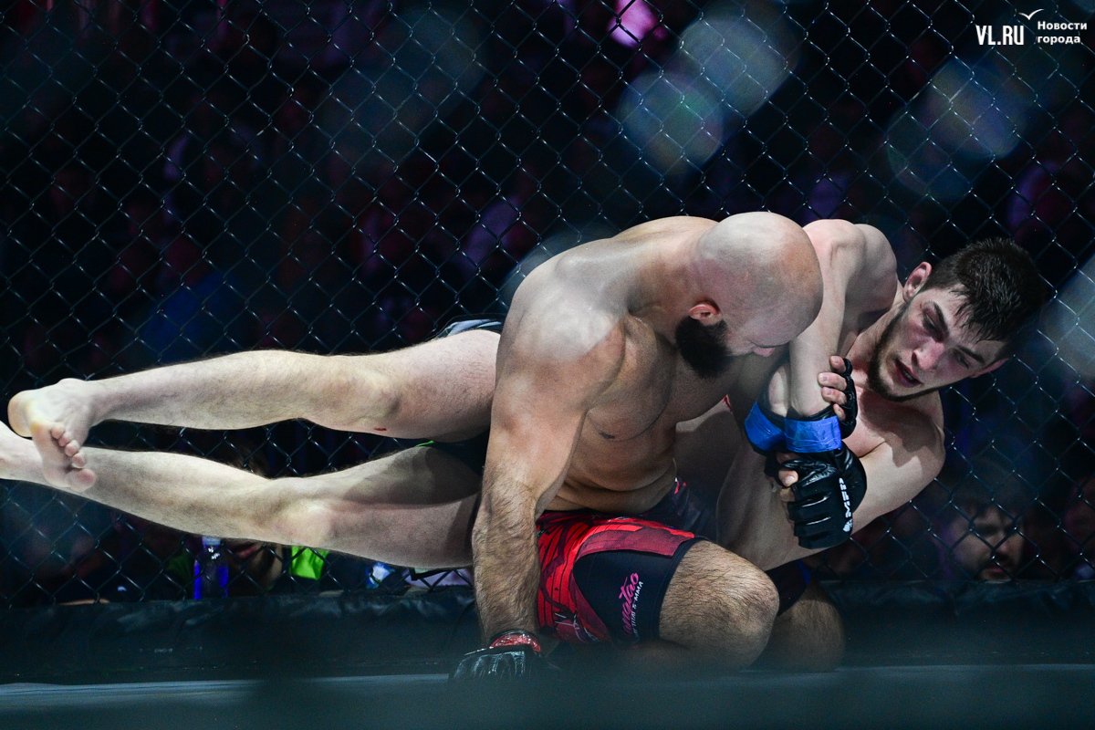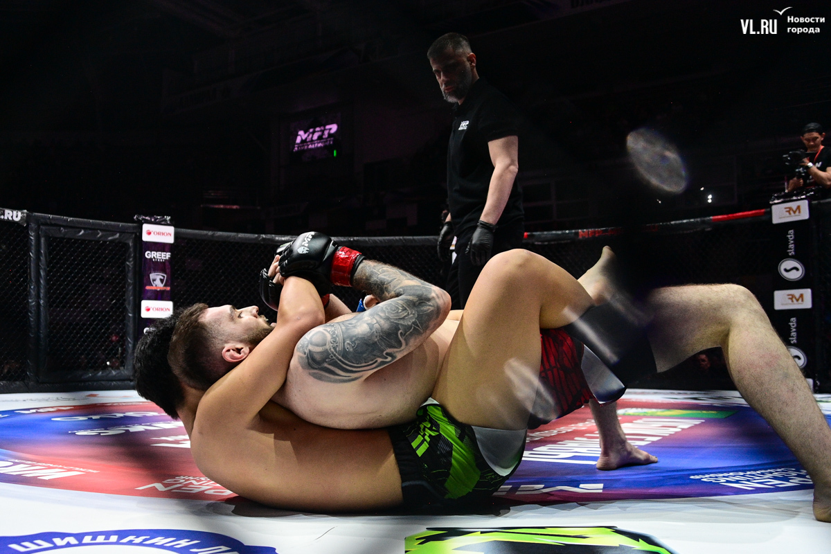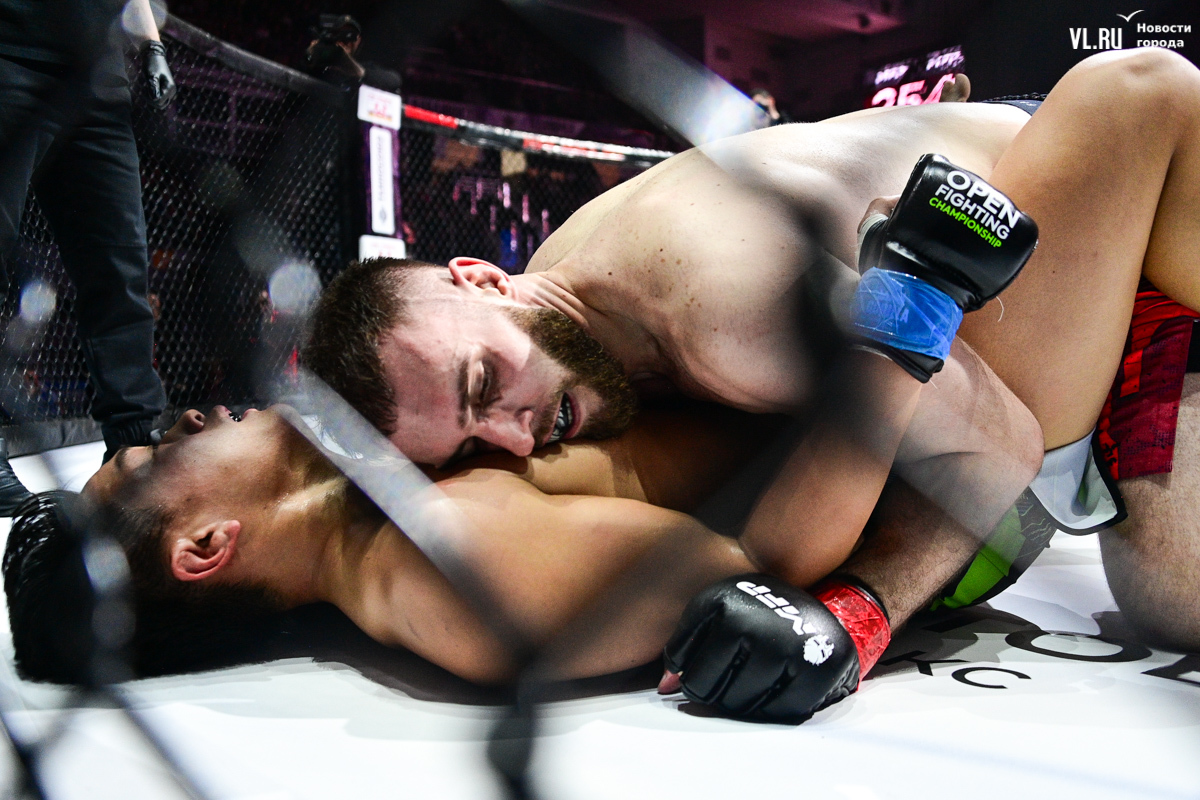 Первыми на ринг вышли спортсмены Сергей Проскуряков из Благовещенска и Андрей Амельченко из Спасска-Дальнего. Их бой был недолгим. После нескольких попыток атаковать друг друга спортсмен из Приамурья взял своего оппонента на удушающий и выиграл бой. Остановили таймер на 45-й секунде поединка.