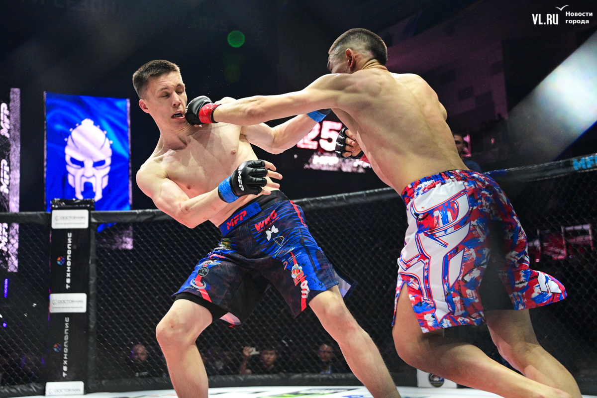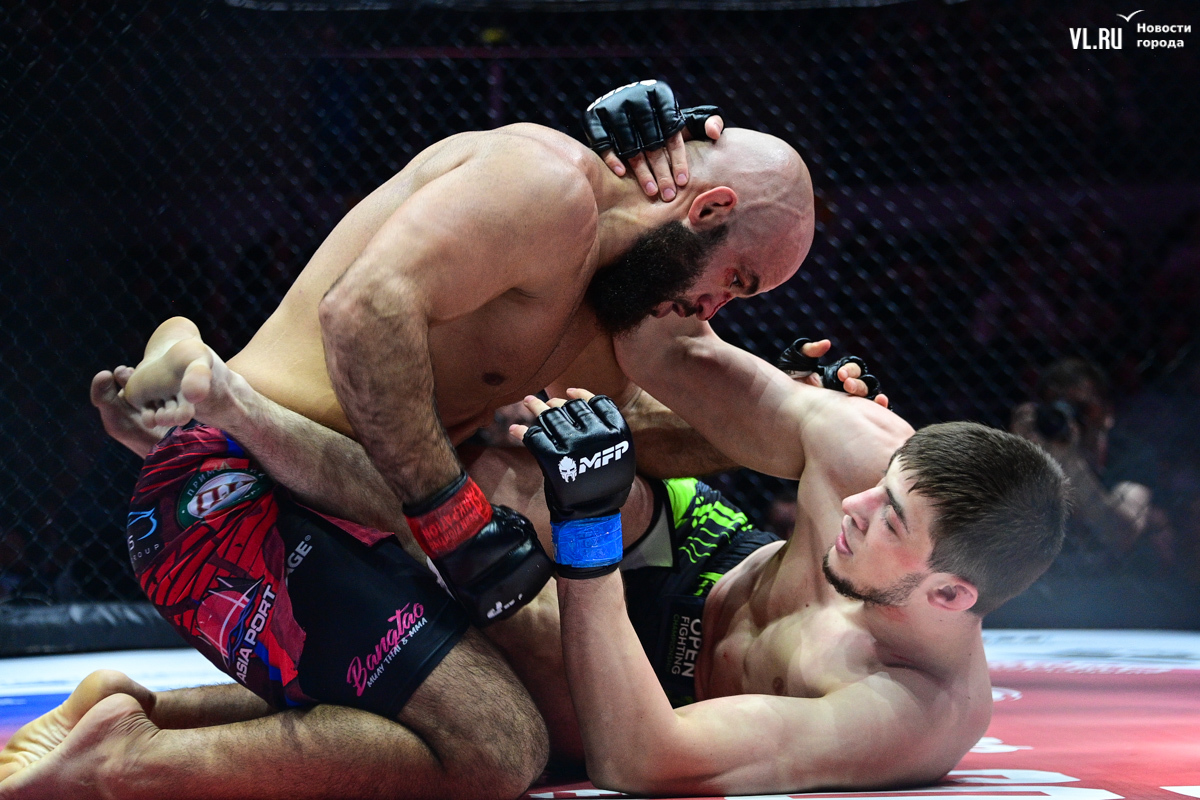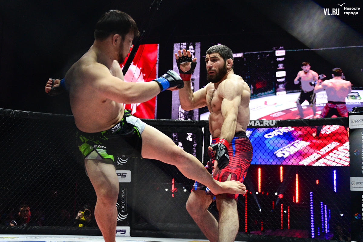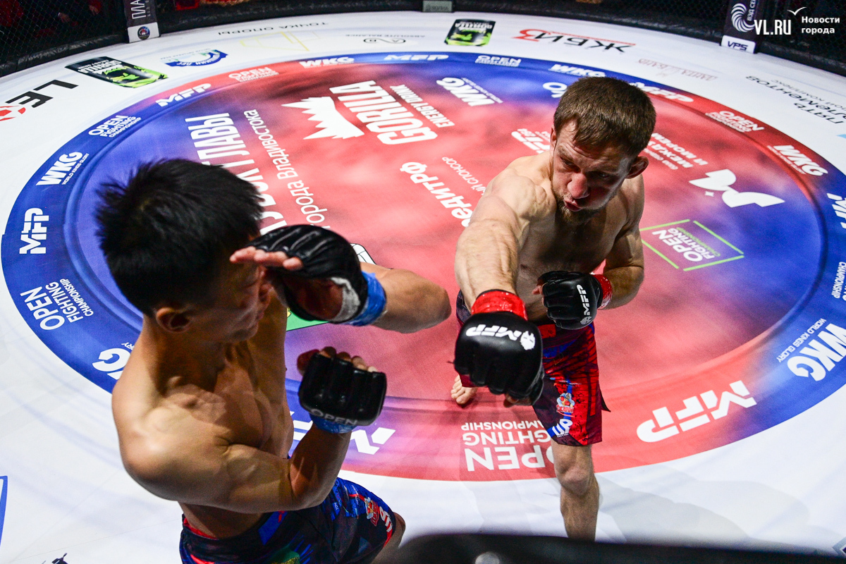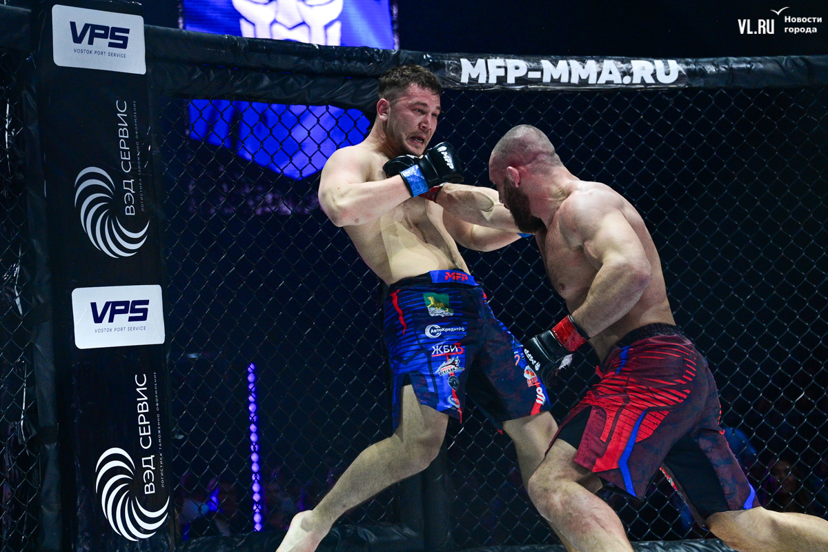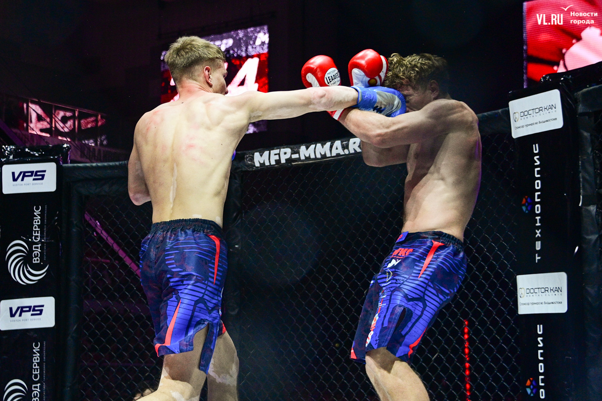 Первыми на ринг вышли спортсмены Сергей Проскуряков из Благовещенска и Андрей Амельченко из Спасска-Дальнего. Их бой был недолгим. После нескольких попыток атаковать друг друга спортсмен из Приамурья взял своего оппонента на удушающий и выиграл бой. Остановили таймер на 45-й секунде поединка.
